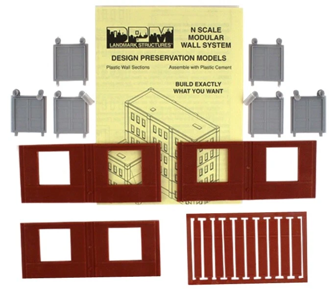 DPM-60105 3 Dock Level Wall w/Freight Doors "Modular system Building Kit" The N scale plastic modular system offers unlimited building options. Interchangeable wall sections make it easy to build a structure of any size, shape and height. Assemble with plastic model cement or solvent. Includes: 3 Walls 6 Freight Doors 10 Pilasters Instructions Measures 3-3/8" Wide x 1-13/32" High This kit is not painted! You are Buying Only what is listed! Comes New in Factory Package! Manufacturer: Design Preservation Models Sign up for my email newsletters by adding my E-Bay Store to your Favorites Check out more items in my store! Papa's Train Depot
