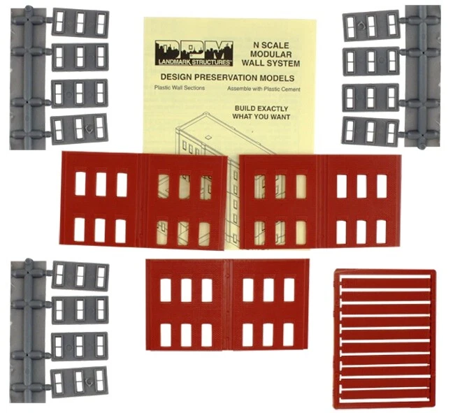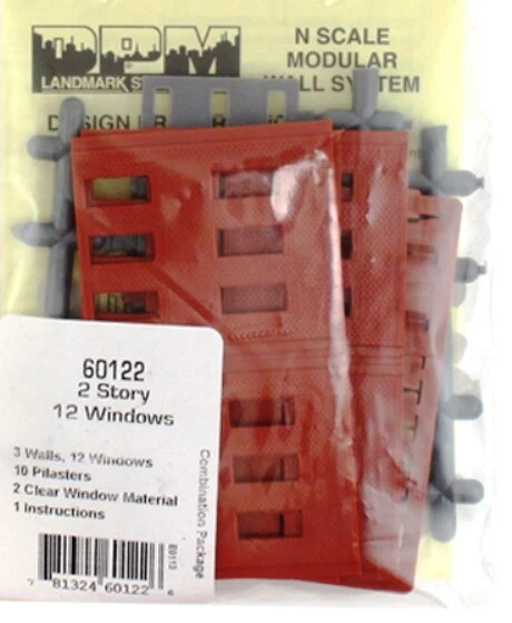 DPM-60122 3 Two Story Walls w/12 Windows "modular system Building Kit" The N scale plastic modular system offers unlimited building options. Interchangeable wall sections make it easy to build a structure of any size, shape and height. Assemble with plastic model cement or solvent. Includes: 3 Walls 12 Windows 10 Pilasters 2 Clear Window Materials Instructions Measures 3-3/8" Wide x 1-15/16" High This kit is not painted! You are Buying Only what is listed! Comes New in Factory Package! Manufacturer: Design Preservation Models Sign up for my email newsletters by adding my E-Bay Store to your Favorites Check out more items in my store! Papa's Train Depot