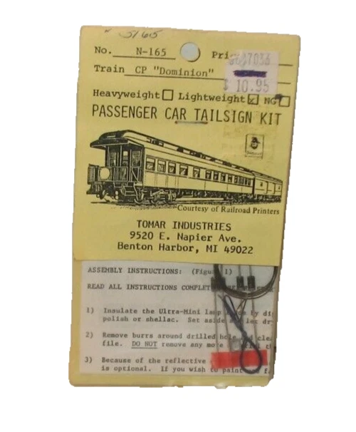 The N Scale Tomar Industries CP "Dominion" Passenger Car Tailsign Kit N-165 is a pre-built passenger car tailsign kit designed for model railroads. Made by Tomar Industries in the United States, this kit is suitable for hobbyists and collectors aged 17 years and up. The kit features the "CP Dominion" design, perfect for enhancing the authenticity and detail of N scale model trains. Fits all passenger cars, Provide constant lighting, Works on 3 to 15 volts AC or DC. Please look at pictures as they are part of description....Any questions please ask.
