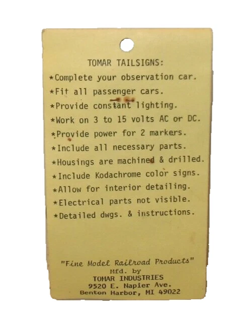 Brand: Tomar Industries gtin13: does not apply Type: Passenger Car Tailsign Kit Assembly Status: Ready to Go/Pre-built Gauge: N UPC: does not apply Age Level: 17 Years & Up Scale: N Country/Region of Manufacture: United States