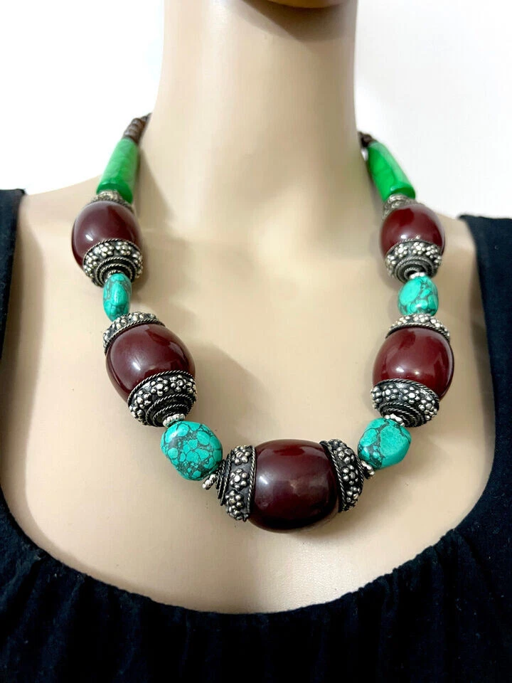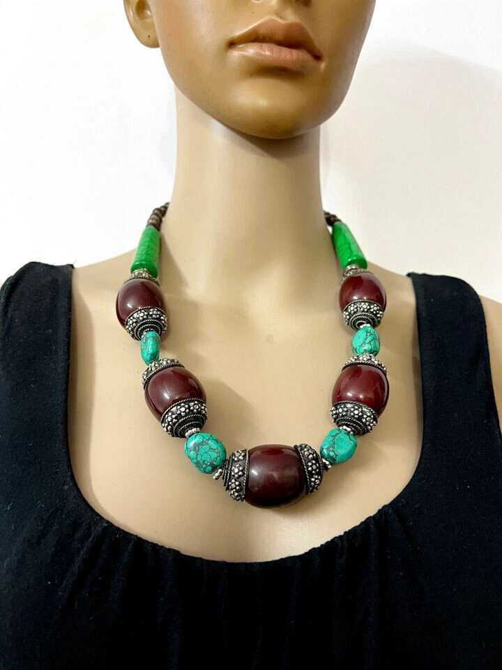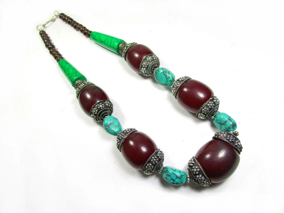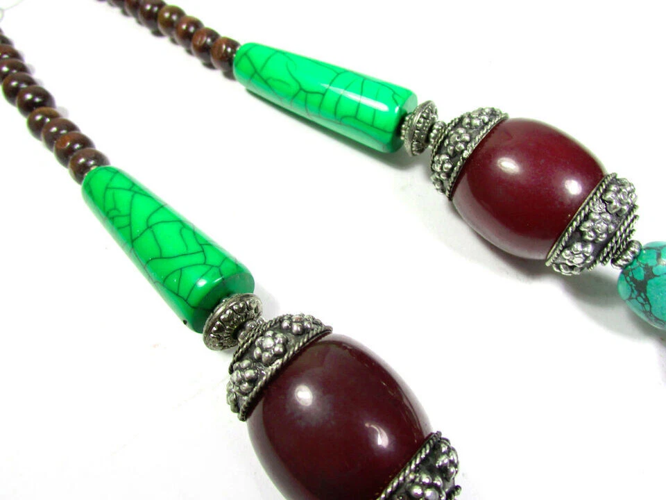 USPS No long wait Product SHIPPED FROM the USA Just 5 to 6 days delivery time at a competitive price. Love the item but not the price? Make me an offer. No reasonable offer refused. Resin Bead Necklace This is a lovely ethnic Tibetan maroon , turquoise, green color resin Necklace from India. The small size brown color beads are made of Wood. You can wear it as an ethnic tribal piece or use it as a belly dancing jewelry. Very well made (Brand new) . Size :- Approx. Necklace is about 2 4.4 " Long (end to end) The Maroon color beads are about 1.8" Wide with silver tone cap Material :- Wood, Resin . Metal :- Mixed Metals Weight :- 1 50 Grams Approx. Type :- Fish Hook Qty :- 1 pc. (N5164/JFA-SHP/B) R USA 7/10/2024 Sec B FOR WHOLESALE CONTACT US Care instructions: To maintain the beauty and integrity of this handmade glass bead necklace: Avoid exposing it to harsh chemicals or extreme temperatures Store it in a cool, dry place when not worn Avoid twisting or bending the cord or chain excessively Clean with a soft cloth and mild soap solution if needed Buying handmade products comes with a range of benefits that can be quite compelling. Environmentally Friendly : Handmade items generally have a lower environmental impact compared to mass-produced goods. They often require fewer resources and less energy to create. Additionally, small-scale production usually involves less waste and fewer pollutants. Better for the Economy : Purchasing handmade products supports local artisans and small businesses. This not only helps create jobs but also keeps money within the community, which can contribute to a more robust local economy. Purchases You Can Feel Good About : Buying handmade can give you a sense of satisfaction knowing that your purchase supports individual creators and ethical practices. It often involves fair trade practices and contributes to sustainable economic development. You Will Feel the Human Touch : Handmade items often carry a unique personal touch that mass-produced items lack. The craftsmanship and attention to detail in handmade products reflect the skill and passion of the maker, making each piece distinct and special. Value Over Time : Handmade products, particularly those that are well-crafted, can appreciate in value over time. For example, antiques or heirloom-quality items often gain sentimental and monetary value as they age, making them potentially valuable investments. Overall, choosing handmade products can lead to a more thoughtful, sustainable, and rewarding shopping experience.