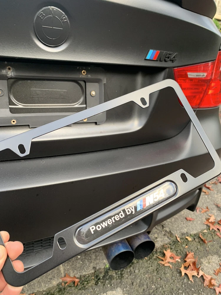 N54 License Plate Frame N54 License Plate Frame is made of stainless steel and feature a domed full color (Powered By N54 nameplate). All license plate frames come complete with matching hardware hider caps. LIMITED TIME: FREE AIR FRESHNER AND TIRE VALVES WITH THE FRAME PURCHASE . Sales Terms & Return Policy We will accept return within 14 days. Please notify us within 14 days after your purchase. Please contact us for RMA number before sending the item back. All item send back with out authorization will not be processed. Buyer pays for all return shipping fees . Parts have to be unused and unopened.