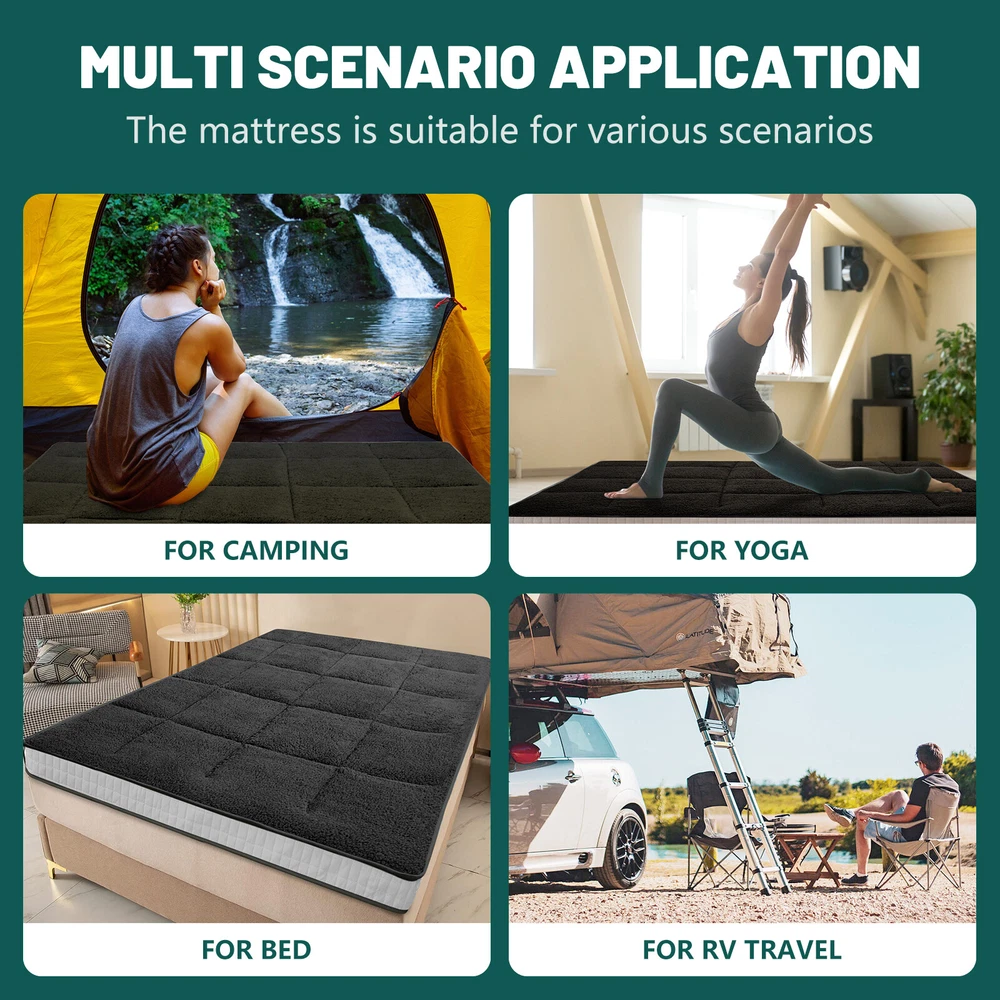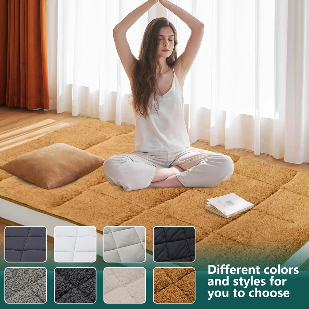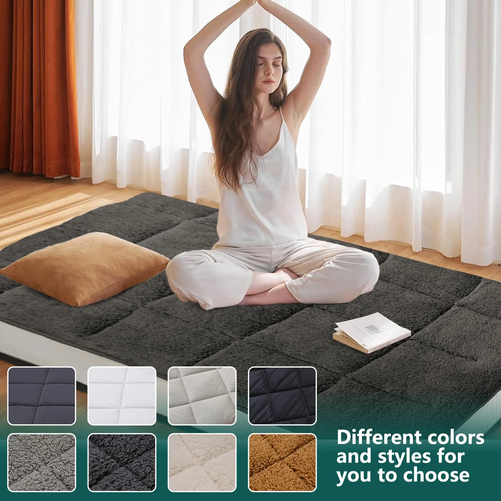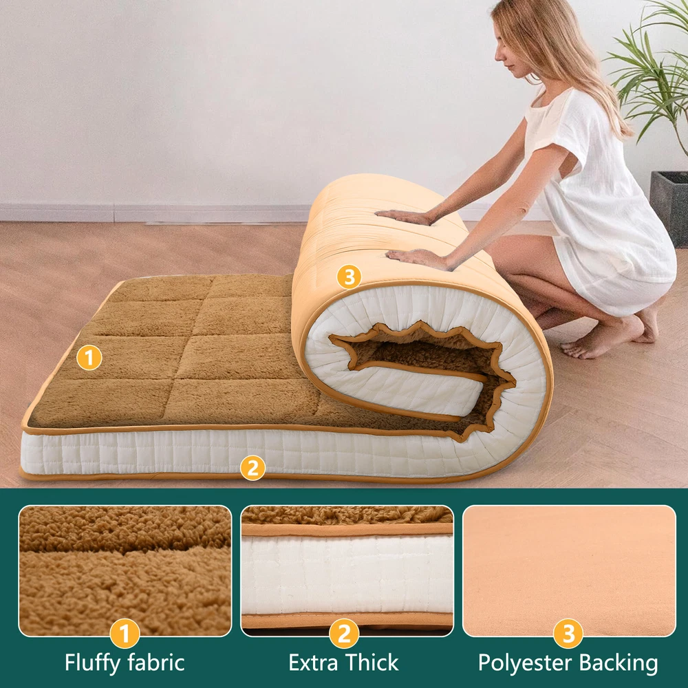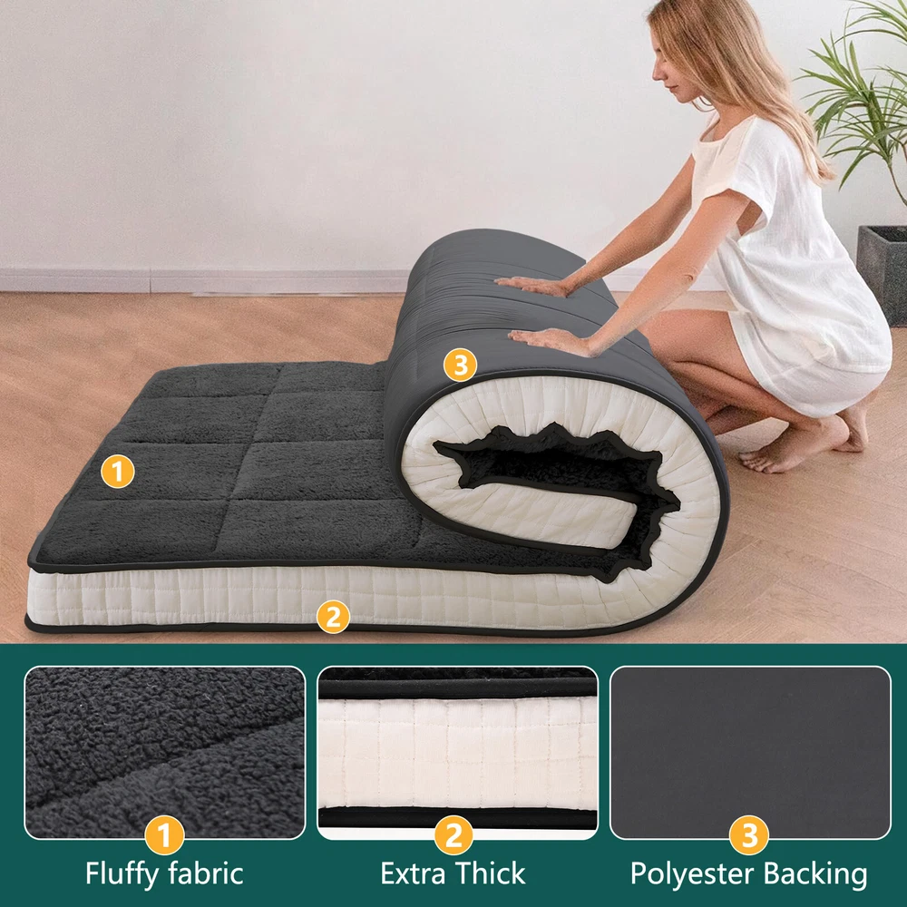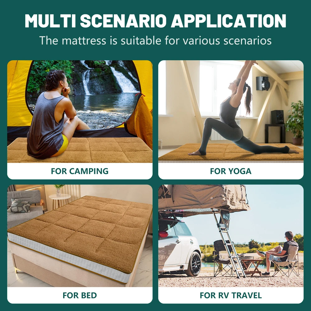 Japanese Floor Mattress for Adults, 4" Thick Sherpa Fleece Futon Mattress. It has Sherpa Fleece on the Front, Polyester on the Back. The reversible design makes it suitable for all seasons. It has 3 size : Twin: 80"L x 39"W x 4"Th; Full: 80"L x 54"W x 4"Th; Queen: 80"L x 60"W x 4"Th. Come with 1 pair of bandage, 1 storage bag, for better storage and carrying, The foldable tatami floor mattress allows you to get a comfortable sleep wherever you go. This Japanese mattress is traditionally rolled up to free up some space in the room during the day when not needed and easy to travel or store. This floor mattress is an ideal floor bed choice for guest room, hotel, dormitory, hospital, travel and your guest. It can be used as floor mattress, camping mat, bedroom futon, living room futon, floor lounger, tatami mat, sleeping floor mat, guest bed, Japanese bed mat, also can be kids play mat, floor pillow. Universal for all seasons : Sherpa Fleece on the Front, Polyester on the Back . The reversible design makes it usable for adults (sleeping) and kids (sleeping/playing), one side is warm fluffy polyester fabric, which is suitable for winter; the other side is polyester fabric, suitable for summer. Specially quilted to provide extra sleeping hours by providing exquisite comfort and temperature control throughout the sleep cycle. Futon Mattress Size : Twin: 80"L x 39"W x 4"Th; Full: 80"L x 54"W x 4"Th; Queen: 80"L x 60"W x 4"Th . With 2 bandage allowing it easy transport from one place to another is just one feature. The futon mattress adopts double layer tape edge runs along the edges of the mattress surface, protecting against edge break-down. High side edge reinforces the support along the outer edges of the mattress. Multiple Materials Filling : The secret of Soft but Supportive was this: Five-layer Construction: wool-like fleece surface + microfiber fill + memory foam + microfiber fill + wool-like fleece surface. The surface was premium high thread count wool-like fabrics; The second layer is softness layer, 550GSM whole piece microfiber fill; The core layer is support layer, 4 inches memory foam. Five-layer Construction make up the special soft and supportive futon mattress. Easy to Store and Carry : Come with 1 pair of bandage, 1 storage bag, for better storage and carrying, The foldable tatami floor mattress allows you to get a comfortable sleep wherever you go. Perfect for small apartments and tight spaces, effectively save living space and move easily. You can easily fold it and put in the included storage bag when you don't need it. Easy to travel or store keep it in your closet or other storage location. Roll up Mattress : This Japanese mattress is traditionally rolled up to free up some space in the room during the day when not needed and easy to travel or store. This floor mattress is an ideal floor bed choice for guest room, hotel, dormitory, hospital, travel and your guest. It can be used as floor mattress, camping mat, bedroom futon, living room futon, floor lounger, tatami mat, sleeping floor mat, guest bed, Japanese bed mat, also can be kids play mat, floor pillow. Kind Notice : Since the mattress is packed carefully for transportation, opening it the first time requires a little care. Once it is taken out of the box, it is to be patted gently and kept under the sun so it regains its original shape after 2-3 days. Once you do so, it is ready to use. However, it can be wiped cleaned with a wet cloth if required. REMEMEBER: Don’t submerse it in water. PREMIUM MATERIAL- Our Japanese Floor Mattress has a five-layer design that is skin-friendly, comfortable, and breathable. The combination of memory foam and extra padding filled in the mattress is not only soft, but also provides good support for your body, relieving stress and making you feel relaxed and comfortable. DUAL USE DESIGN MATTRESS- Futton Mattress with warm, fluffy fabric on one side is ideal for winter use; The other side is polyester fabric, suitable for summer use. Two different fabrics for year-round use! The mattress pad can be used indoors and outdoors, it could be used as a bedroom futon, tatami mat, sleeping floor mat, children's play mat, also could be guest mattress bed or camping tent mattress. WIDE RANGE of USES - Floor mattress can be used as a futon in the bedroom, yoga mat, pet bed, tatami mat, kids' play mat, sleeping floor mat, tent mat, living room futon, or guest mattress bed. It is excellent for both adults and children. You may take it with you everywhere you go in your car; FINE WORKMANSHIP - The pattern is made very delicately and thoroughly but with strong, firm thread. The borders of the mattress are hemmed to make it more structured and intact. The floor mattress has three sizes: Twin/Full/Queen, meeting your different needs;