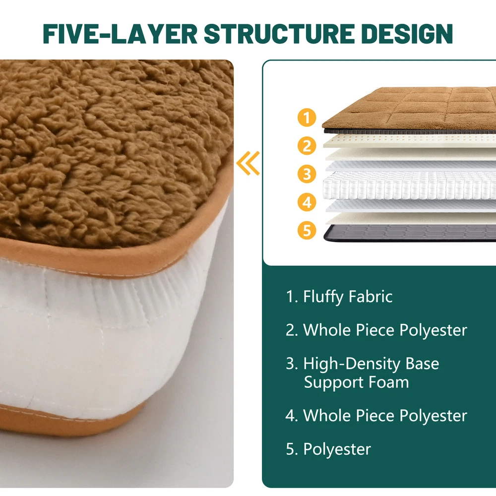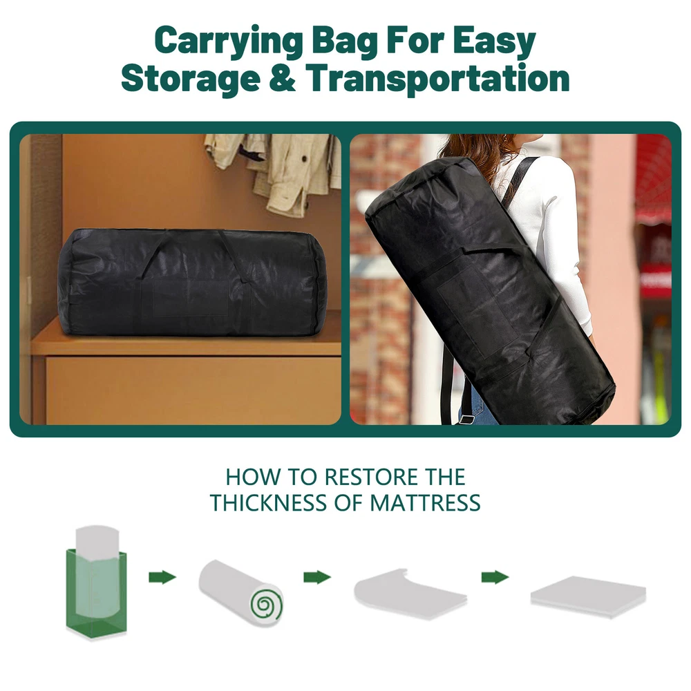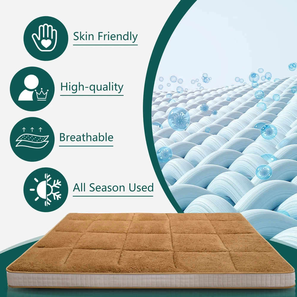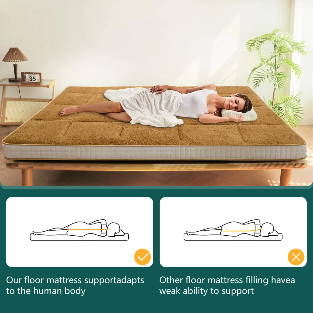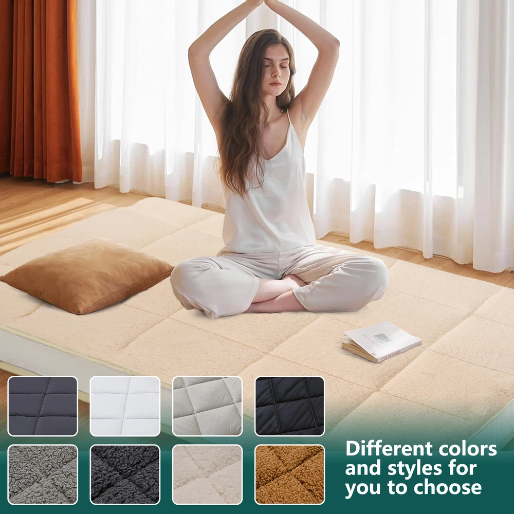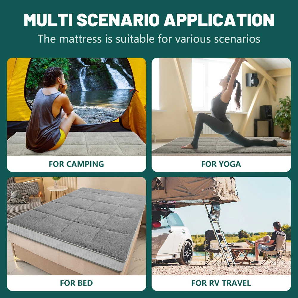Japanese Floor Mattress for Adults, 4" Thick Sherpa Fleece Futon Mattress. It has Sherpa Fleece on the Front, Polyester on the Back. The reversible design makes it suitable for all seasons. It has 3 size : Twin: 80"L x 39"W x 4"Th; Full: 80"L x 54"W x 4"Th; Queen: 80"L x 60"W x 4"Th. Come with 1 pair of bandage, 1 storage bag, for better storage and carrying, The foldable tatami floor mattress allows you to get a comfortable sleep wherever you go. This Japanese mattress is traditionally rolled up to free up some space in the room during the day when not needed and easy to travel or store. This floor mattress is an ideal floor bed choice for guest room, hotel, dormitory, hospital, travel and your guest. It can be used as floor mattress, camping mat, bedroom futon, living room futon, floor lounger, tatami mat, sleeping floor mat, guest bed, Japanese bed mat, also can be kids play mat, floor pillow. Universal for all seasons : Sherpa Fleece on the Front, Polyester on the Back . The reversible design makes it usable for adults (sleeping) and kids (sleeping/playing), one side is warm fluffy polyester fabric, which is suitable for winter; the other side is polyester fabric, suitable for summer. Specially quilted to provide extra sleeping hours by providing exquisite comfort and temperature control throughout the sleep cycle. Futon Mattress Size : Twin: 80"L x 39"W x 4"Th; Full: 80"L x 54"W x 4"Th; Queen: 80"L x 60"W x 4"Th . With 2 bandage allowing it easy transport from one place to another is just one feature. The futon mattress adopts double layer tape edge runs along the edges of the mattress surface, protecting against edge break-down. High side edge reinforces the support along the outer edges of the mattress. Multiple Materials Filling : The secret of Soft but Supportive was this: Five-layer Construction: wool-like fleece surface + microfiber fill + memory foam + microfiber fill + wool-like fleece surface. The surface was premium high thread count wool-like fabrics; The second layer is softness layer, 550GSM whole piece microfiber fill; The core layer is support layer, 4 inches memory foam. Five-layer Construction make up the special soft and supportive futon mattress. Easy to Store and Carry : Come with 1 pair of bandage, 1 storage bag, for better storage and carrying, The foldable tatami floor mattress allows you to get a comfortable sleep wherever you go. Perfect for small apartments and tight spaces, effectively save living space and move easily. You can easily fold it and put in the included storage bag when you don't need it. Easy to travel or store keep it in your closet or other storage location. Roll up Mattress : This Japanese mattress is traditionally rolled up to free up some space in the room during the day when not needed and easy to travel or store. This floor mattress is an ideal floor bed choice for guest room, hotel, dormitory, hospital, travel and your guest. It can be used as floor mattress, camping mat, bedroom futon, living room futon, floor lounger, tatami mat, sleeping floor mat, guest bed, Japanese bed mat, also can be kids play mat, floor pillow. Kind Notice : Since the mattress is packed carefully for transportation, opening it the first time requires a little care. Once it is taken out of the box, it is to be patted gently and kept under the sun so it regains its original shape after 2-3 days. Once you do so, it is ready to use. However, it can be wiped cleaned with a wet cloth if required. REMEMEBER: Don’t submerse it in water. PREMIUM MATERIAL- Our Japanese Floor Mattress has a five-layer design that is skin-friendly, comfortable, and breathable. The combination of memory foam and extra padding filled in the mattress is not only soft, but also provides good support for your body, relieving stress and making you feel relaxed and comfortable. DUAL USE DESIGN MATTRESS- Futton Mattress with warm, fluffy fabric on one side is ideal for winter use; The other side is polyester fabric, suitable for summer use. Two different fabrics for year-round use! The mattress pad can be used indoors and outdoors, it could be used as a bedroom futon, tatami mat, sleeping floor mat, children's play mat, also could be guest mattress bed or camping tent mattress. WIDE RANGE of USES - Floor mattress can be used as a futon in the bedroom, yoga mat, pet bed, tatami mat, kids' play mat, sleeping floor mat, tent mat, living room futon, or guest mattress bed. It is excellent for both adults and children. You may take it with you everywhere you go in your car; FINE WORKMANSHIP - The pattern is made very delicately and thoroughly but with strong, firm thread. The borders of the mattress are hemmed to make it more structured and intact. The floor mattress has three sizes: Twin/Full/Queen, meeting your different needs;