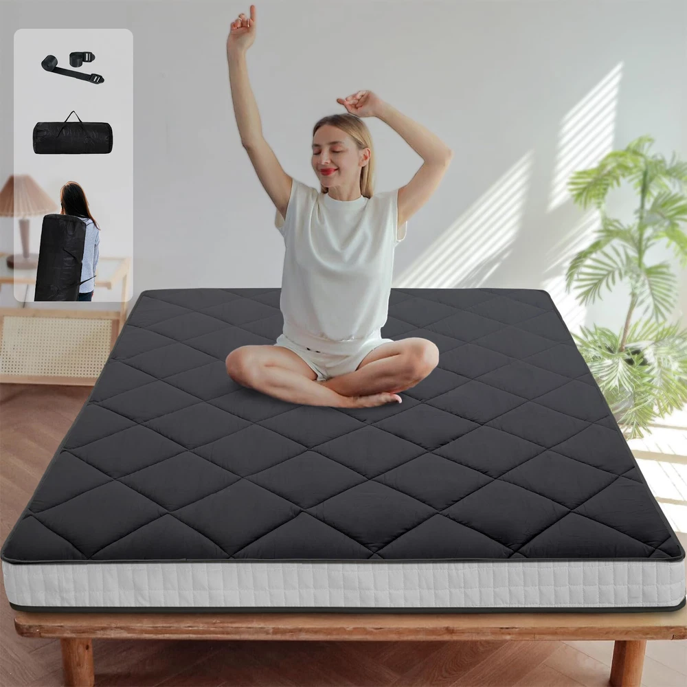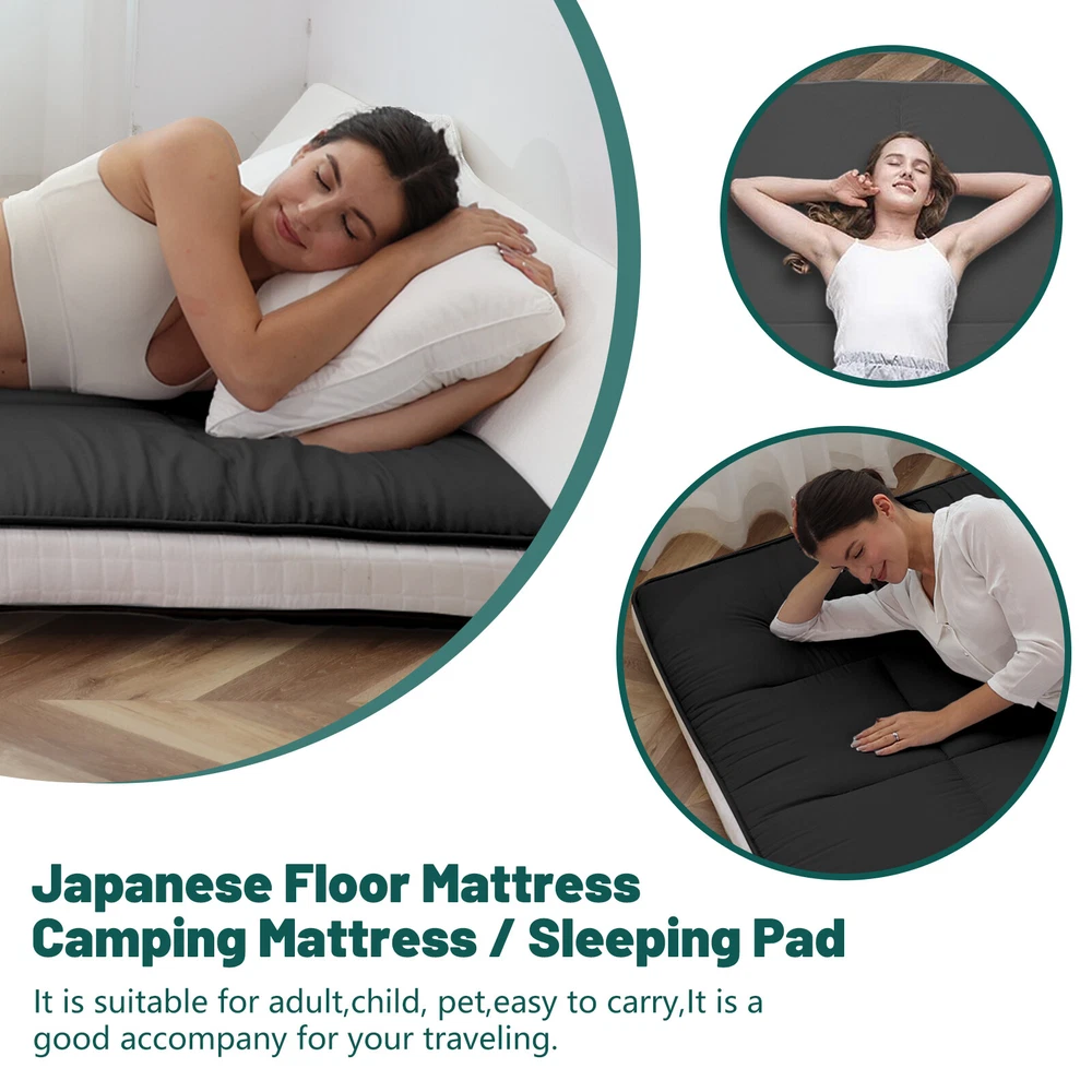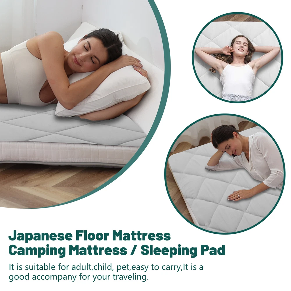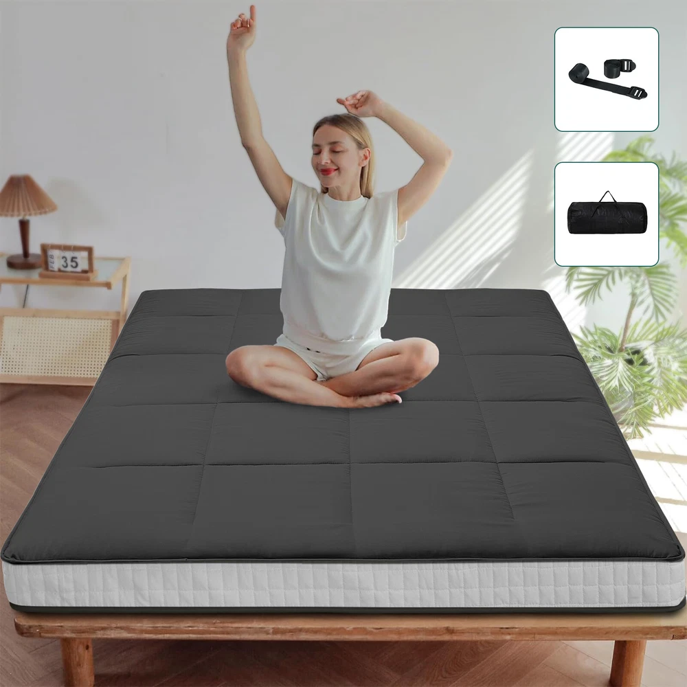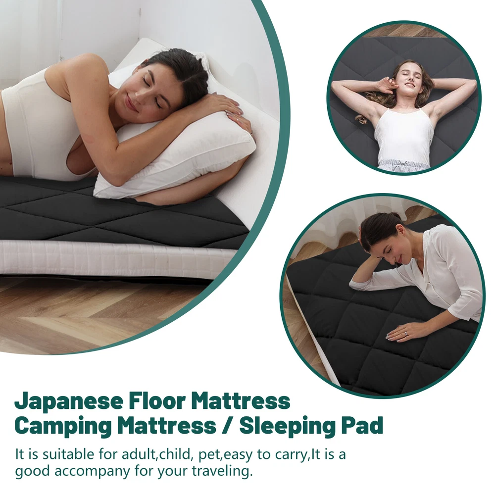 ( Black or Gray color) The futon, Japanese traditional style bedding, is a type of Japanese mattress used on the floor at night for sleeping. This Japanese bed is traditionally rolled up during the day when not needed to free up some space in the room. About this item [Japanese floor mattress] The futon, Japanese traditional style bedding, is a type of Japanese mattress used on the floor at night for sleeping. This Japanese bed is traditionally rolled up during the day when not needed to free up some space in the room. Fabric: 100% Cotton / Stuffing: 100% Polyester and Polyurethane. When it comes to futon, Japanese style futon are the most popular Japanese bed. Originating in Japan, this soft, rollable Japanese mattress can easily set up on the tatami mats on the floor to provide an airy yet firm support. [5-Layer Futon Mattress] These five-layer futons disperse pressure on the body making for comfortable sleep even if have back pain. [Japanese traditional style bedding] Use a tatami mat with the futon to adjust moisture and you will feel cool and refreshed even on a hot summer night. Use them on the floor on a bedframe or store them in the closet in case you have a guest. These versatile futons ensure a good night's sleep. This Futon mattress is delivered compressed in a vacuum bag. After opening the vacuum bag, the Futon mattress will gain air and return to its original thickness. Wrinkles may be present on the Futon but this is not a defect, please air for a few hours. On a dry, sunny day, dry the Futon on both sides for about two hours each. The Futon will gain air, becoming fluffy and soft. [Cautions for use] To prevent the Futon getting damaged, please use covers or sheets. Make sure to wash the covers and sheets frequently. The Futon should be dried in the sunshine, or in a Futon dryer. With sunshine and heat, it will become more resilient, warm and fluffy. Lightly beat the futon occasionally to remove dust. [ Size Weight and color ] Twin Size: 4" thick x 39" wide x 80" long, Weight: 10 lbs, Full Size: 4" thick x 54" wide x 80" long, Weight: 14 lbs ; Queen Size: 4" thick x 60" wide x 80" long, Weight: 16.65 lbs Color : Gray or Black Package Included: ▶ 1 futon mattress ▶ 1 same color mattress dustproof cover ▶ 1 pair of bandage ▶ 1 storage bag Feaches A unique, minimalist approach to sleeping The Futon is originating in Japan, this soft, rollable Japanese mattress can easily be set up on the tatami mats on the floor to provide airy yet firm support. 5-Layer Futon Mattress These five-layer futons disperse pressure on the body making for comfortable sleep even if have back pain. Inside "Made in Japan" "MADE IN JAPAN" stands for the world-class manufacturing and factories behind the exceptional quality of our futons. A P A Comfortable and Supportive - This mattress is fluffy but also supportive because of the 5-layer structure(microfiber fabric, polyester filling, memory foam, polyester filling and microfiber fabric). Soft and breathable microfiber fabric makes it more comfortable. Perfect Quilting - Our square and triangle quilting help make the filling evenly. The mattress will fit your body better and provide a golden sleep. Easy to Use, Store, and Clean - Comes with bandages, a storage bag, and a mattress cover. Help you pack the mattress for easy transportation or storage in a closet or other areas. When necessary, simply remove the dust cover to wash in the washing machine. Suitable for multiple scenarios - A sleeping mattress or topper on your bed, a Japanese futon mattress in your bedroom, a yoga mat, a camping mattress outside, a temporary bed for guests or a play mat for your children, etc,. Ideal for both children and adults.