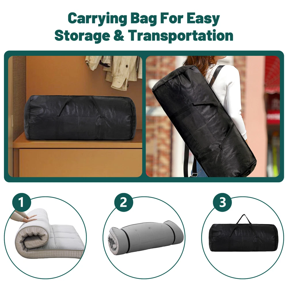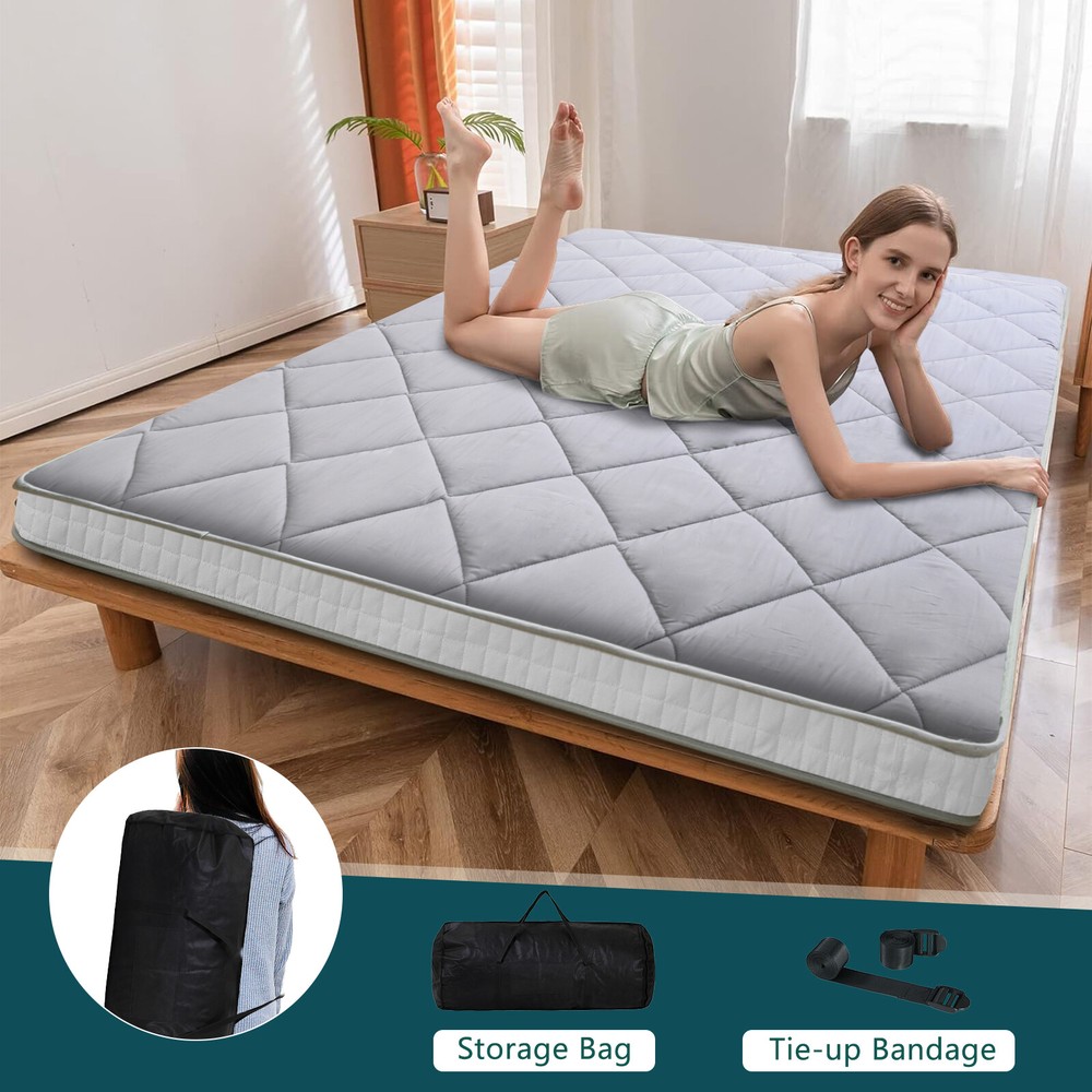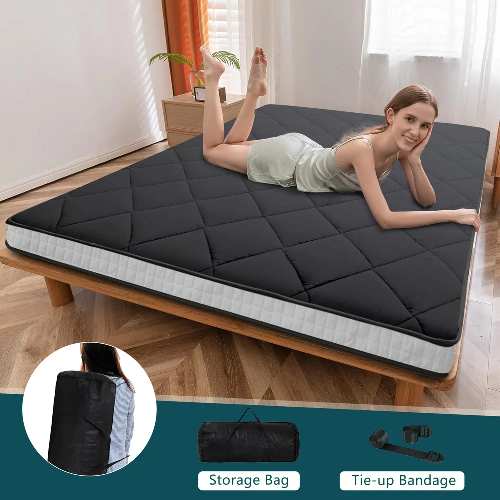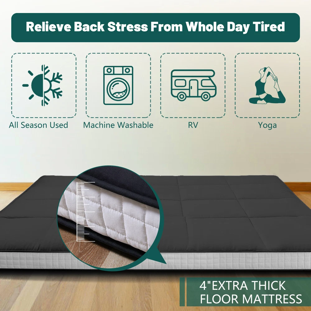 ( Black or Gray color) The futon, Japanese traditional style bedding, is a type of Japanese mattress used on the floor at night for sleeping. This Japanese bed is traditionally rolled up during the day when not needed to free up some space in the room. About this item [Japanese floor mattress] The futon, Japanese traditional style bedding, is a type of Japanese mattress used on the floor at night for sleeping. This Japanese bed is traditionally rolled up during the day when not needed to free up some space in the room. Fabric: 100% Cotton / Stuffing: 100% Polyester and Polyurethane. When it comes to futon, Japanese style futon are the most popular Japanese bed. Originating in Japan, this soft, rollable Japanese mattress can easily set up on the tatami mats on the floor to provide an airy yet firm support. [5-Layer Futon Mattress] These five-layer futons disperse pressure on the body making for comfortable sleep even if have back pain. [Japanese traditional style bedding] Use a tatami mat with the futon to adjust moisture and you will feel cool and refreshed even on a hot summer night. Use them on the floor on a bedframe or store them in the closet in case you have a guest. These versatile futons ensure a good night's sleep. This Futon mattress is delivered compressed in a vacuum bag. After opening the vacuum bag, the Futon mattress will gain air and return to its original thickness. Wrinkles may be present on the Futon but this is not a defect, please air for a few hours. On a dry, sunny day, dry the Futon on both sides for about two hours each. The Futon will gain air, becoming fluffy and soft. [Cautions for use] To prevent the Futon getting damaged, please use covers or sheets. Make sure to wash the covers and sheets frequently. The Futon should be dried in the sunshine, or in a Futon dryer. With sunshine and heat, it will become more resilient, warm and fluffy. Lightly beat the futon occasionally to remove dust. [ Size Weight and color ] Twin Size: 4" thick x 39" wide x 80" long, Weight: 10 lbs, Full Size: 4" thick x 54" wide x 80" long, Weight: 14 lbs ; Queen Size: 4" thick x 60" wide x 80" long, Weight: 16.65 lbs Color : Gray or Black Package Included: ▶ 1 futon mattress ▶ 1 same color mattress dustproof cover ▶ 1 pair of bandage ▶ 1 storage bag Feaches A unique, minimalist approach to sleeping The Futon is originating in Japan, this soft, rollable Japanese mattress can easily be set up on the tatami mats on the floor to provide airy yet firm support. 5-Layer Futon Mattress These five-layer futons disperse pressure on the body making for comfortable sleep even if have back pain. Inside "Made in Japan" "MADE IN JAPAN" stands for the world-class manufacturing and factories behind the exceptional quality of our futons. A P A Comfortable and Supportive - This mattress is fluffy but also supportive because of the 5-layer structure(microfiber fabric, polyester filling, memory foam, polyester filling and microfiber fabric). Soft and breathable microfiber fabric makes it more comfortable. Perfect Quilting - Our square and triangle quilting help make the filling evenly. The mattress will fit your body better and provide a golden sleep. Easy to Use, Store, and Clean - Comes with bandages, a storage bag, and a mattress cover. Help you pack the mattress for easy transportation or storage in a closet or other areas. When necessary, simply remove the dust cover to wash in the washing machine. Suitable for multiple scenarios - A sleeping mattress or topper on your bed, a Japanese futon mattress in your bedroom, a yoga mat, a camping mattress outside, a temporary bed for guests or a play mat for your children, etc,. Ideal for both children and adults.