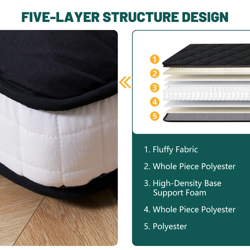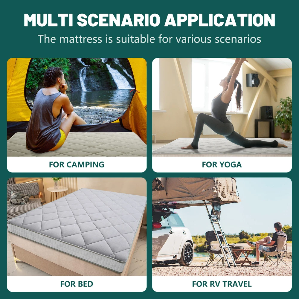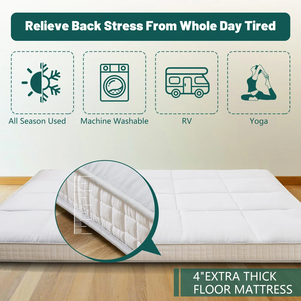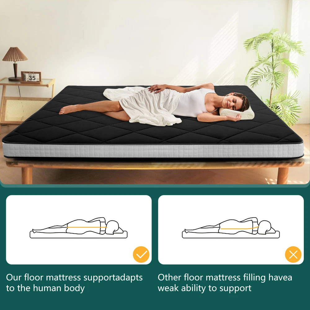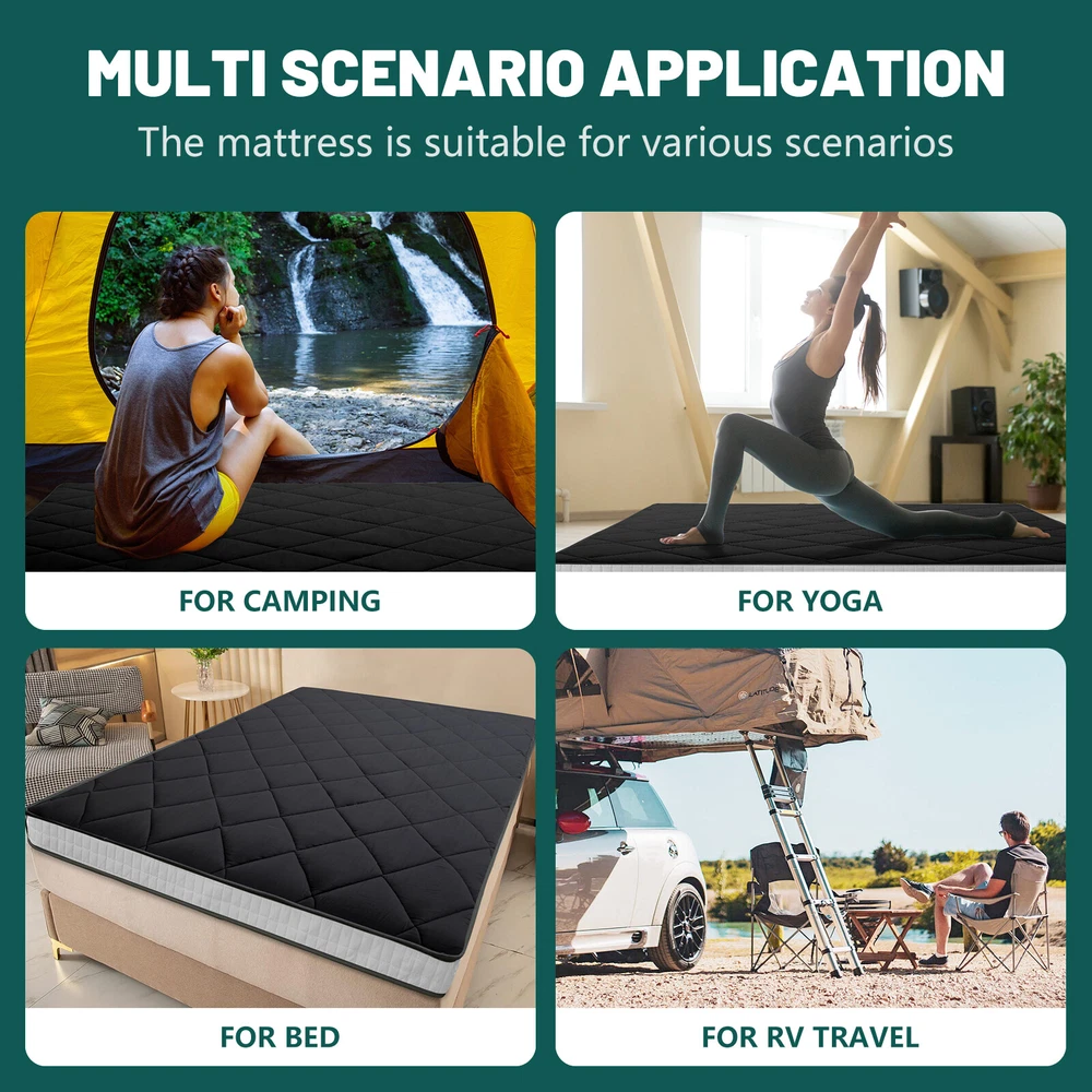 ( Black or Gray color) The futon, Japanese traditional style bedding, is a type of Japanese mattress used on the floor at night for sleeping. This Japanese bed is traditionally rolled up during the day when not needed to free up some space in the room. About this item [Japanese floor mattress] The futon, Japanese traditional style bedding, is a type of Japanese mattress used on the floor at night for sleeping. This Japanese bed is traditionally rolled up during the day when not needed to free up some space in the room. Fabric: 100% Cotton / Stuffing: 100% Polyester and Polyurethane. When it comes to futon, Japanese style futon are the most popular Japanese bed. Originating in Japan, this soft, rollable Japanese mattress can easily set up on the tatami mats on the floor to provide an airy yet firm support. [5-Layer Futon Mattress] These five-layer futons disperse pressure on the body making for comfortable sleep even if have back pain. [Japanese traditional style bedding] Use a tatami mat with the futon to adjust moisture and you will feel cool and refreshed even on a hot summer night. Use them on the floor on a bedframe or store them in the closet in case you have a guest. These versatile futons ensure a good night's sleep. This Futon mattress is delivered compressed in a vacuum bag. After opening the vacuum bag, the Futon mattress will gain air and return to its original thickness. Wrinkles may be present on the Futon but this is not a defect, please air for a few hours. On a dry, sunny day, dry the Futon on both sides for about two hours each. The Futon will gain air, becoming fluffy and soft. [Cautions for use] To prevent the Futon getting damaged, please use covers or sheets. Make sure to wash the covers and sheets frequently. The Futon should be dried in the sunshine, or in a Futon dryer. With sunshine and heat, it will become more resilient, warm and fluffy. Lightly beat the futon occasionally to remove dust. [ Size Weight and color ] Twin Size: 4" thick x 39" wide x 80" long, Weight: 10 lbs, Full Size: 4" thick x 54" wide x 80" long, Weight: 14 lbs ; Queen Size: 4" thick x 60" wide x 80" long, Weight: 16.65 lbs Color : Gray or Black Package Included: ▶ 1 futon mattress ▶ 1 same color mattress dustproof cover ▶ 1 pair of bandage ▶ 1 storage bag Feaches A unique, minimalist approach to sleeping The Futon is originating in Japan, this soft, rollable Japanese mattress can easily be set up on the tatami mats on the floor to provide airy yet firm support. 5-Layer Futon Mattress These five-layer futons disperse pressure on the body making for comfortable sleep even if have back pain. Inside "Made in Japan" "MADE IN JAPAN" stands for the world-class manufacturing and factories behind the exceptional quality of our futons. A P A Comfortable and Supportive - This mattress is fluffy but also supportive because of the 5-layer structure(microfiber fabric, polyester filling, memory foam, polyester filling and microfiber fabric). Soft and breathable microfiber fabric makes it more comfortable. Perfect Quilting - Our square and triangle quilting help make the filling evenly. The mattress will fit your body better and provide a golden sleep. Easy to Use, Store, and Clean - Comes with bandages, a storage bag, and a mattress cover. Help you pack the mattress for easy transportation or storage in a closet or other areas. When necessary, simply remove the dust cover to wash in the washing machine. Suitable for multiple scenarios - A sleeping mattress or topper on your bed, a Japanese futon mattress in your bedroom, a yoga mat, a camping mattress outside, a temporary bed for guests or a play mat for your children, etc,. Ideal for both children and adults.