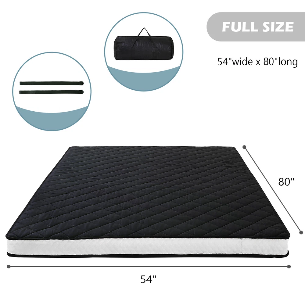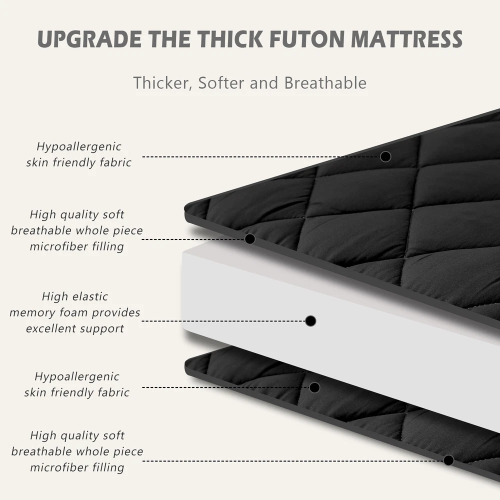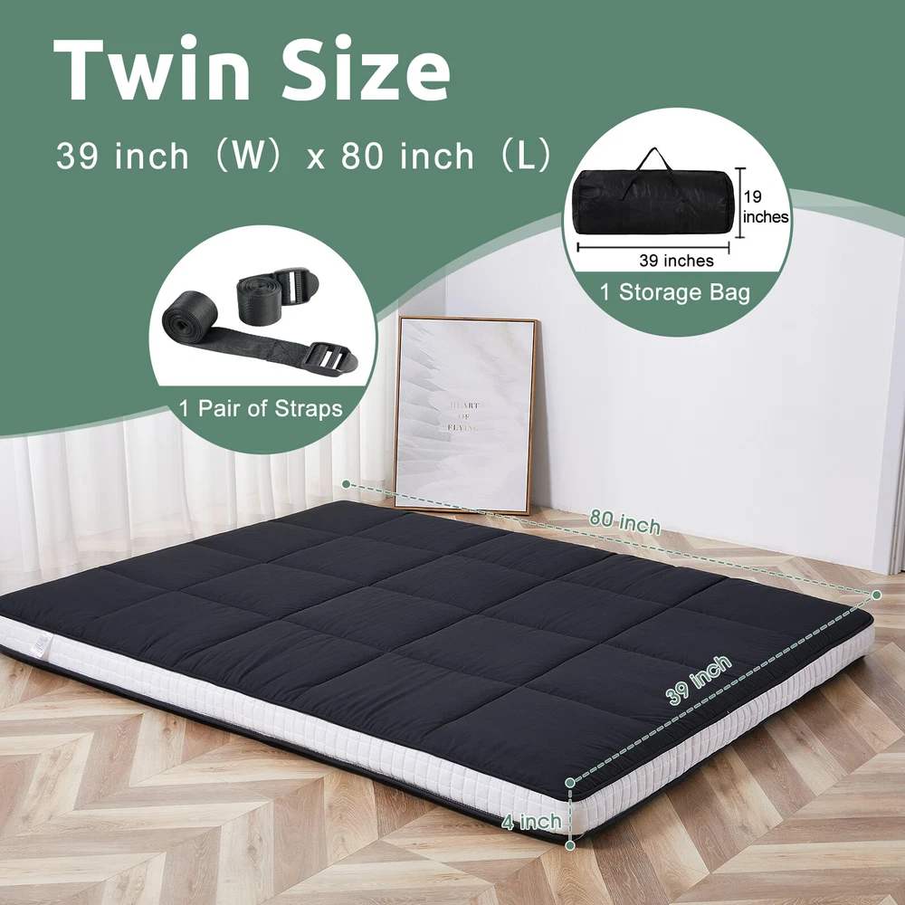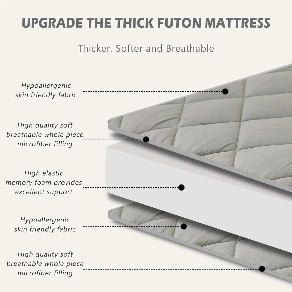 ( Black or Gray color) The futon, Japanese traditional style bedding, is a type of Japanese mattress used on the floor at night for sleeping. This Japanese bed is traditionally rolled up during the day when not needed to free up some space in the room. About this item [Japanese floor mattress] The futon, Japanese traditional style bedding, is a type of Japanese mattress used on the floor at night for sleeping. This Japanese bed is traditionally rolled up during the day when not needed to free up some space in the room. Fabric: 100% Cotton / Stuffing: 100% Polyester and Polyurethane. When it comes to futon, Japanese style futon are the most popular Japanese bed. Originating in Japan, this soft, rollable Japanese mattress can easily set up on the tatami mats on the floor to provide an airy yet firm support. [5-Layer Futon Mattress] These five-layer futons disperse pressure on the body making for comfortable sleep even if have back pain. [Japanese traditional style bedding] Use a tatami mat with the futon to adjust moisture and you will feel cool and refreshed even on a hot summer night. Use them on the floor on a bedframe or store them in the closet in case you have a guest. These versatile futons ensure a good night's sleep. This Futon mattress is delivered compressed in a vacuum bag. After opening the vacuum bag, the Futon mattress will gain air and return to its original thickness. Wrinkles may be present on the Futon but this is not a defect, please air for a few hours. On a dry, sunny day, dry the Futon on both sides for about two hours each. The Futon will gain air, becoming fluffy and soft. [Cautions for use] To prevent the Futon getting damaged, please use covers or sheets. Make sure to wash the covers and sheets frequently. The Futon should be dried in the sunshine, or in a Futon dryer. With sunshine and heat, it will become more resilient, warm and fluffy. Lightly beat the futon occasionally to remove dust. [ Size Weight and color ] Twin Size: 4" thick x 39" wide x 80" long, Weight: 10 lbs, Full Size: 4" thick x 54" wide x 80" long, Weight: 14 lbs ; Queen Size: 4" thick x 60" wide x 80" long, Weight: 16.65 lbs Color : Gray or Black Package Included: ▶ 1 futon mattress ▶ 1 same color mattress dustproof cover ▶ 1 pair of bandage ▶ 1 storage bag Feaches A unique, minimalist approach to sleeping The Futon is originating in Japan, this soft, rollable Japanese mattress can easily be set up on the tatami mats on the floor to provide airy yet firm support. 5-Layer Futon Mattress These five-layer futons disperse pressure on the body making for comfortable sleep even if have back pain. Inside "Made in Japan" "MADE IN JAPAN" stands for the world-class manufacturing and factories behind the exceptional quality of our futons. A P A Comfortable and Supportive - This mattress is fluffy but also supportive because of the 5-layer structure(microfiber fabric, polyester filling, memory foam, polyester filling and microfiber fabric). Soft and breathable microfiber fabric makes it more comfortable. Perfect Quilting - Our square and triangle quilting help make the filling evenly. The mattress will fit your body better and provide a golden sleep. Easy to Use, Store, and Clean - Comes with bandages, a storage bag, and a mattress cover. Help you pack the mattress for easy transportation or storage in a closet or other areas. When necessary, simply remove the dust cover to wash in the washing machine. Suitable for multiple scenarios - A sleeping mattress or topper on your bed, a Japanese futon mattress in your bedroom, a yoga mat, a camping mattress outside, a temporary bed for guests or a play mat for your children, etc,. Ideal for both children and adults.