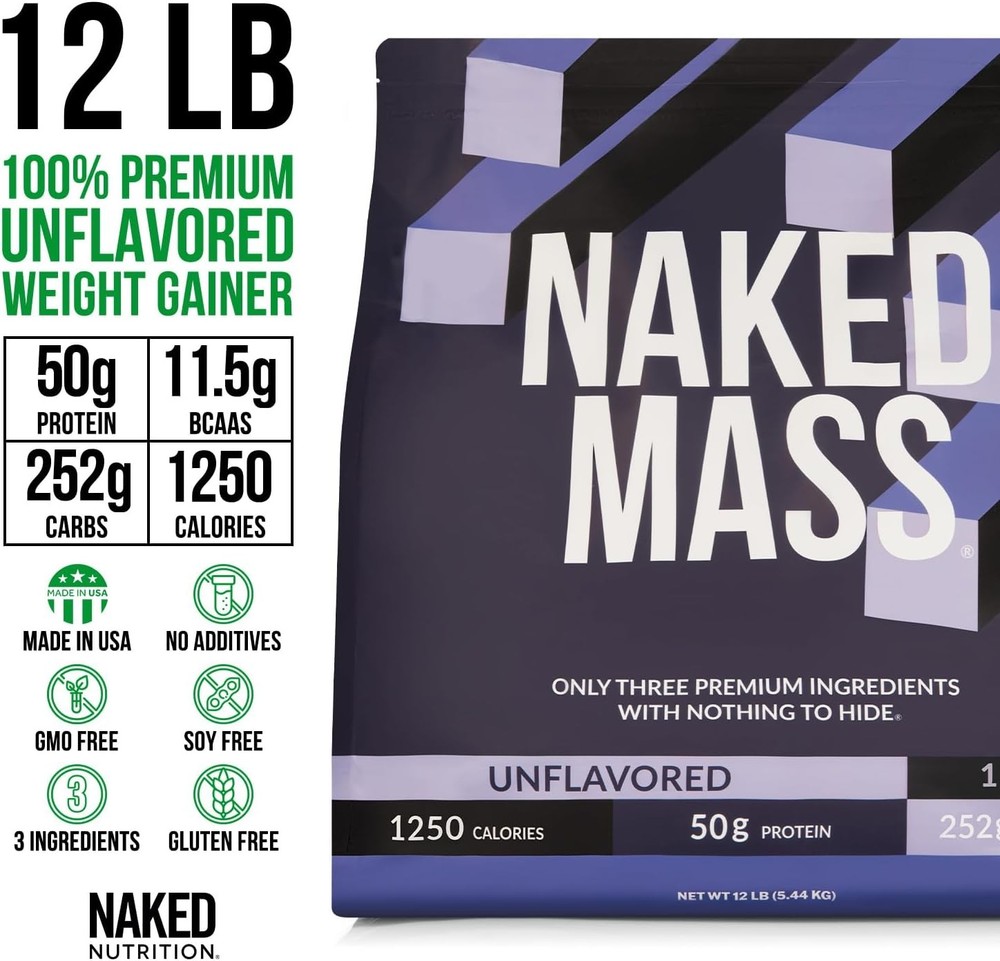 NAKED Mass - Natural Weight Gainer Protein Powder - 12LB 12 Pound (Pack of 1) Description Features: ONLY THREE INGREDIENTS: Naked Whey, Naked Casein and Organic Maltodextrin (made from gluten free organic tapioca). Naked Mass contains no artificial sweeteners, flavors, or colors and is GMO Free, No rBGH or rBST, Soy Free and Gluten Free. MAXIMUM NUTRITION: 50g of Protein, 252g of Carbs, 1,250 Calories, 11.5g of BCAAs (branched-chain amino acids) per serving and only 5g sugar - compare vs other weight gain supplements for bulking. MULTI-PHASE CLEAN PROTEIN: Keep protein synthesis up by combining fast release grass-fed whey with slow-digesting micellar casein. Plus, get the healthy amino acids your body needs. Combine with a high-calorie diet and exercise to gain weight and transform yourself from a hard gainer to a pro gainer. PREMIUM COMPLEX CARBOHYDRATES: Unlike other weight gainer supplements that use wheat-based maltodextrins, Naked Mass is a serious, true mass gainer and uses gluten free organic tapioca maltodextrin for clean source complex carbohydrates. BEST WEIGHT GAINER SHAKES AND RECIPES: Our unflavored super mass gainer protein powder is versatile for making smoothies and recipes. Boost calories and give your body optimum nutrition by adding Naked Mass to homemade protein bars, shakes, and more. Product Details: Product Dimensions : 8 x 8.03 x 11.06 inches; 12 Pounds Manufacturer : NAKED nutrition Brand: NAKED Flavor: Unflavored Item Weight: 12 Pounds Material Type Free: Gluten Free, Soy Free, Non-GMO, No Artificial Flavors, No Artificial Colors Diet Type: Gluten Free Handling We will ship all orders within 1 business day of payment. Delivery We Do Not Ship Outside of the Continental US. Return Policy All items qualify for returns within 30 days of receipt. Buyer is responsible for return shipping on any item that is not damaged. Feedback We take our reputation seriously, we buy and sell online, so we understand the value of trust. If you are unsatisfied with your order, please contact us and we will work with you to resolve it to your satisfaction.