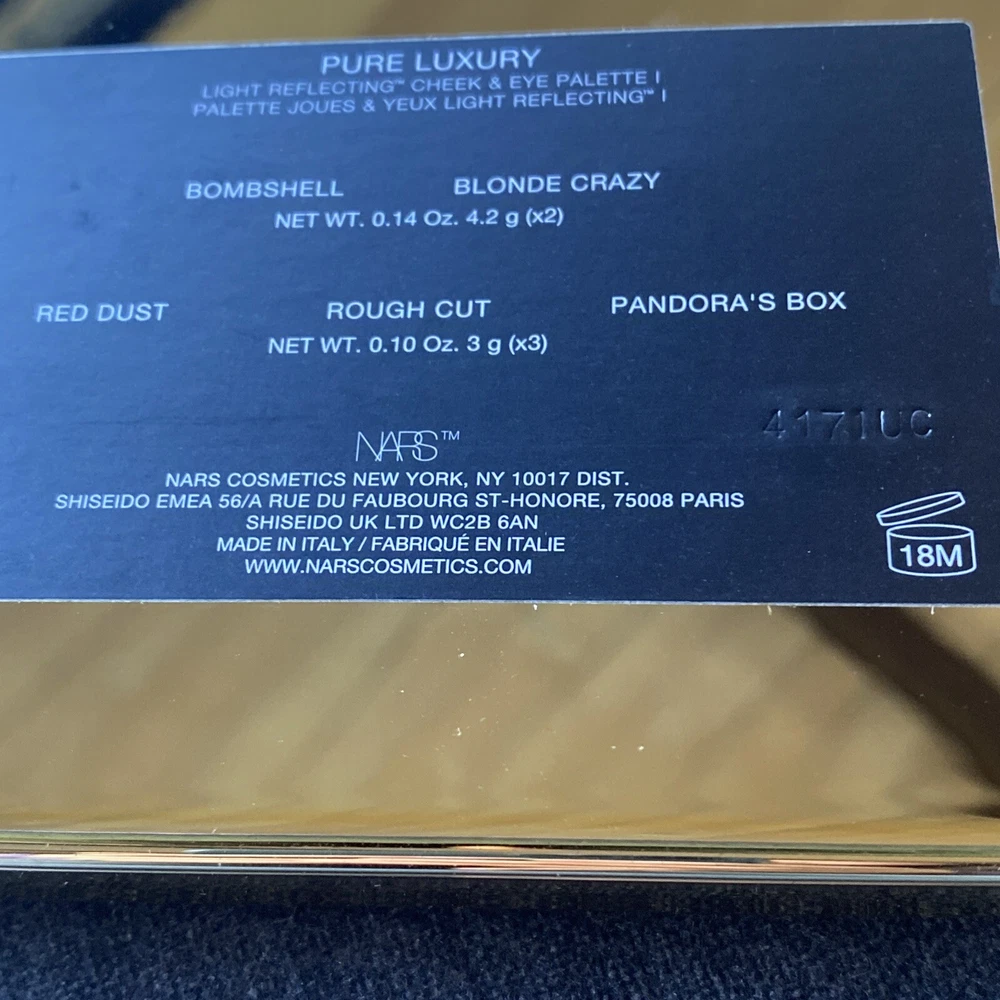 NARS Pure Luxury Light Reflecting Face & Eye Palette in Light to Medium Brand New In Box. SERIOUS BUYERS ONLY! Please see all pics to see conditions of box and or products before bidding. Thanks. By bidding on this item, you have agreed to the following: iPhone photos are for customers to see the condition, expiration dates(if applicable) and batch codes of the product, as well as box condition. Actual colors may vary. Please research colors, textures and batch codes before bidding. Thanks. Due to fluctuating temperatures, seller is not responsible for items melting or changing during transport. COMBINED SHIPPING available for USPS Priority Flat Rate Packaging Only. No First Class Postage! What it is: A holiday-edition palette featuring five multi-use powders for radiant eyes and cheeks. Ingredient Callouts: Free of parabens, formaldehydes, formaldehyde-releasing agents, phthalates, mineral oil, retinyl palmitate, oxybenzone, coal tar, hydroquinone, sulfates SLS & SLES, triclocarban, triclosan, and contains less than one percent synthetic fragrance. What Else You Need to Know: Prepare for the party circuit with new palettes of Light Reflecting™ powders for a natural, luminous wash of color across eyes and cheeks. Limited-edition, sculptural gold compacts include five powders for highlighting, sculpting, and blushing for next-level luminosity that lasts all night. The Pearlescent pigments and polymers create a light-scattering effect for a radiant, soft-focus look with eight-hour wear. Effortlessly build and blend with rich champagne, bronze, and pink shades to create sensual eye looks that light up a room, and warm, lit-from-within cheeks. The Light to Medium Palette Contains: - 2 x 0.14 oz / 4.2 g Light Reflecting™ powders in Blonde Crazy (soft natural brown) and Bombshell (opalescent pink pearl) - 3 x 0.10 oz / 3 g Light Reflecting™ powders in Rough Cut (candy coral), Pandora’s Box (soft dusty rose), Red Dust (dolly pink) Retail $60.00