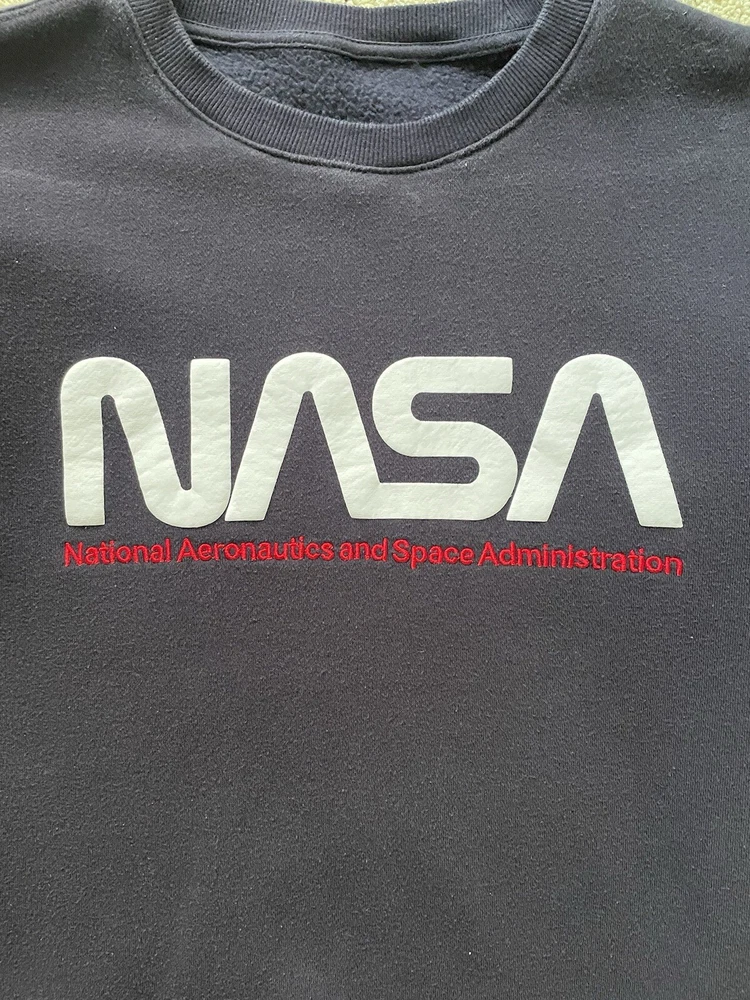 This navy blue sweatshirt with a solid pattern is perfect for any NASA enthusiast. The long sleeve crewneck sweatshirt features the NASA logo as an accent, adding a touch of style to your wardrobe. It is made by H&M and is available in a small size, perfect for men who prefer regular fit clothing. The sweatshirt is designed for casual wear and is suitable for any occasion. The color blue and the space theme make it a unique addition to your activewear collection. The sweatshirt is made in the United States and is not vintage. It is labeled as a small but it would be a comfortable medium as well
