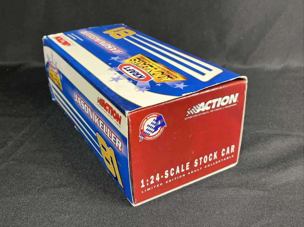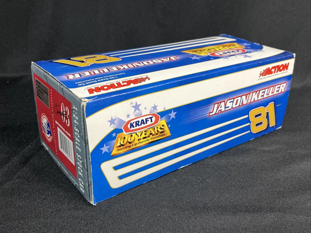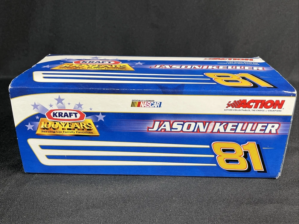 This is a 1:24 scale diecast model of a Chevrolet Monte Carlo raced by Jason Keller in the 2003 NASCAR Daytona series. It features a multi-color design celebrating the 100th anniversary of Kraft. Produced by Action as part of their racing collectables series, this limited edition model also serves as an advertising specimen for the Kraft brand. Packaging may show signs of wear. SB