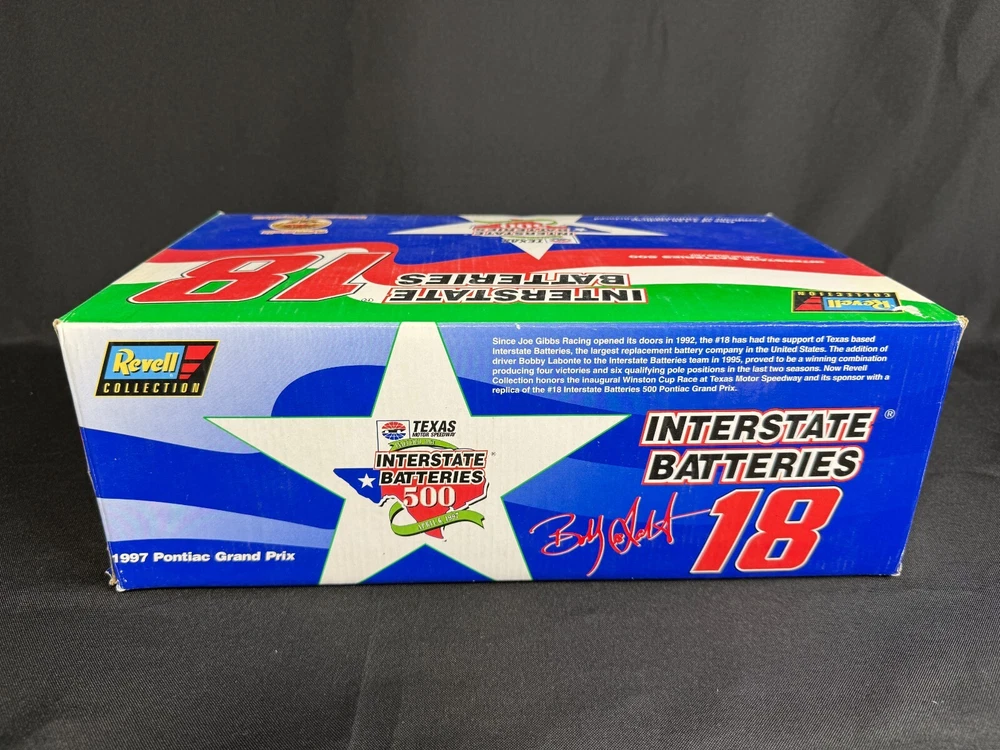 The product is a Revell 1:18 diecast model of the NASCAR #18 Interstate Batteries 1997 Pontiac Grand Prix. It is a replica of a sport & touring car from the NASCAR organization. Used - packing may show signs of wear SB