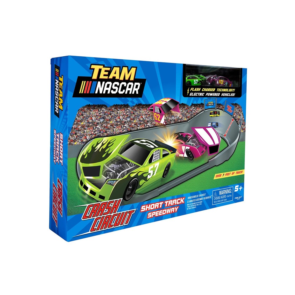 RACE, WRECK, AND REBUILD – The Nascar Crash Circuit Short Track is designed to ensure high-speed racing and thrilling crashing action! Recommended for ages 3 and up. INCLUDES – 1 Track Set, 2 Electric Powered Vehicles, 2 Flash Chargers, 6 Track Billboards, 6 Crash Barrels, 6 Crash Cones, and 1 Label Sheet. INSANE SPEED AND EPIC CRASHES – Flash charge your vehicles in 10 seconds or less! All of the pieces easily snap back together for powerful, continuous, and unrestrained racing. MORE CARS, MORE FUN – The Nascar Crash Circuit Short Track is compatible with other Crash Circuit and Crash Racers track sets and vehicles from our store. More versatility and cars: more competition and fun! + NASRCAR – Our mission is to capture the momentum, thrill, and intensity of Nascar. We are proud of our considered design and can’t wait for you to tap into the uncharted arena of Nascar.