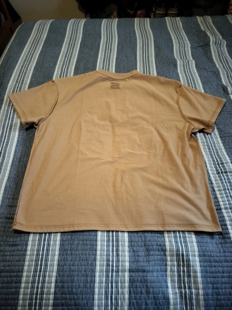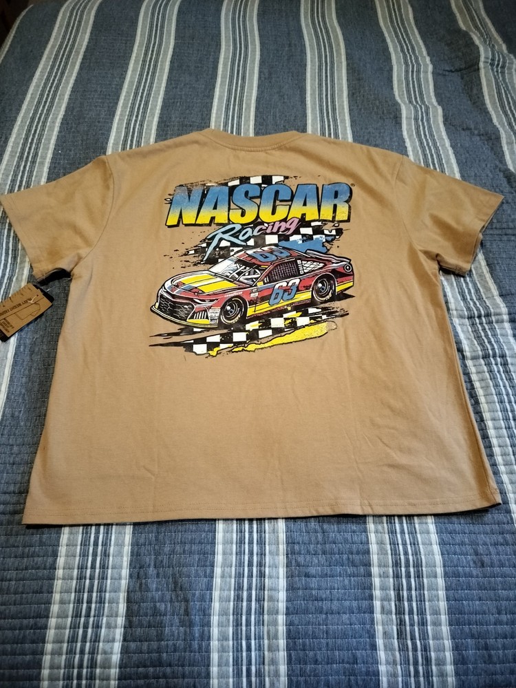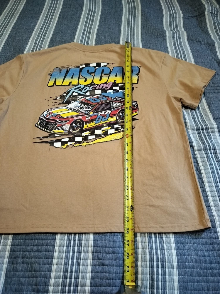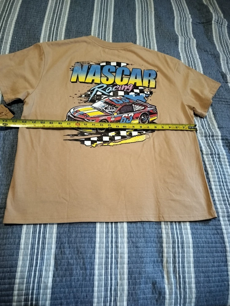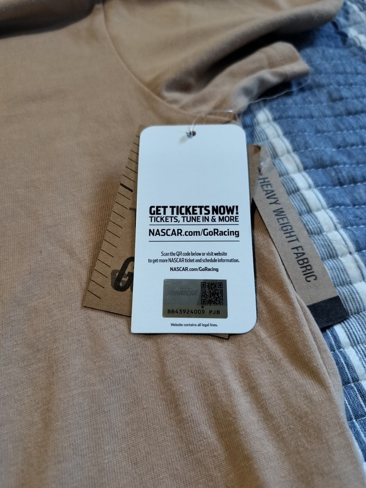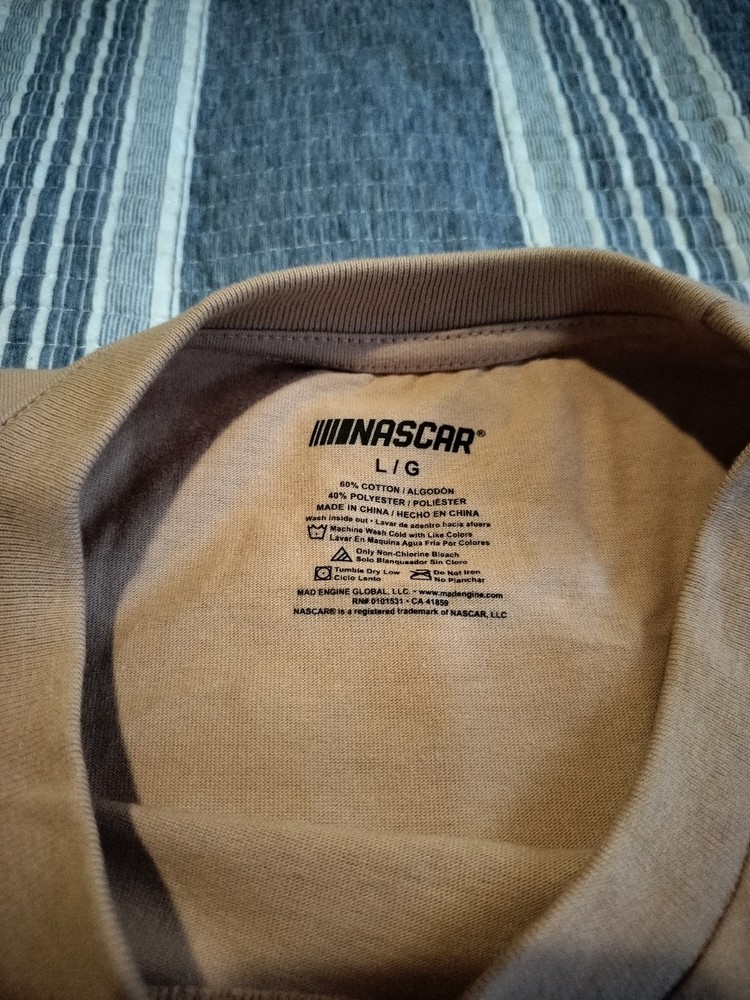 The product is a tan men's NASCAR T-shirt in size L, featuring Dale Earnhardt Jr. as the player. It is officially licensed by NASCAR and is perfect for fans of auto racing. The shirt showcases the brand's logo and is ideal for displaying team spirit at races or casual outings. Made from comfortable material, this shirt is a must-have for any NASCAR enthusiast.
