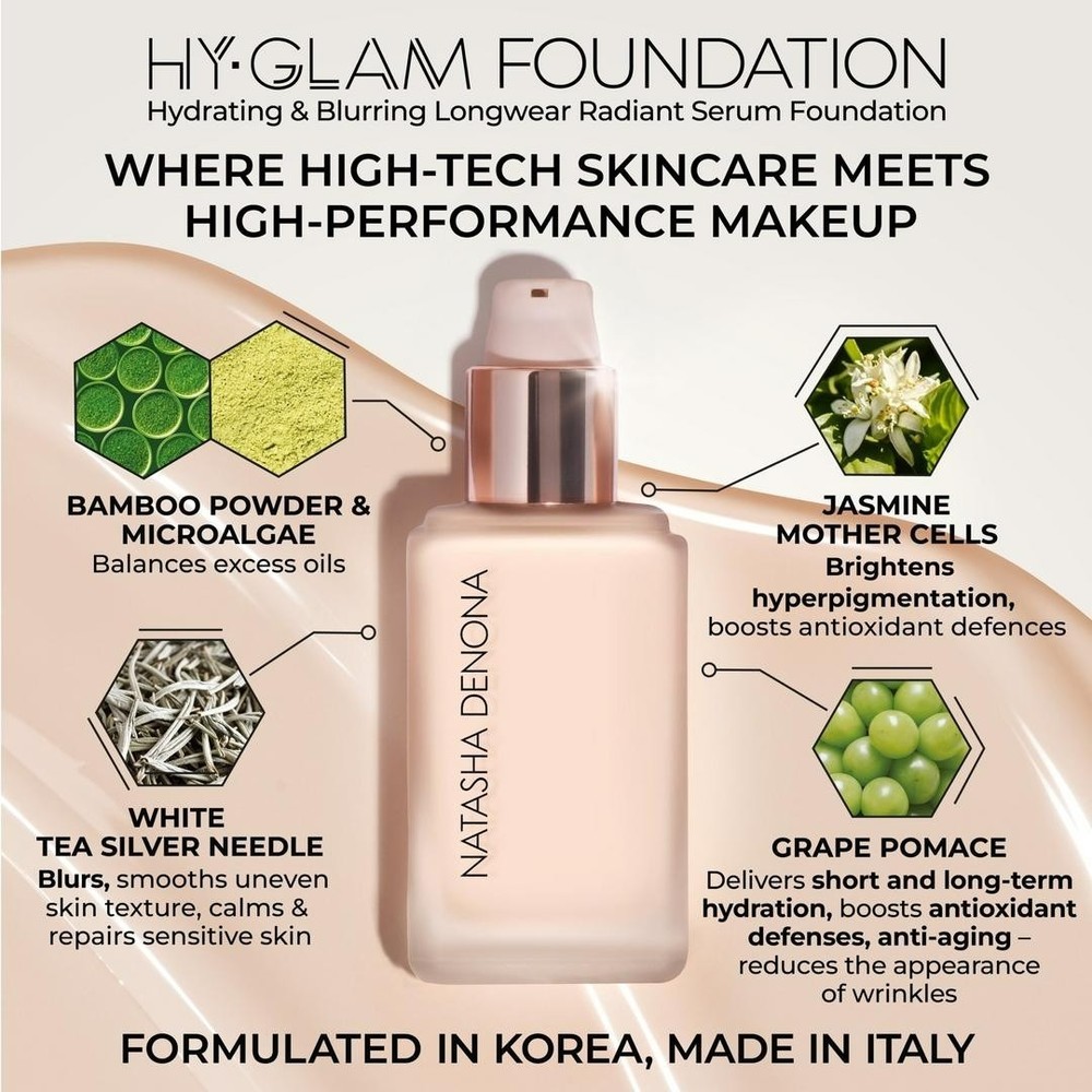 HY-GLAM FOUNDATION is a medium-buildable blurring & self-setting radiant serum foundation that hydrates & balances oils for up to 18hrs of creaseless wear. Developed with Korean tech & Japanese Amino Acid Pigments, this anti-aging HY-BRID boosts collagen production & antioxidant defenses Details Benefits Anti-Aging: Repairing & Smoothing Boosts collagen, hydrates, reduces wrinkles, detoxifies, improves skin Hydration: Short- & Long-Term Blurring: Reduces Skin Imperfections Such as Scars Brightens Hyperpigmentation Suitable for Sensitive Skin Hypoallergenic Non-Comedogenic Long-Lasting Up to 18 Hours Features Japanese amino acid bio-mimetic pigments Medium-buildable coverage Boosts collagen production & cells detoxification Key Ingredients Jasmine Mother Cells - Boost antioxidant defenses, brighten & fight hyperpigmentation White Tea Silver Needle - Blurs imperfections, calms redness, soothes, repairs and strengthens skin Grape Pomace - Boosts collagen, hydrates, reduces wrinkles, detoxifies, improves skin How To Use HOW TO USE - FULL FACE PRIME: Gently blend 3-4 drops of the HY-GEN Primer Serum into the skin for an illuminating and pore-refining base. CORRECT: Use the orange-based HY-GLAM Corrector to neutralize blue/purple under-eye circles and hyperpigmentation. Apply the rosy shades of the HY-GLAM Concealer to target brown under-eye circles. COVERAGE: To even out the skin tone with undetected naturally radiant coverage, apply the HY-GLAM FOUNDATION using a foundation brush starting from the center of your face and blending outwards for medium-buildable coverage. For full-coverage, apply with your finger or a makeup sponge. CONCEAL: Use HY-GLAM Concealer to conceal and brighten. OPTIONAL: Apply powder for an ultra-matte luminous finish. Due to its self-setting formula, the HY-GLAM FOUNDATION delivers a flawless, perfected natural skin finish, even when worn alone.