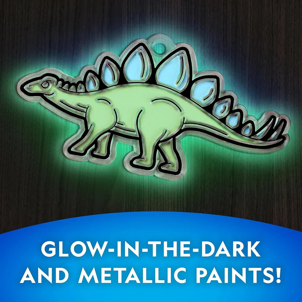 NATIONAL GEOGRAPHIC Kids Stained Glass Kit - Glow in the Dark Glowing Dinos Product Details Brand: Blue Marble Age Range (Description): 4 years and up Color: Glowing Dinos Theme: Dinosaurs Item dimensions L x W x H: 6.1 x 2.2 x 9.21 inches CREATE STAINED GLASS DINO ART - With this arts and crafts kit, kids can paint 10 acrylic dinosaurs with the included paints and brush, creating their own unique color combinations for each dino! Once dry, they can display their dinos as window art! GLOWING & METALLIC PAINTS - Kids can let their imaginations run free as they decorate their dinos with 5 glow-in-the-dark paints (red, yellow, green, orange & blue) and two metallic paints (silver and gold)! DISPLAY AS COLORFUL WINDOW ART - These dinos make the perfect suncatchers! This kit includes 10 suction cups so they can easily stick their finished dinosaurs to windows and watch them shimmer in the daytime, and glow when the lights are off! EVERYHING KIDS NEED - This stained glass dinosaur activity kit includes everything kids need to create dinosaur window art: 10 acrylic dinosaurs, 10 suction cups, 5 glow-in-the-dark paints, 2 metallic paints, paintbrush & fact-filled Learning Guide. HIGH-QUALITY EDUCATIONAL TOYS - We're proud to make the highest quality hands-on science toys, and all our products are backed by exceptional service. If your experience is less than stellar, let us know and we'll make things right!