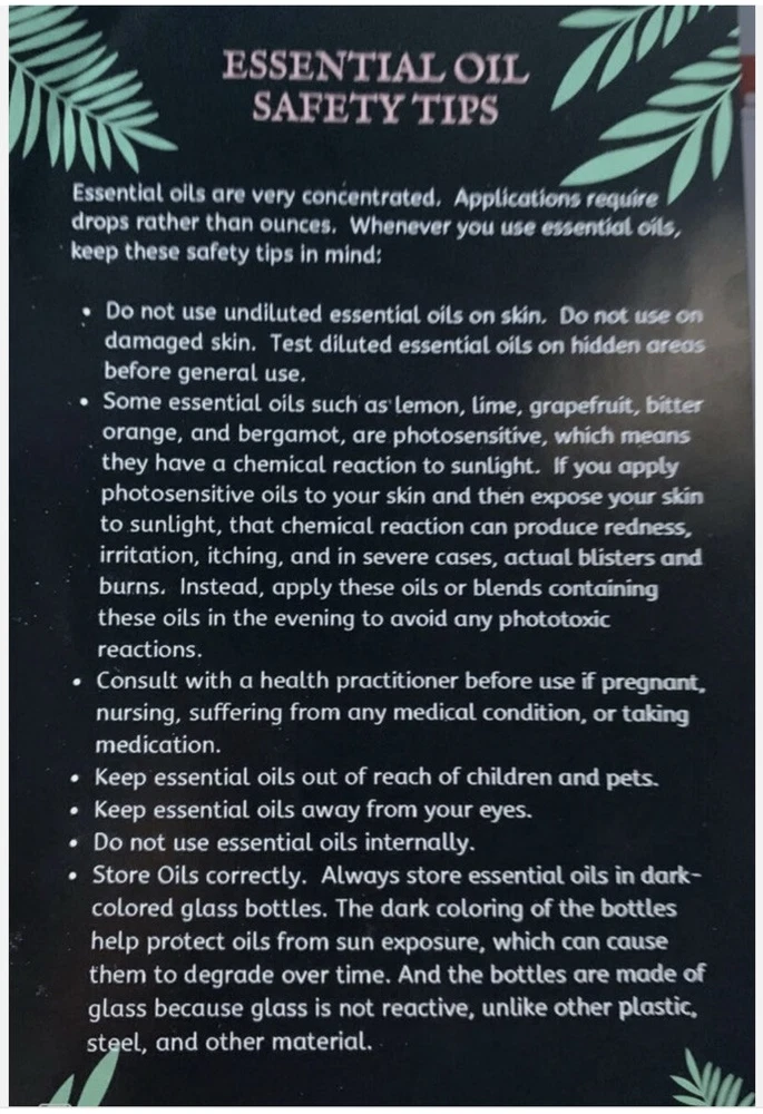 NATURA 100% pure essential oils set NATURA PRIMERA ESSENTIAL OIL SET Our sense of smell is primal, used to warn us against dangers and even help us find food. But beyond these everyday uses,our sense of smell can be used to promote well-being through the use of pure essential oils. Tea Tree Lemon Cinnamon Eucalyptus Lavender Peppermint **THESE STATEMENTS HAVE NOT BEEN EVALUATED BY THE FOOD AND DRUGADMINISTRATION. THESE PRODUCTS ARE NOT INTENDED TO DIAGNOSE, TREAT, CURE ORPREVENT ANY DISEASE.