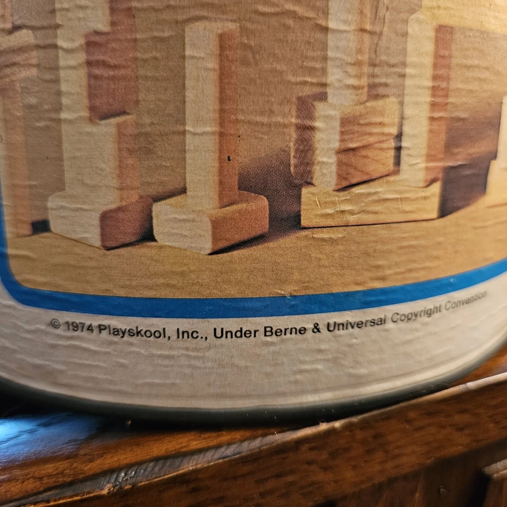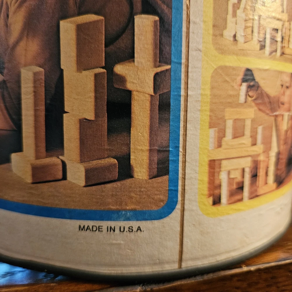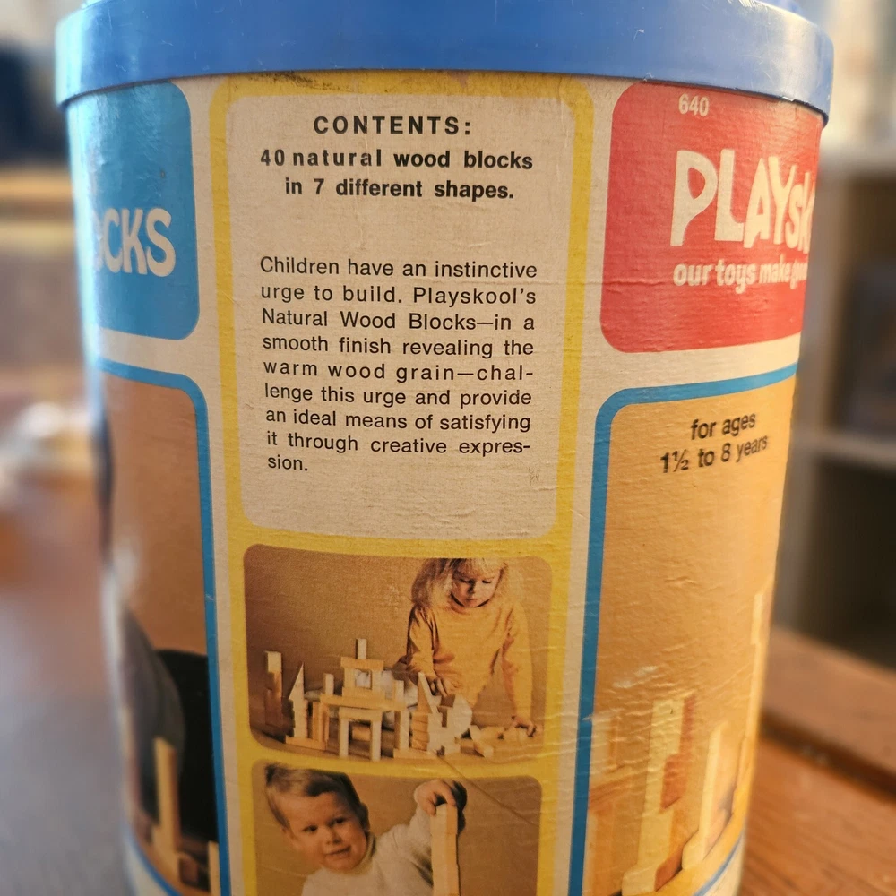 Original Vintage 1974 Playskool Natural Wood Blocks. 40 block set. Made in USA. Comes in original canister that still seals to hold blocks in. Recommended for ages 1.5 to 8 years.