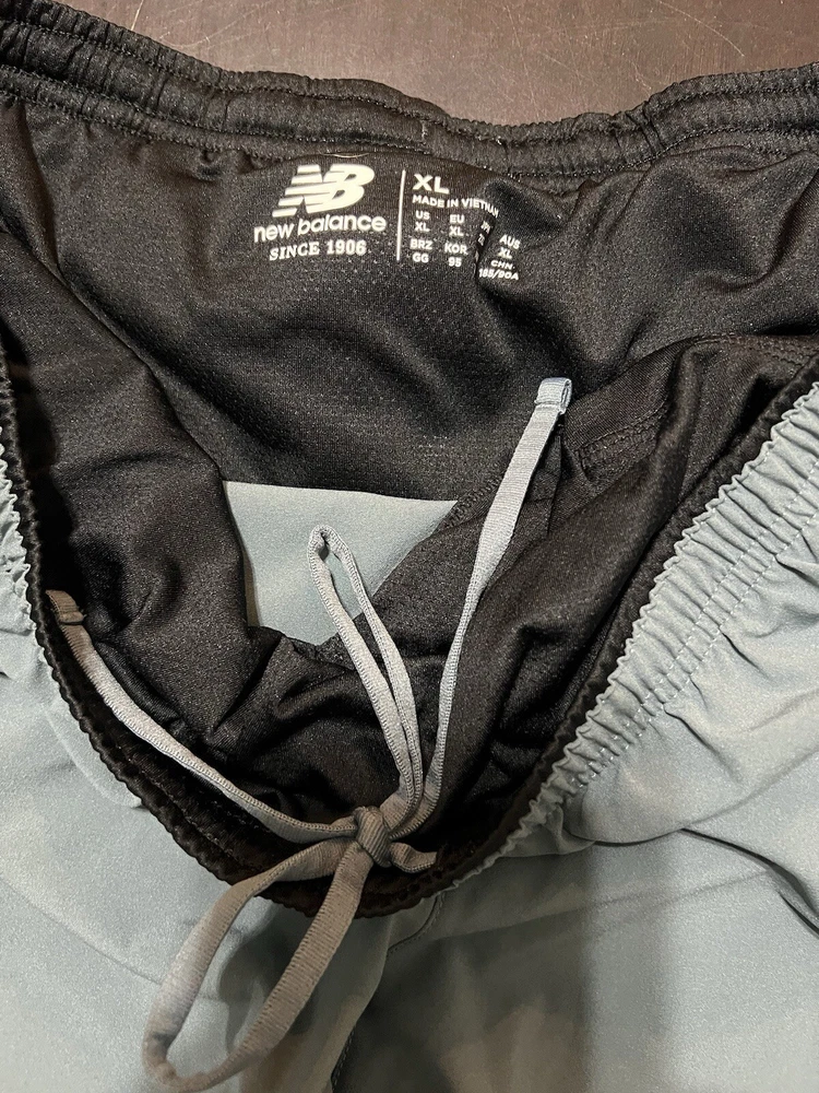 Size: M Performance/Activity: Gym & Training Inseam: 7 in Material: 100% Polyester Garment Care: Machine Washable Size Type: Regular Distressed: No Waist Size: 28 in Color: Gray Season: Fall, Spring, Summer Department: Men Closure: Drawstring Features: Comfort, Drawstring, Elastic Waist, Lightweight Country/Region of Manufacture: Vietnam gtin13: Does not apply Occasion: Activewear Brand: New Balance UPC: Does not apply Fabric Type: Blended Fabric Pattern: Solid Fit: Athletic Theme: Sports Style: Athletic