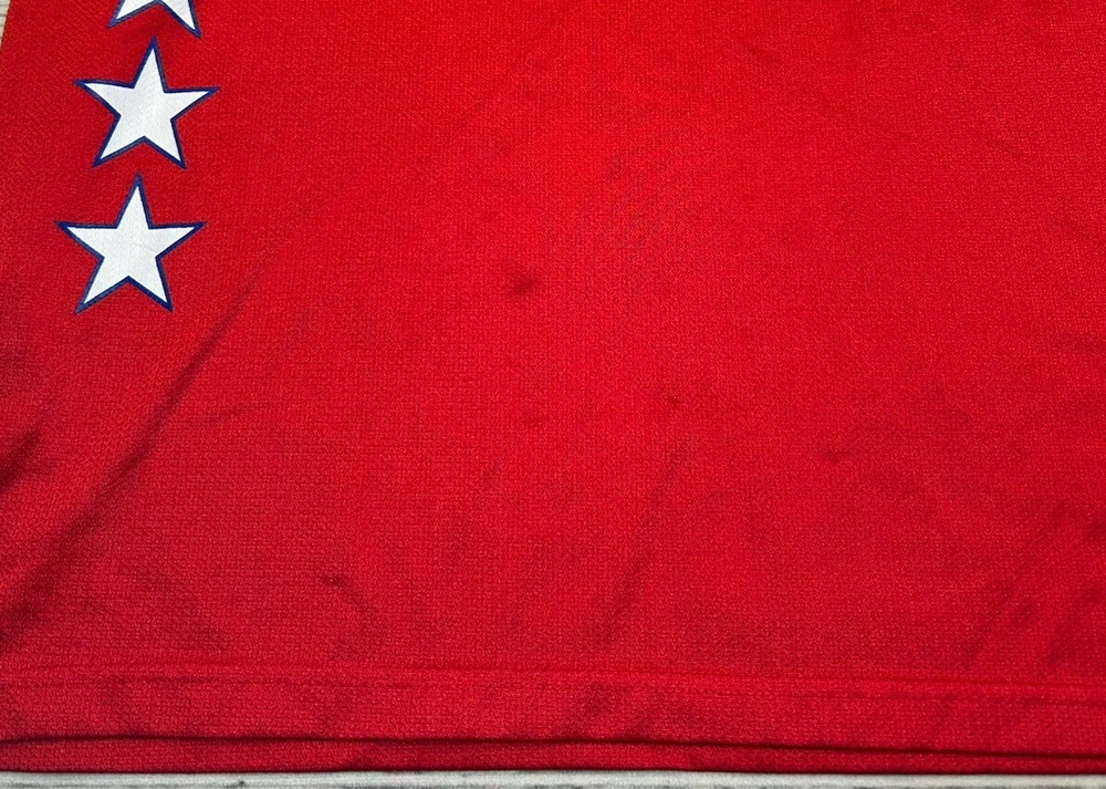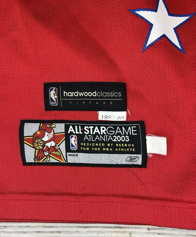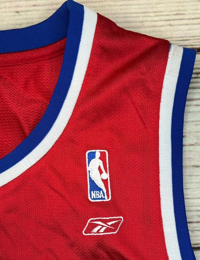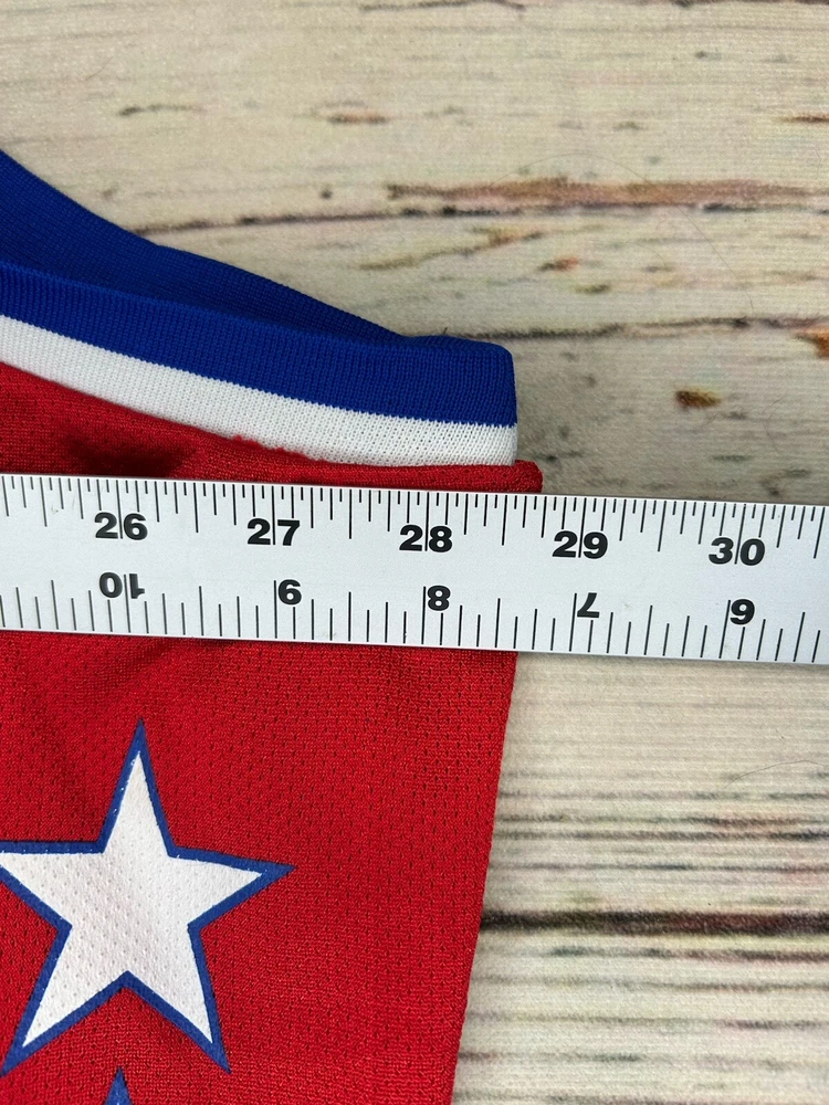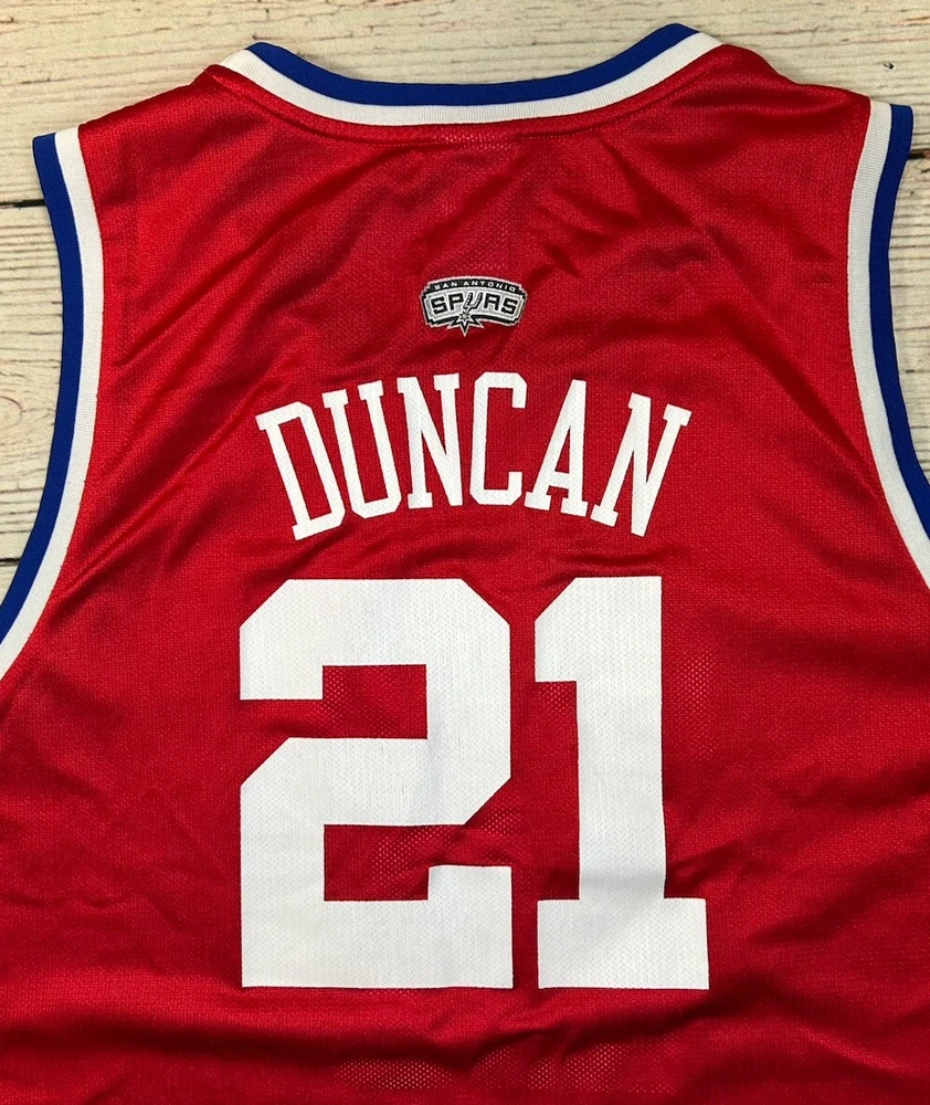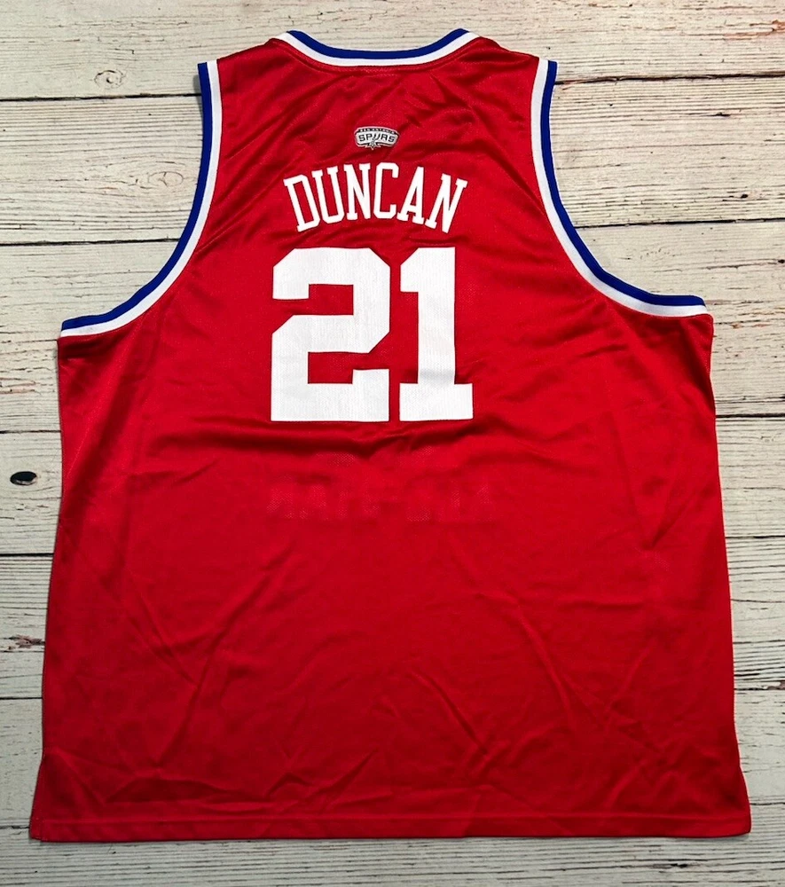 The product is a men's jersey of Tim Duncan from the San Antonio Spurs, specifically designed for the 2003 NBA All Star Game. It is a size 56 red Reebok jersey, officially licensed by the National Basketball Association (NBA). The jersey is a HWC Swingman model, suitable for basketball fans wanting to represent one of the greatest players in NBA history. Has some marks. Check pictures for condition and measurements for size.