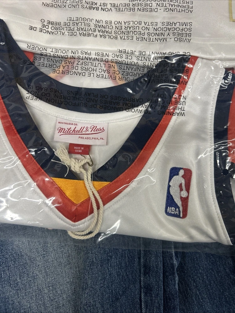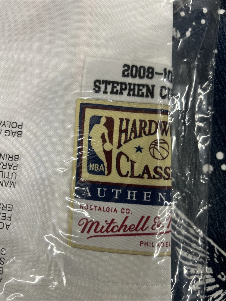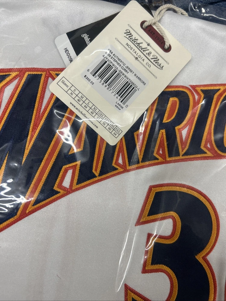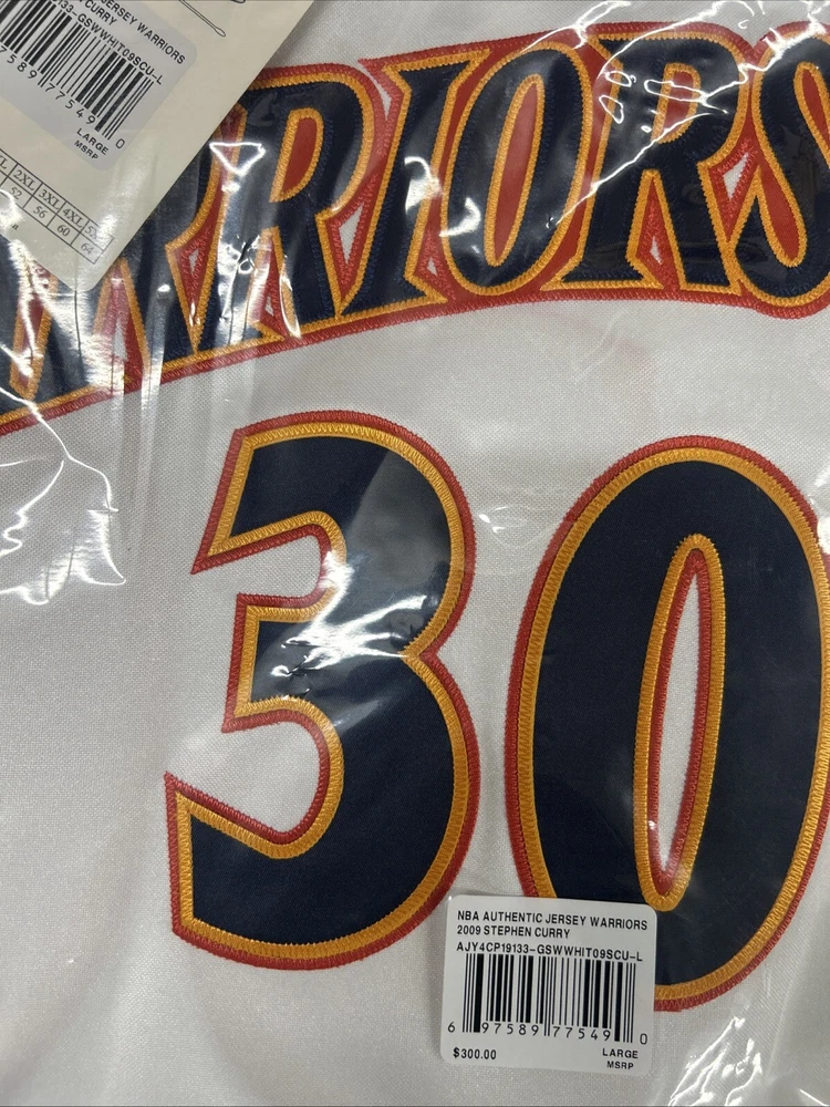 This is a Mitchell & Ness NBA Authentic Stephen Curry jersey for the Golden State Warriors from 2009. It is officially licensed by the National Basketball Association (NBA) and is in size L. The jersey is white in color and is designed for men who are fans of Stephen Curry and the Golden State Warriors.