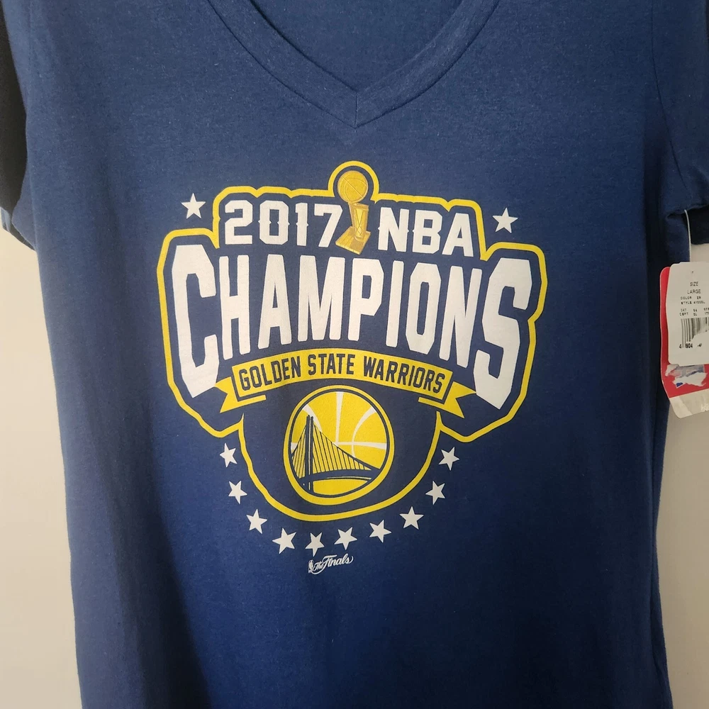 New with Tags NBA Womens T-Shirt Short Sleeve V-Neck Golden State Warriors 2017 NBA Champions 100% cotton Size Large Approximate Lay Flat Measurements underarm to underarm 19" length 27" (705)