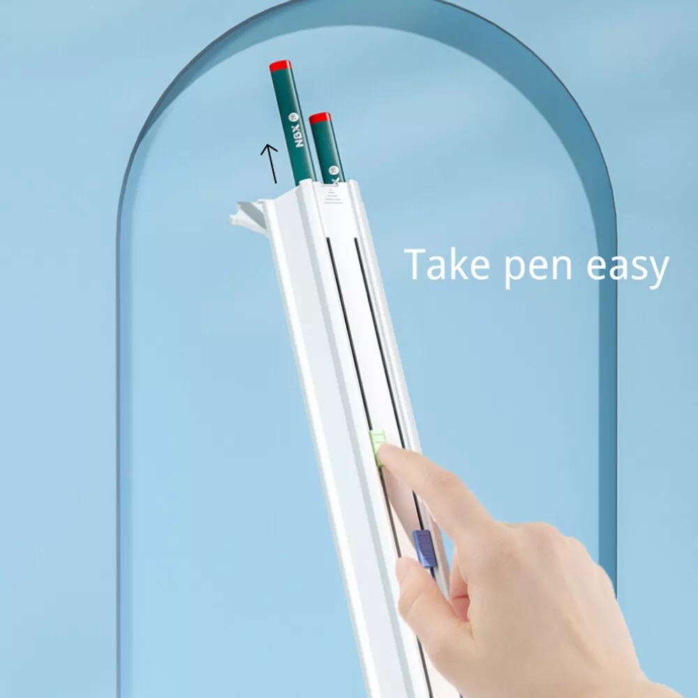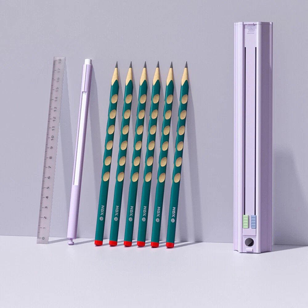 Features: 【Practical Design】The pencils can be removed from the 6-color buttons. The ruler and eraser are also easy to find in their fixed positions in the pencil case. And a detachable pencil sharpener at the bottom. It's fashionable and practical. 【Durable and Easy to Clean】This pencil case is made of high-quality ABS material, sturdy and durable, with smooth texture and easy to clean. The pen design inside the box helps prevent breakage of the pens. 【Lightweight & Portable】With its all-in-one design, it's convenient and lightweight without making other stationery dirty. It is a good choice for daily sketching. 【Perfect Gift】An original creative gift for girls, boys, classmates, students or friends as graduation gifts, birthday gifts or Christmas presents. 【Package Includes】You will receive a pencil case, which contains 6 pencils, an eraser, and a ruler to meet your child's basic learning needs for a day. Lightweight and portable, you can easily find suitable elements to improve learning efficiency. Specification: Color: Purple Pencil Box Size: 20x3cm Package Size: 22x4.5x3.8cm/8.6x1.7x1.4in Package Weight: 142g/5oz Note: Due to the different monitor and light effect, the actual color of the item might be slightly different from the color showed on the pictures. Thank you! Please allow 1-2cm measuring deviation due to manual measurement. Packing List: 1 x Pencil Box 1 x Ruler 1 x Eraser 6 x Pencil