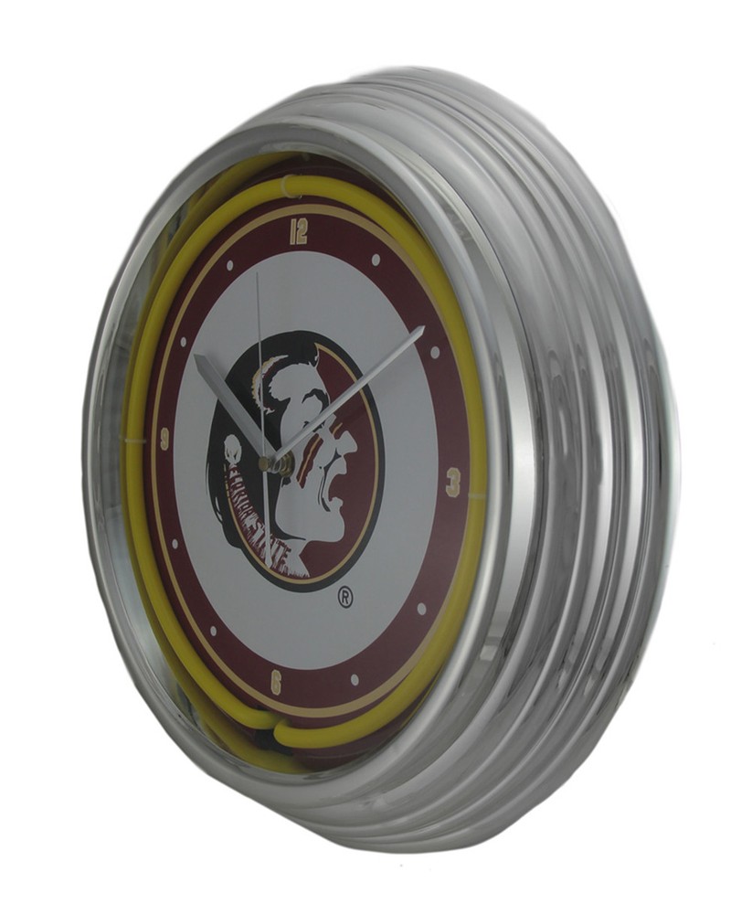 If you're an FSU fan, you'll want this officially licensed clock to hang in your home so you'll always know when it's time for the game! It's a classic neon design with a retro chrome-colored beveled frame, and the Seminoles logo is prominently featured in the center in true team colors. You can hang it on the wall, or extend the pre-attached easel and display it on any flat surface. The quartz movement requires just 1 AA battery (not included), and an AC adapter is included so you can instantly light it up just about anywhere. This 14.75-inch diameter, 2.25-inch wide clock is the perfect gift for your Florida State fan that's sure to light their excitement up! Our eBay Store About Us Add to Favorite Sellers NCAA Florida State Seminoles 15 inch Neon Wall or Tabletop Clock Officially Licensed 14.75 in. Diameter x 2.25 in. Wide Features the Team Logo and True Team Colors with a Plastic Chrome Colored Retro Frame and a Glass Neon Tube Quartz Movement Requires Just 1 AA Battery (not included) and Includes AC Adapter for Neon Light Can Be Hung On the Wall or Extend the Pre-Attached Easel for Tabletop Displays If you're an FSU fan, you'll want this officially licensed clock to hang in your home so you'll always know when it's time for the game! It's a classic neon design with a retro chrome-colored beveled frame, and the Seminoles logo is prominently featured in the center in true team colors. You can hang it on the wall, or extend the pre-attached easel and display it on any flat surface. The quartz movement requires just 1 AA battery (not included), and an AC adapter is included so you can instantly light it up just about anywhere. This 14.75-inch diameter, 2.25-inch wide clock is the perfect gift for your Florida State fan that's sure to light their excitement up! Product Details Color Yellow Height 14.75 Length 14.75 Weight 2.75 LB