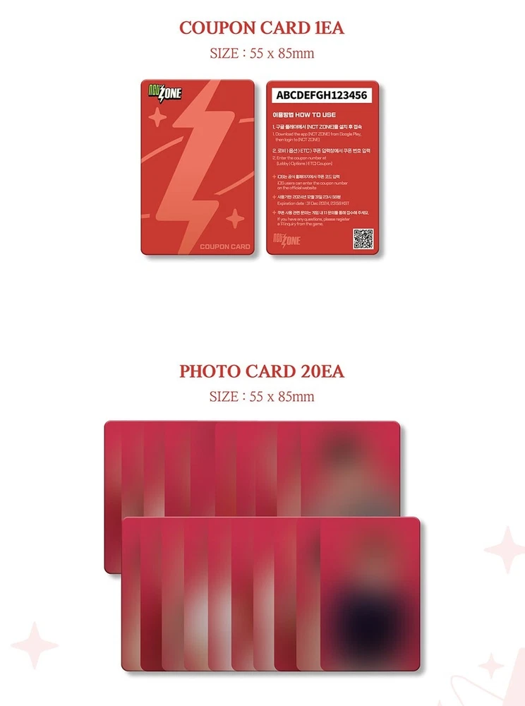 NCT - NCT ZONE COUPON CARD (CHRISTMAS ver.) ※ Orders received from the launch date on December 21th, 2023 will be shipped sequentially. ※ This product is not a CD album. ■ Product Description Only in NCT ZONE! Photos & videos of various concepts Enjoy photos and videos of various concepts that can be found only in NCT ZONE! The package consists of exclusive images shot for NCT ZONE. The coupon card includes 300 Crystals + 25,000 Gold worth 15,000 won that can be used in NCT ZONE. ■ Product Specification · PACKAGE SIZE: 90mm x 60mm x 12mm · PACKAGE WEIGHT: 45g · COUPON CARD: 55 x 85mm / Paper / 1EA · PHOTO CARD : 55 x 85mm / Paper / 20EA · SELFIE PHOTO CARD : 55 x 85mm / Paper / RANDOM 1EA (1 OF 20) · STICKER PACK: 86 x 54mm / Paper / 1EA ■ NCT ZONE Description Album releases, concerts, photoshoots... Idol group NCT has a packed schedule every day. From NCT's small wishes to their deepest desires... All those wishes gather in NEOZONE, a city of dreams in KWANGYA, the amorphous and limitless world, and present themselves as [Dreams] with various stories while NCT is sleeping. NCT CCOMAZ and Agent NCT live in NEOZONE, the city of dreams. They were managing idol NCT's dreams in NEOZONE and kept the city peaceful... When one day, an unknown anomaly causes NEOZONE to explode! ■ Customer Notice * Damaged and opened products due to consumer negligence are not eligible for exchange or refund. * Fine scratches are not eligible for exchange or refund, and we will exchange the product in case of severe damage. If the product is out of stock and we cannot exchange it, we will give you a refund. Note: I Accept PayPal only Basically, I provide Free Economy Shipping (No Tracking Number) You can add $ 5 to use standard Shipping upon your request. You can add $ 20 to use Expedited Shipping upon your request. Item ships From korea, south, Shipping usually 2-3 weeks. ※ Shipping Notes ※ -Free Economy Shipping Because there is a risk of loss We recommend standard Shipping. -Depending on the country, shipping may take two to three months. Feel free to contact me if you have any questions. **Customs duty guidance tariffs are not included in the price of this product. If the price of the product exceeds the tax exemption limit of each country, You have to pay a separate tariff. Whether the price of the product you are viewing exceeds the duty-free limit Please check and order. (Each country has different duty-free standards, so ask the customs office of your country.) On the grounds that customs duties were levied when the goods were received We do not offer refunds or returns.