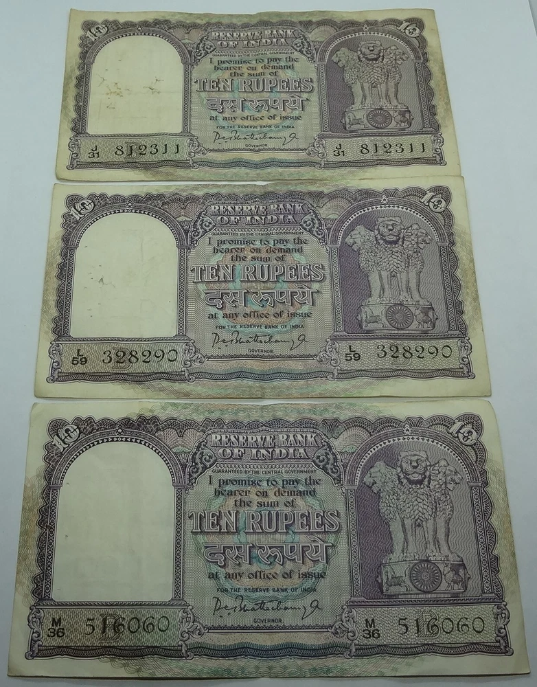 ND (1962-67) INDIA Lot of 3 Notes 10 RUPEES Letter B, Signature # 75 Pick # 40b Circulated Please grade and judge based on what you see in the pictures and bid accordingly Pictures and/or Scans are for Actual Item PAYMENT Please note that I use The New eBay's Unpaid Assistant System, and Unpaid Item Case is automatically opened on the 4th day from the end of the auction. If you need more time, please let me know so that I opt you out from the system SHIPPING Packages will be shipped within 24 Hours (Monday through Friday) after receiving a clear payment (No shipping on Saturdays, Sundays & National Holidays) Combined Shipping & Handling Fees Invoices will be combined for items won within 4 days only, since Payment is expected within this time frame. Again, if you need more time, please let me know Single Coins (Combined S/H): Highest full rate for the first coin plus $0.50 for each additional coin won Sets, Lots, Boxed/Cased Coins: Highest full rate plus 50% of S/H fees listed per extra item won Feedback & Communications Feedback will be posted automatically If any problem arises, please email me and I'll make every effort to resolve it If you have any question, please do not hesitate to email me GOOD LUCK