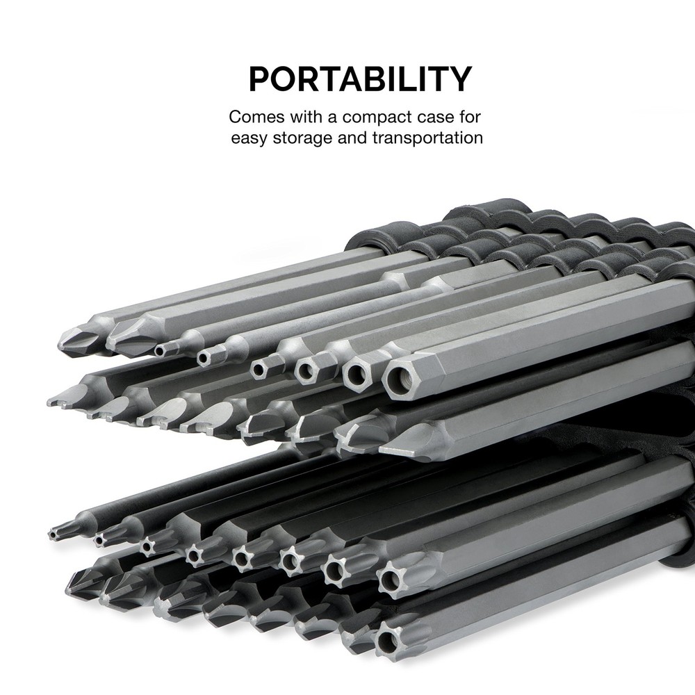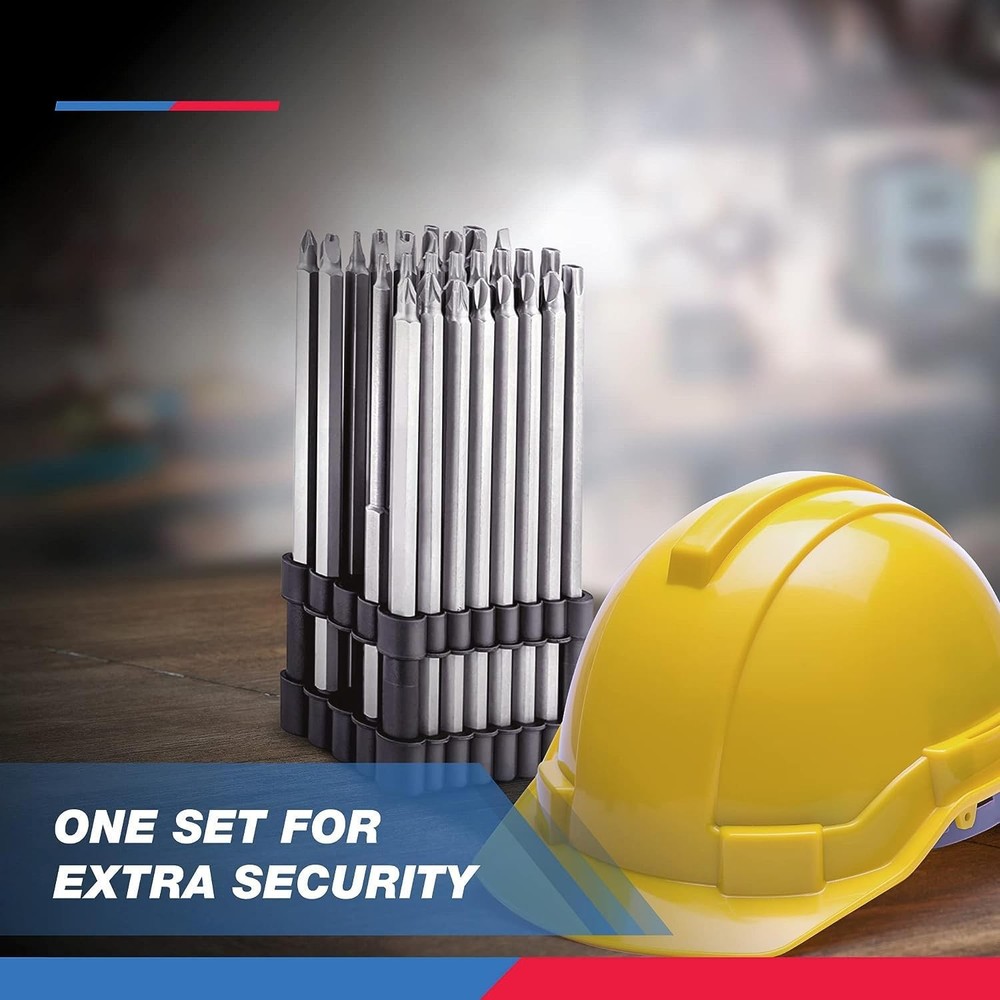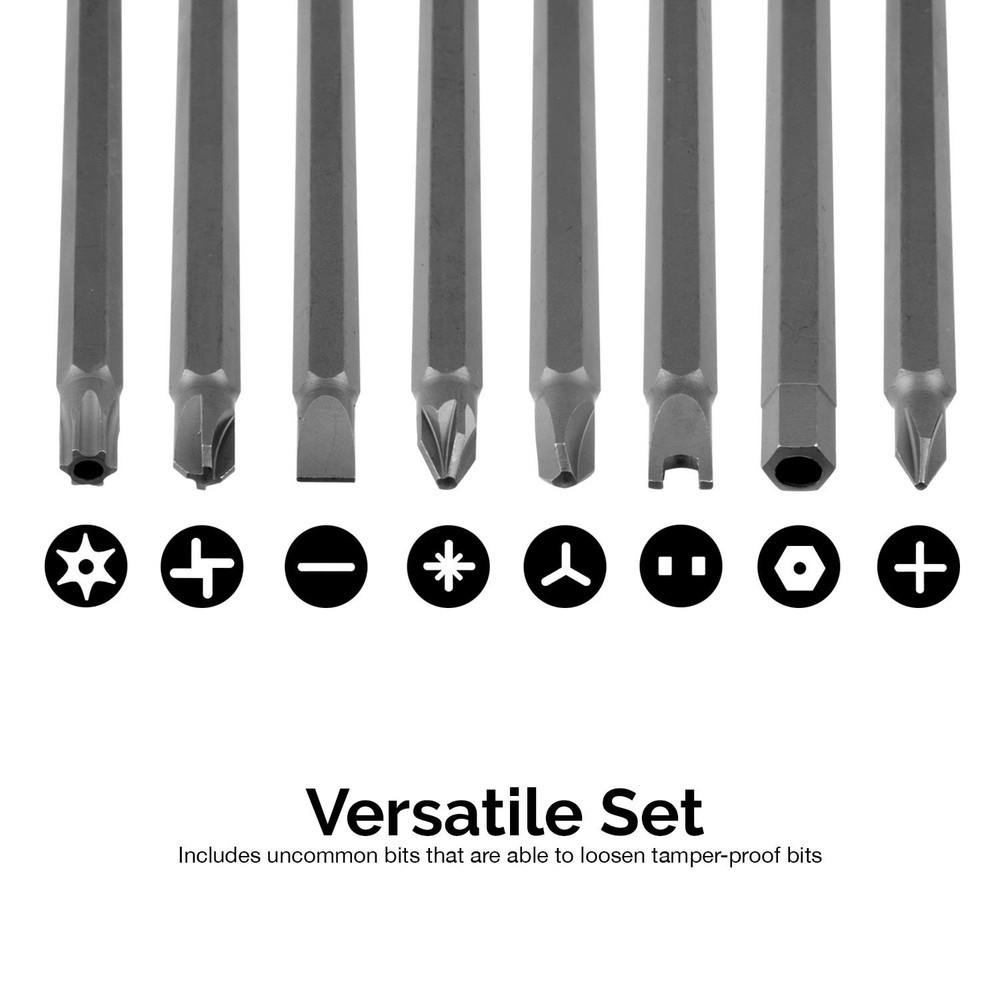HIGH-QUALITY HEX-BIT SET: Each screwdriver bit set piece in this set is made from durable S2 alloy steel, which reduces wear and tear and ensures longevity. This bit kit contains uncommon bits that will loosen tamperproof bits that regular screwdrivers can’t unscrew. VERSATILE TAMPERPROOF BIT SET: This versatile bit-driver set includes 8 unique bit ends, including slotted, Phillips, Pozidriv, Torq-Set, Tri-Wing, spanner, tamperproof hex, and tamperproof Torx. PRECISION MACHINED BITS: Each piece in this screw bit set is an extra-long bit set is finely crafted and precisely machined for accurate size. The chamfered bit ends insert smoothly into fasteners and protect both the bits and the fasteners from damaged edges. 1/4-INCH HEX SHANK: Each security power bit in this hex drill-bit set measures 6" long and has a universal 1/4-inch hex shank. These bits are ideal for working with electronic appliances. Use this set wherever extra security is a must. HEAVY-DUTY SECURITY BITS: Our security bit set can be used for any project, large or small. Use the bits to secure corresponding screws into wood, metal, or any material when extra security is needed. Get work done with confidence and speed!