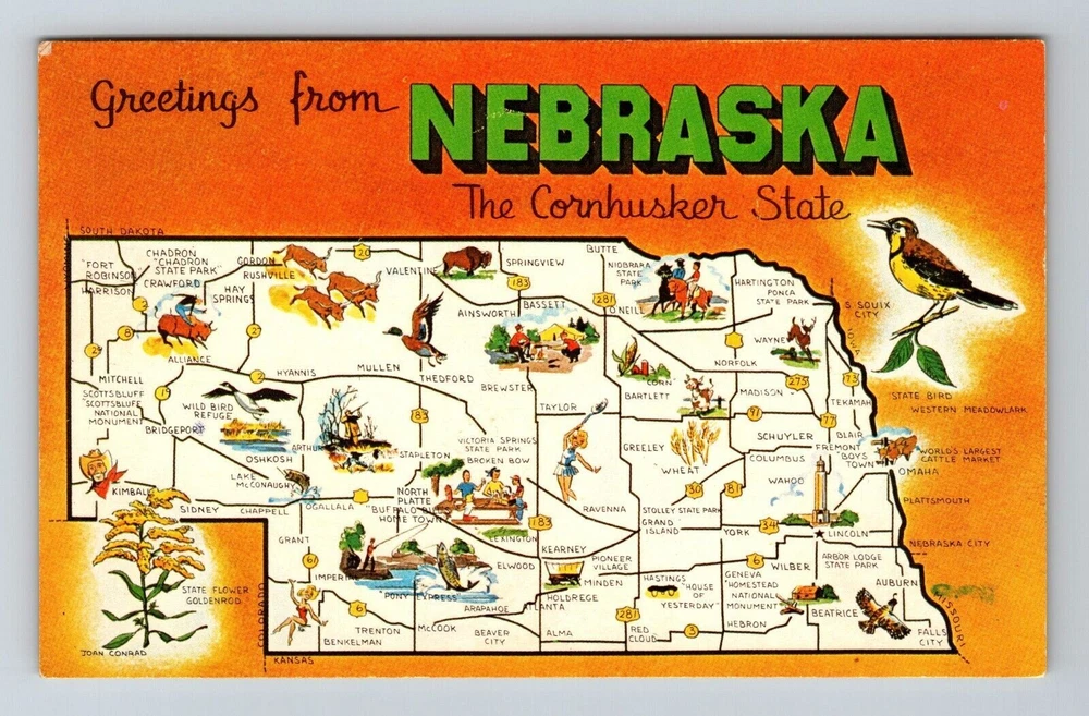 NE-Nebraska, Scenic Map Greetings, Landmarks, Bird, Flower, Vintage Postcard