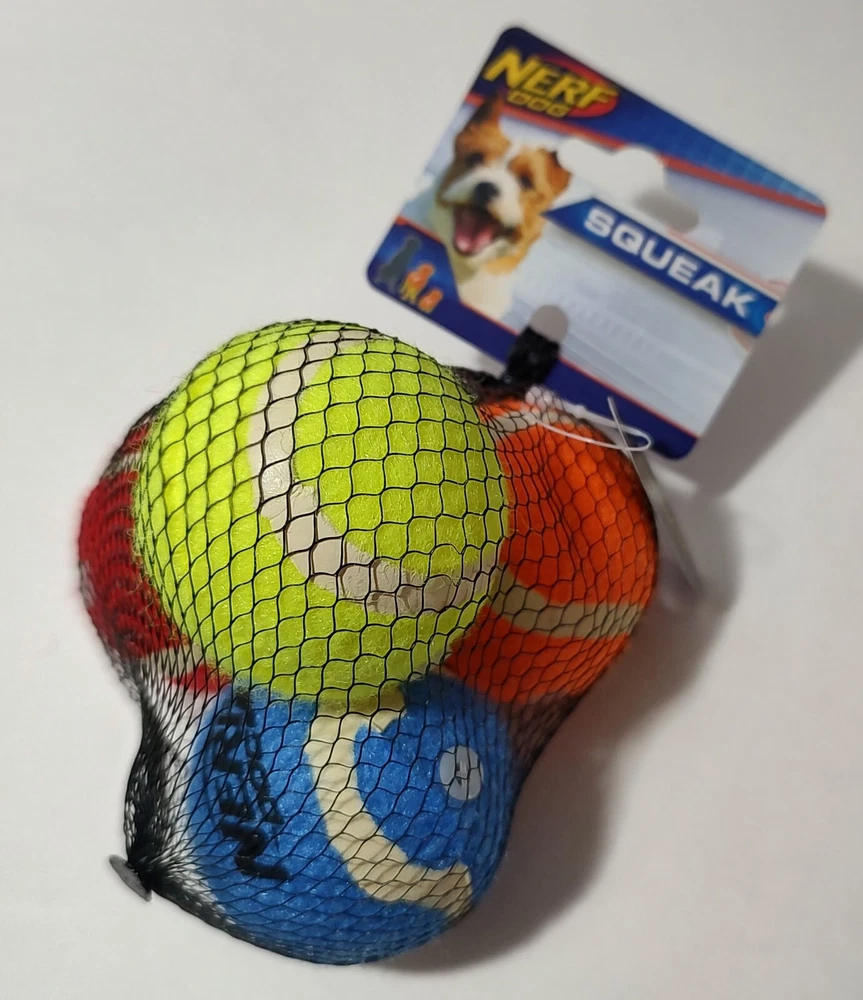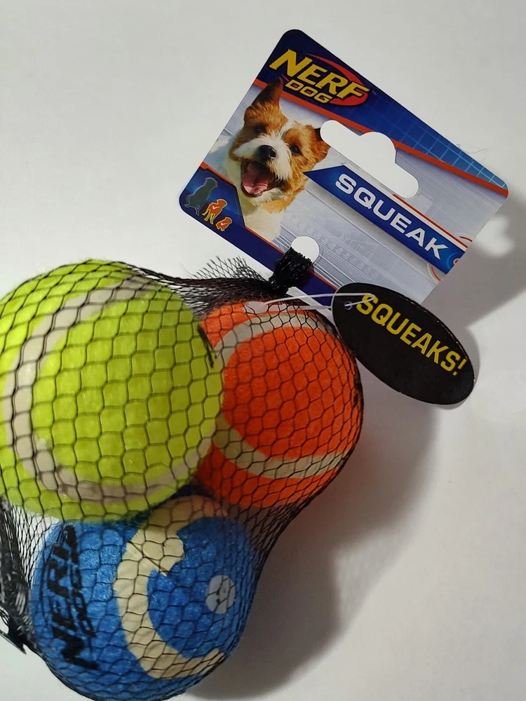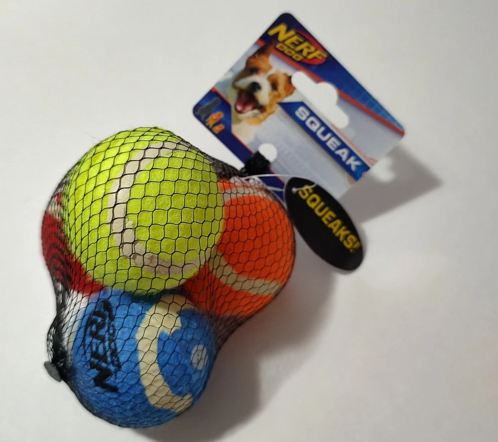 Four mini tennis balls that are different in color, squeaks when chewed, bouncy, new in bag. By HASBRO,, NERF DOG !!
