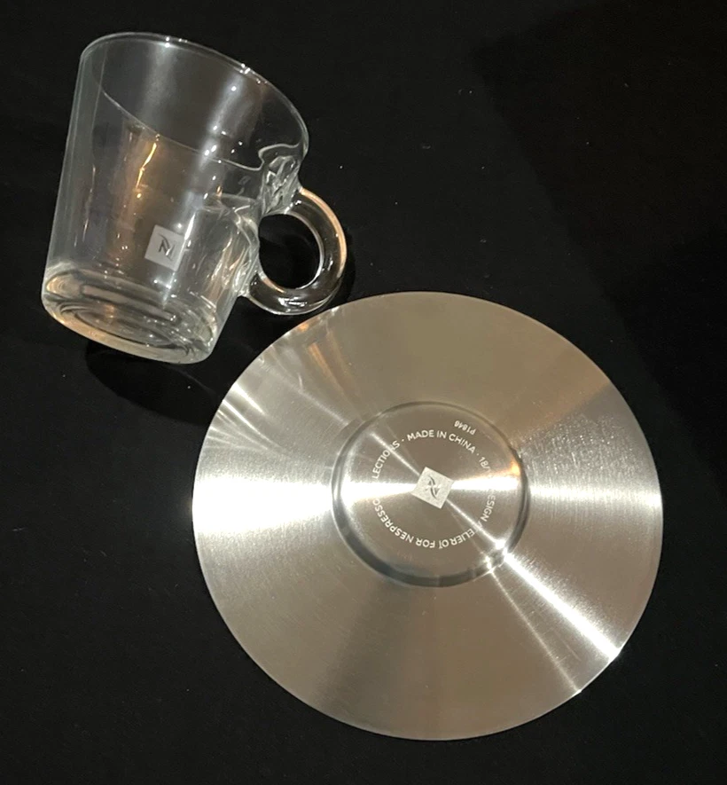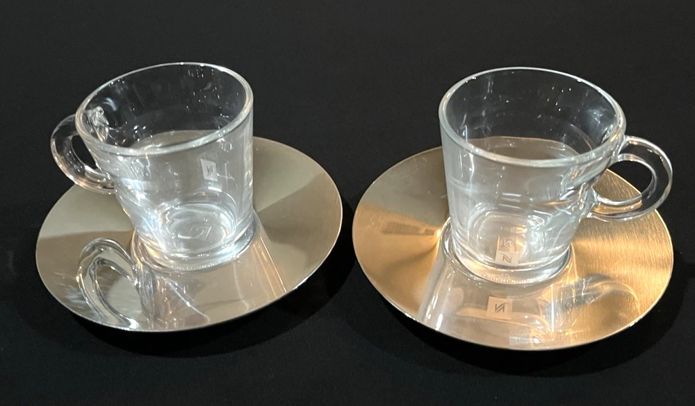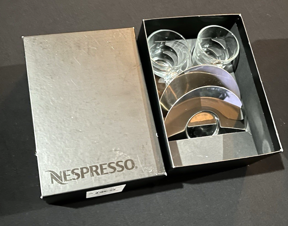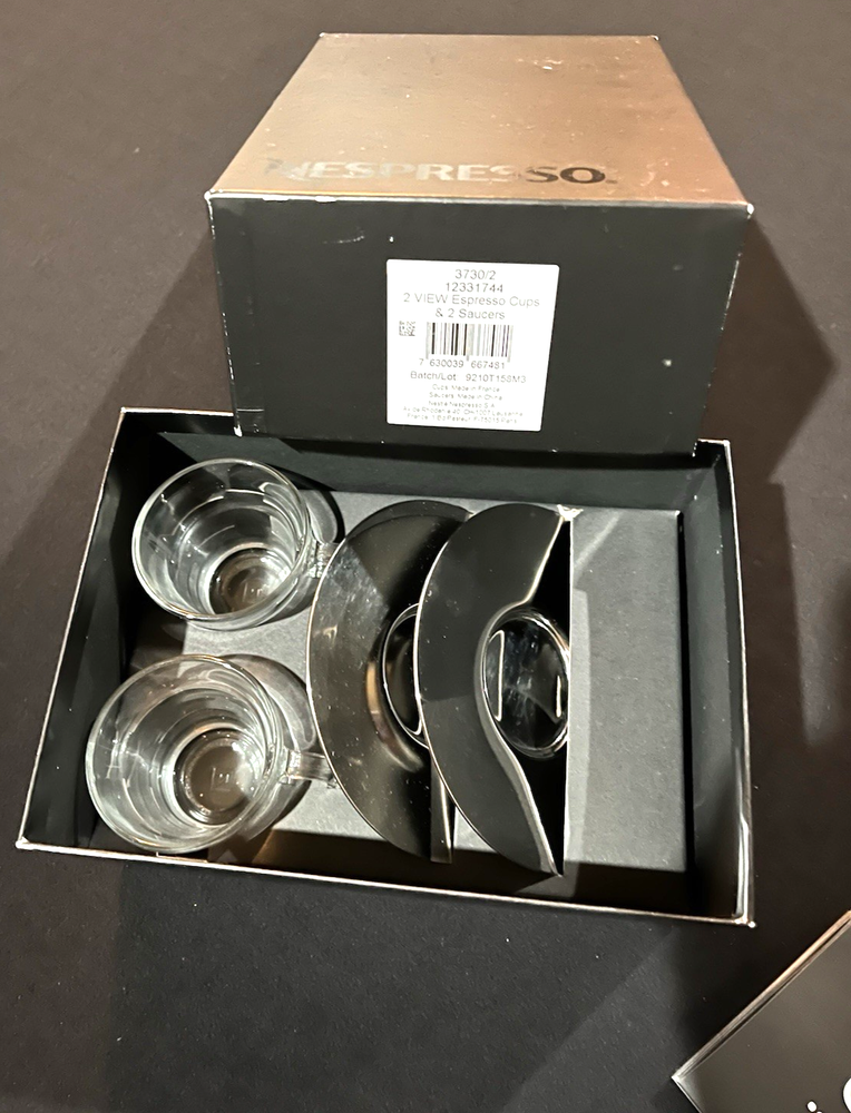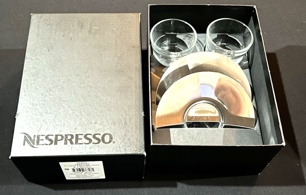 This is a brand new set of Nespresso "View" Atelier design Collection Espresso set. It includes 2 glass cups and 2 stainless saucers. The "View" Collection saucers are made of stainless steel 18/10. The saucers are dishwasher safe but are not suitable for microwave and oven use. The glasses are made of tempered glass and made in France. Saucers are made in China. Cup measures 2.25 inches wide opening. The height is about 2.5 inches. Saucer is about 4-5/8 inches across. Condition is brand new in box as shown. Please note there is handling wear and prints. This set includes the "VIEW" brochure . Box set weighs 1 lb 5.6 oz and measures 7.75 x 5.5 x 3.5 inches. Please check out all photos and read description as all sales are final! No return please! * * * Non-smoking environment! * * *
