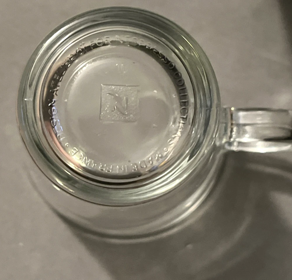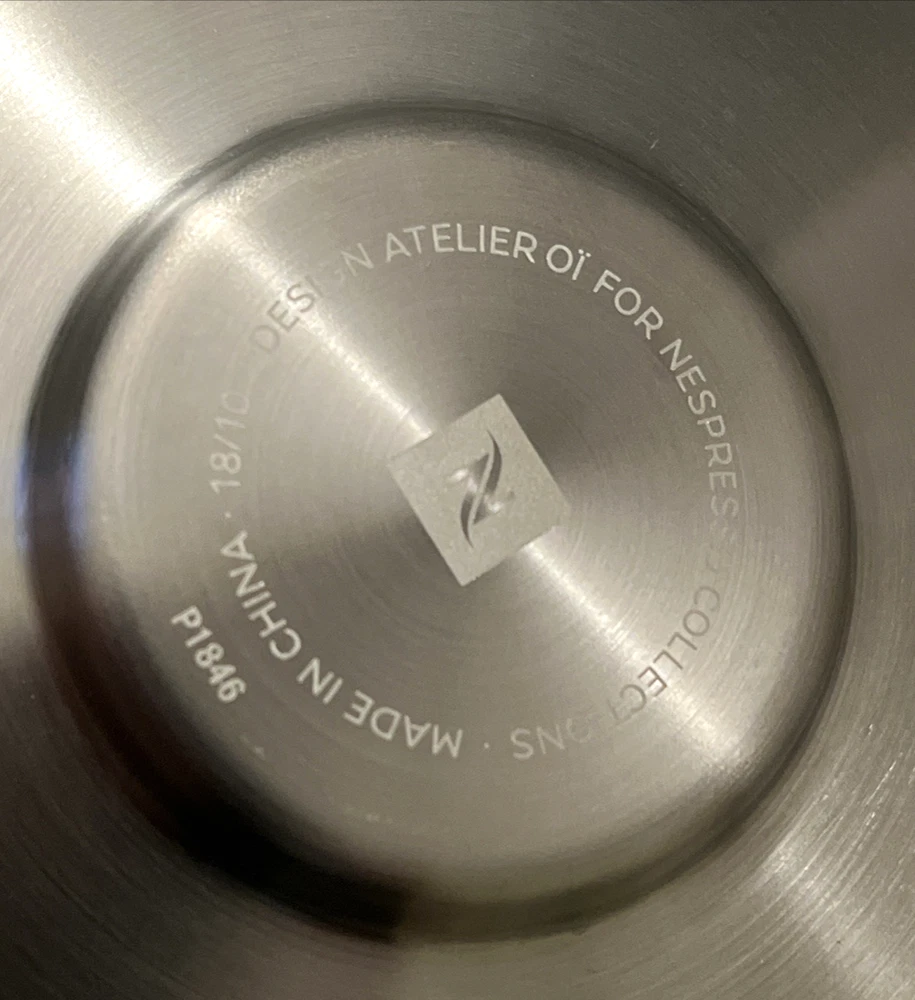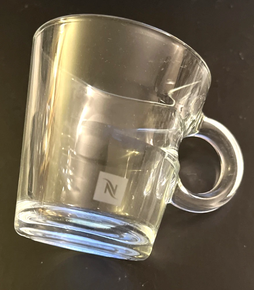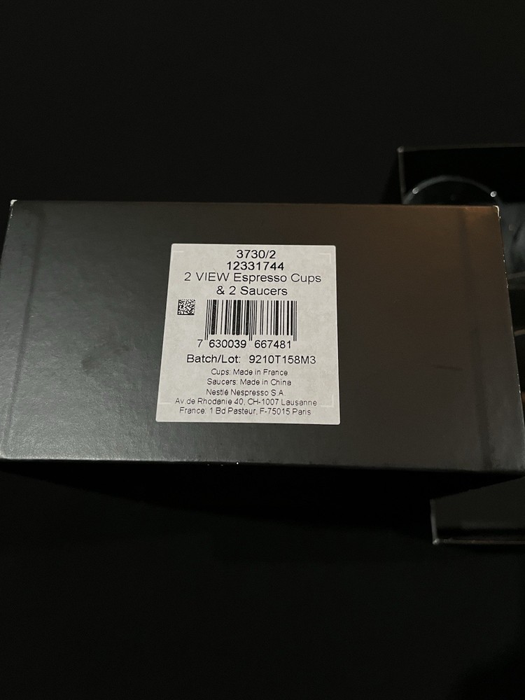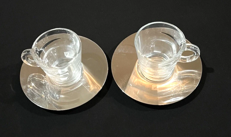 This is a brand new set of Nespresso "View" Atelier design Collection Espresso set. It includes 2 glass cups and 2 stainless saucers. The "View" Collection saucers are made of stainless steel 18/10. The saucers are dishwasher safe but are not suitable for microwave and oven use. The glasses are made of tempered glass and made in France. Saucers are made in China. Cup measures 2.25 inches wide opening. The height is about 2.5 inches. Saucer is about 4-5/8 inches across. Condition is brand new in box as shown. Please note there is handling wear and prints. This set includes the "VIEW" brochure . Box set weighs 1 lb 5.6 oz and measures 7.75 x 5.5 x 3.5 inches. Please check out all photos and read description as all sales are final! No return please! * * * Non-smoking environment! * * *