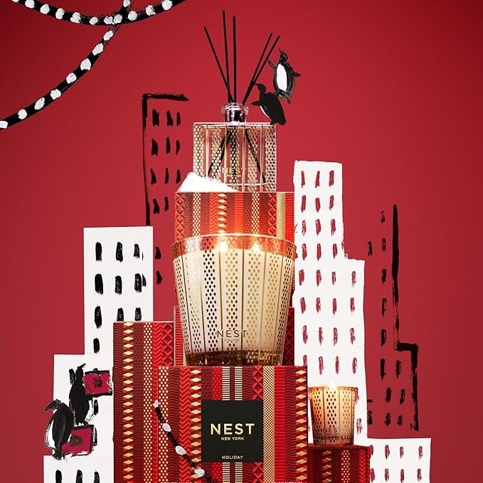 NEST Fragrances Reed Diffuser- Holiday, 5.9 fl oz About this item Product 1: LUXURY OIL DIFFUSER: 5.9-fluid ounce fragrance reed diffuser ideal for home relaxation and ambience Product 1: WARM AND FESTIVE: An inviting blend of pomegranate, mandarin orange, pine, cloves, and cinnamon with a hint of vanilla and amber Product 1: LONG-LASTING ELEGANCE: All-natural diffuser reed sticks and high-quality, alcohol-free fragrance oils release scent for approximately 90 days Product 1: CRUELTY FREE: These richly scented fragrance oils are vegan and made in the USA without animal testing 1 of NEST New York Christmas Reed Diffuser, Holiday - 5.9 fl oz - Fragrance for Up to 90 Days - Reusable, Refillable Glass Holder - Includes 8 All-Natural Reed Sticks - Flame Free REED DIFFUSER - Housed in a reusable, refillable glass vessel, our Reed Diffuser elevates everyday living and entertaining. It includes eight all-natural rattan reed sticks, delivering continuous fragrance, uninterrupted. PERFECT FOR GIFTING - This holiday-inspired scent makes for an unforgettable Christmas gift. CITRUS & WOODY - Pomegranate, mandarin orange, pine, cloves, and cinnamon blend with a hint of vanilla and amber in this sophisticated fragrance, instantly providing the aroma of a sparkling holiday season. CONTINUOUS FRAGRANCE - Expertly crafted with the highest quality fragrance oils, this Reed Diffuser releases an exquisite scent slowly and evenly into the air for approximately 90 days. HOW TO USE - The intensity and reach of the fragrance can be customized based on the number of reeds used. Flip reeds weekly, or more often, to intensify the fragrance experience. CLEAN & CRUELTY FREE - This diffuser is vegan and cruelty free, and free from formaldehyde, parabens, and phthalates. SCENT YOUR WORLD - At NEST New York, mood is elevated and scent is celebrated. Our fragranced home, perfume, and body care collections transform the everyday through scents that transport, inspire, and captivate the senses. 1 of NEST New York Scented Votive Christmas Candle, Holiday - 2 oz - Up to 28-Hour Burn Time - Reusable Glass Vessel LUXURY GLASS CANDLE - Designed to burn cleanly and infuse your home with exceptional scent, this candle elevates everyday living and entertaining. It is housed in a glass vessel etched with a festive gold pattern that complements any holiday decor. PERFECT FOR GIFTING - This holiday-inspired scent makes for an unforgettable Christmas gift. CITRUS & WOODY - Pomegranate, mandarin orange, pine, cloves, and cinnamon blend with a hint of vanilla and amber in this sophisticated fragrance, instantly providing the aroma of a sparkling holiday season. . CRUELTY FREE - This decorative scented candle is vegan and made in the USA without animal testing. SCENT YOUR WORLD - NEST New York’s fragranced home, perfume, and body care collections transform the everyday by artfully blending notes of the familiar, the exotic, and the unexpected for a fragrance experience like no other. Product Description NEST Fragrances Reed Diffuser- Holiday , 5.9 fl oz Enjoy exquisite, uninterrupted home fragrance for up to 90 days with the NEST New York Holiday Reed Diffuser. Expertly crafted in the USA with the highest quality alcohol-free fragrance oils, this reed diffuser is housed in a glass vessel adorned with elegant gold patterning that effortlessly complements any holiday décor. Pomegranate, mandarin orange, pine, cloves, and cinnamon blend with a hint of vanilla and amber in this sophisticated fragrance, instantly providing the aroma of a sparkling holiday season. The glass vessel measures 3.75 inches wide, 4.5 inches high, and 2 inches deep. Eight all-natural rattan reed sticks and 5.9 fluid ounces of oil are included. The intensity and reach of the fragrance can be customized based on the number of reed sticks used. As part of an ongoing commitment to cruelty-free practices, NEST New York has been certified by PETA, a leading organization that certifies brands that operate without animal testing. NEST New York is moving toward a more sustainable future with cartons made from sustainably sourced materials. NEST New York’s fragranced home, perfume, and body care collections transform the everyday by artfully blending notes of the familiar, the exotic, and the unexpected for a fragrance experience like no other. Let NEST New York scent your world.