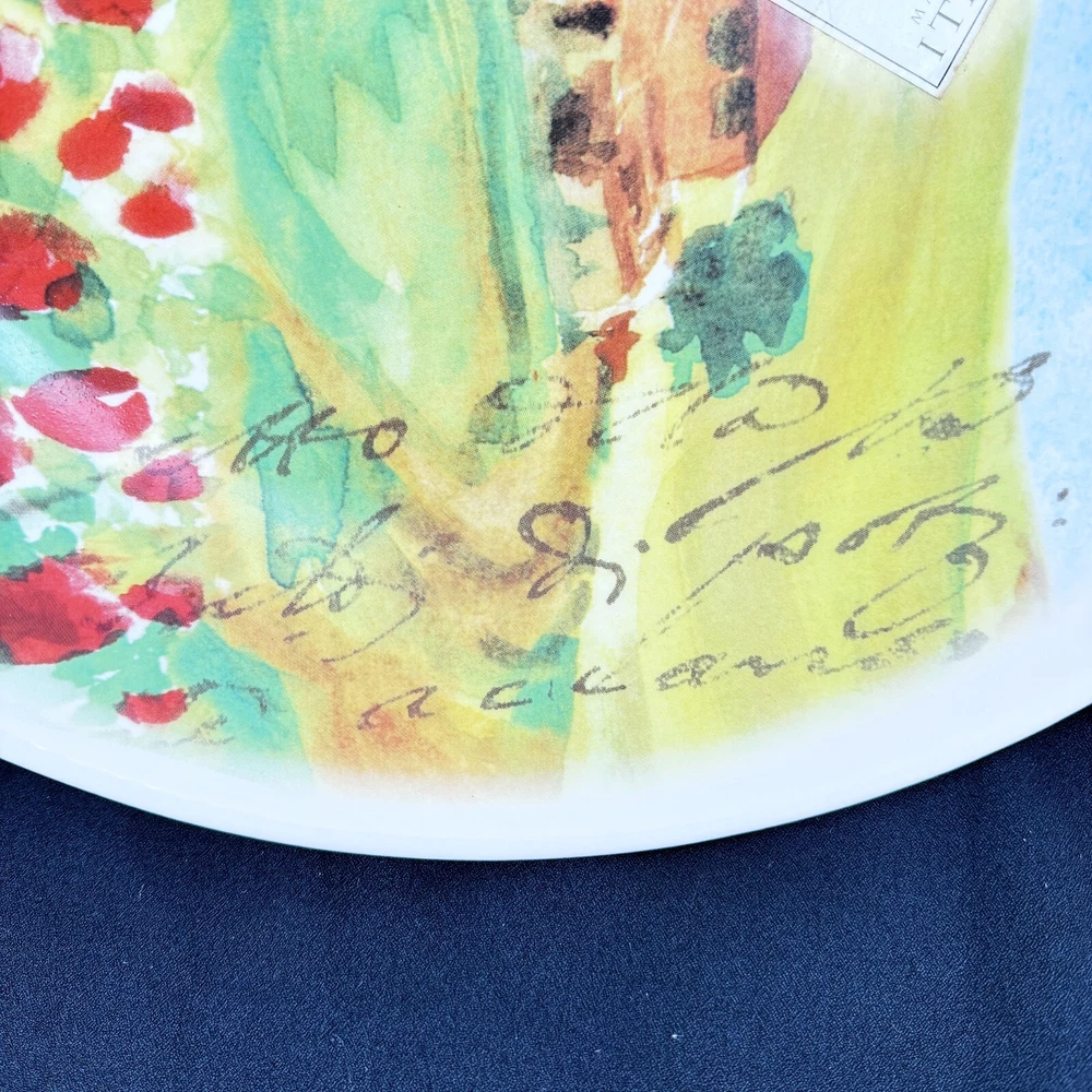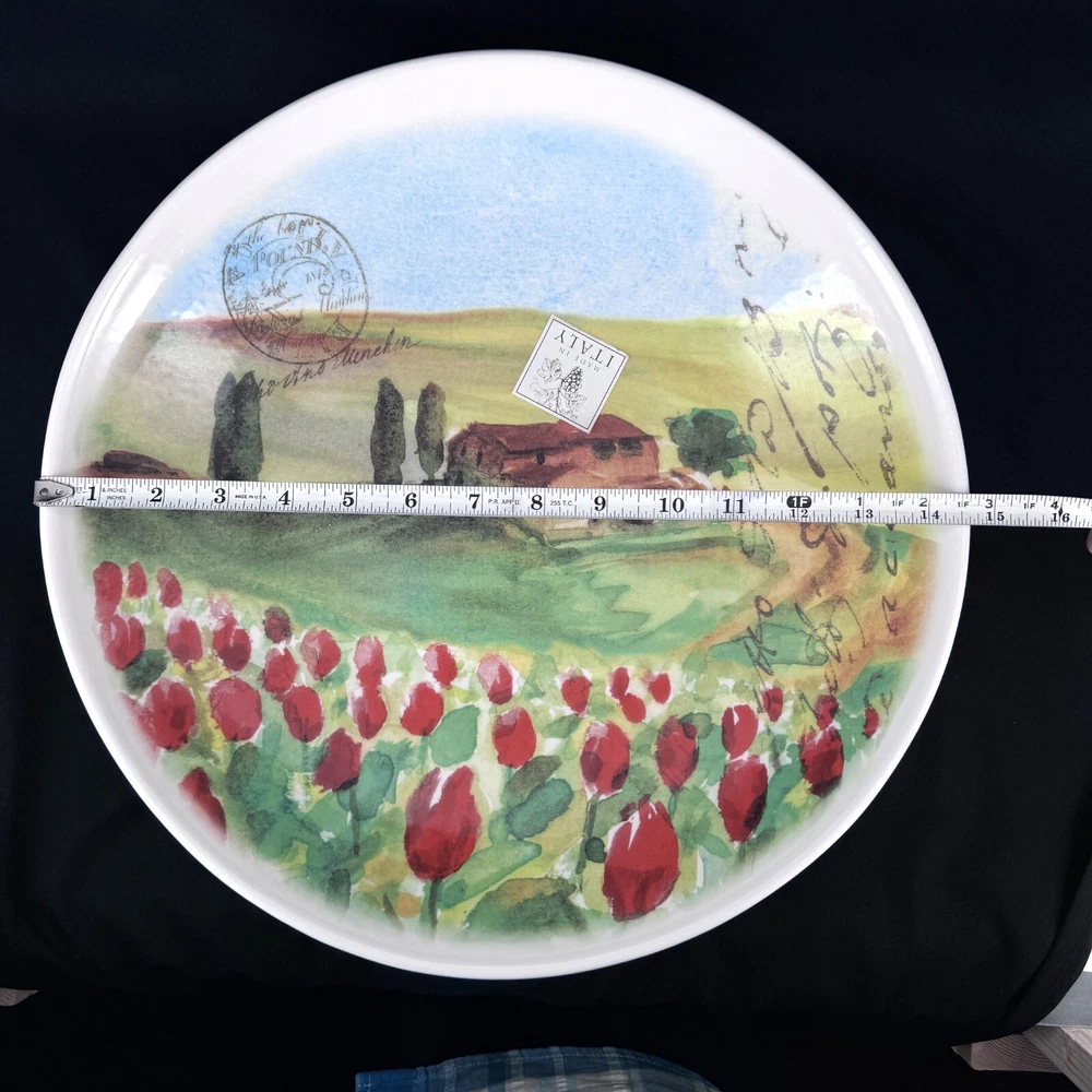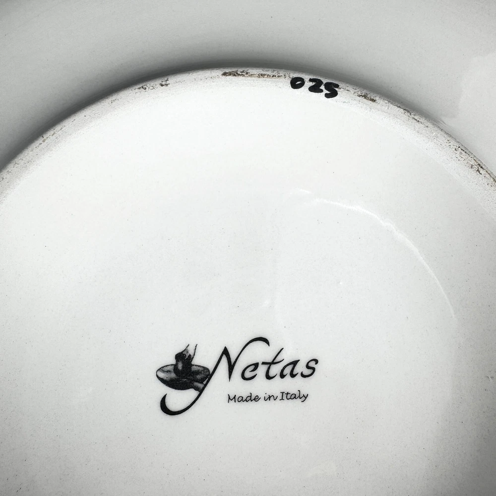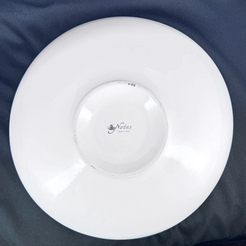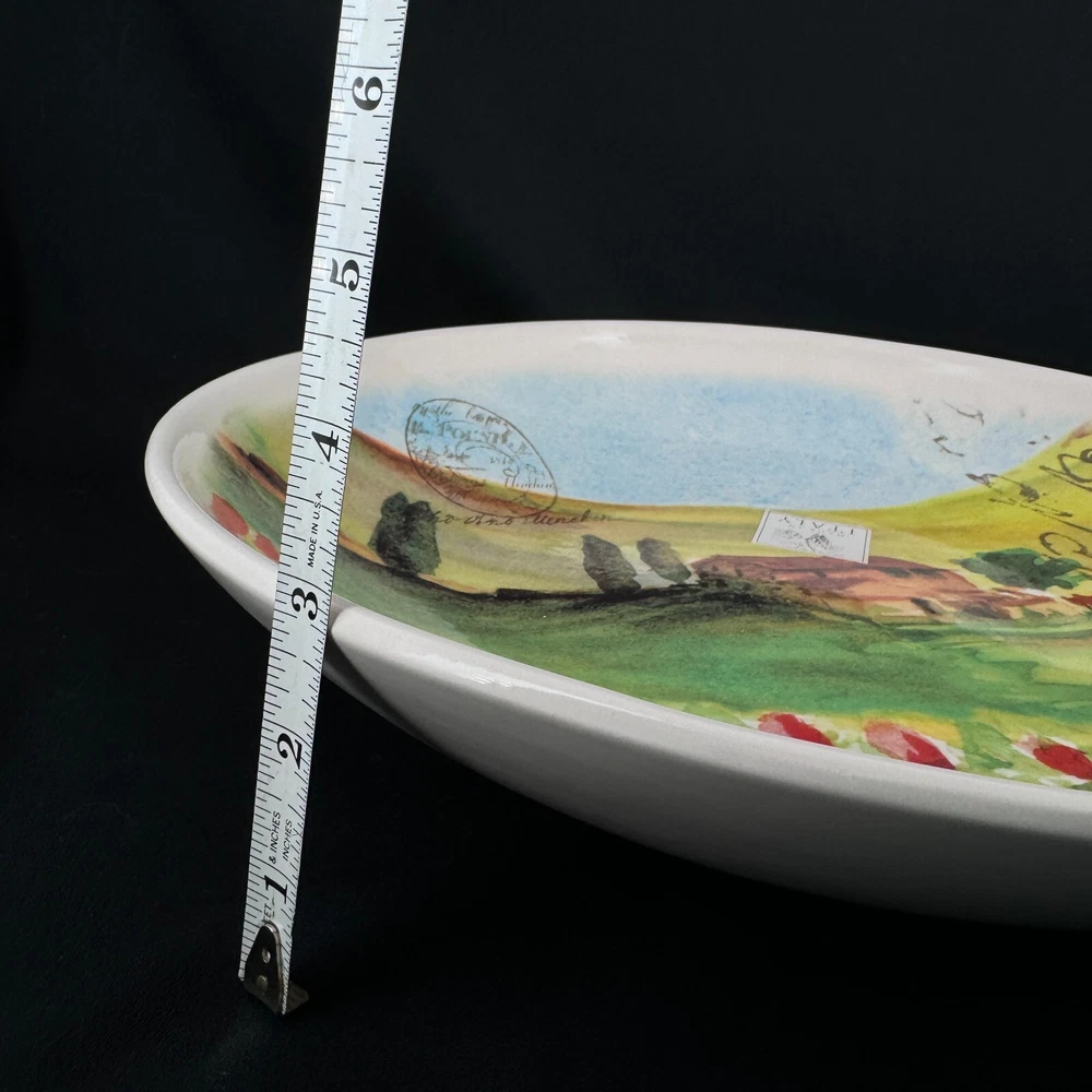 Care Instructions: Hand Wash Only Material: Ceramic Brand: Netas Backstamp: Printed Shape: Round Item Diameter: 14.5 inch Type: Serving Bowl Item Height: 2.75 inch Country/Region of Manufacture: Italy Color: Multicolor Pattern: Tuscany Theme: Tuscany Countryside w Flowers Production Style: Art Pottery Item Weight: 4 lb Features: Hand Painted Seller Notes: “Excellent condition with no cracks, chips or crazing.”