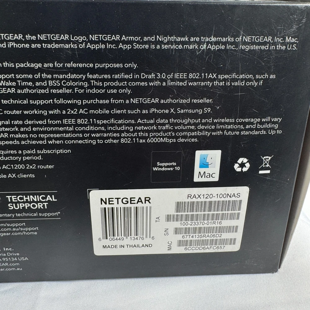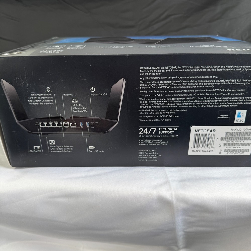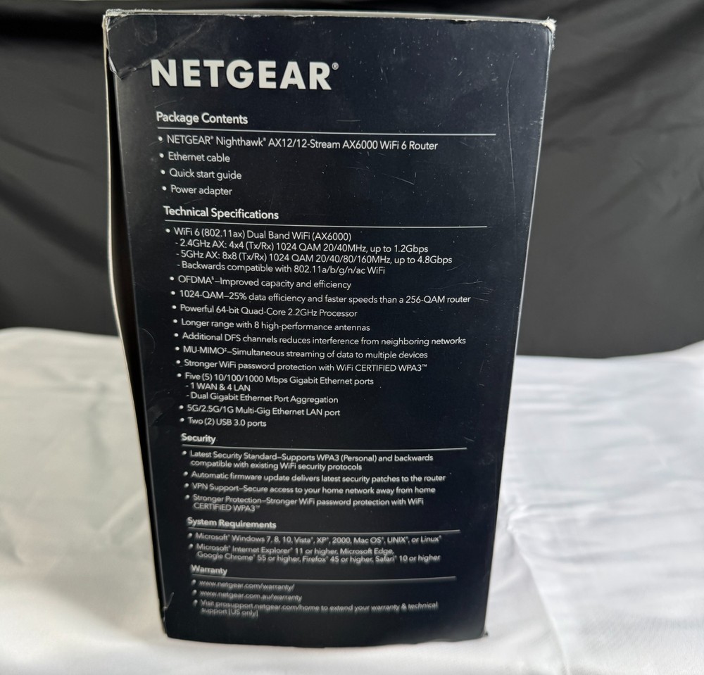 NETGEAR Nighthawk AX12 (RAX120-100NAS) WiFi 6 (802.11ax) router — open box, tested and works . Includes items shown in photos (router, power adapter, Ethernet cable, quick start materials). Cosmetic condition: light handling/storage wear to box; router looks clean. Great for high-speed WiFi, streaming, gaming, and multiple devices.