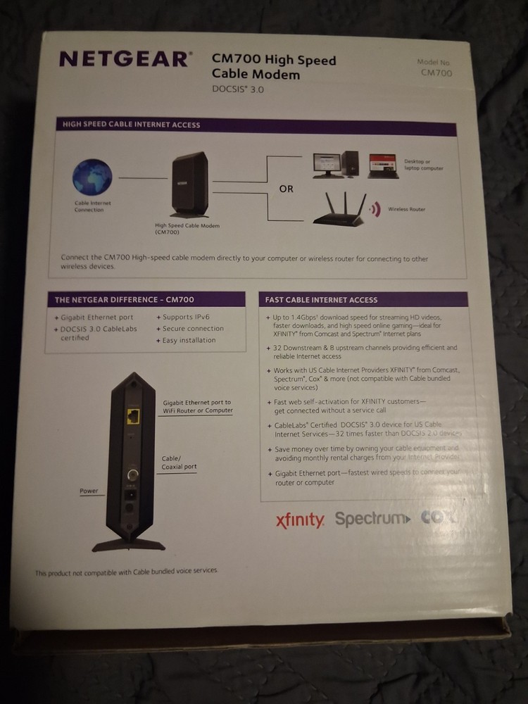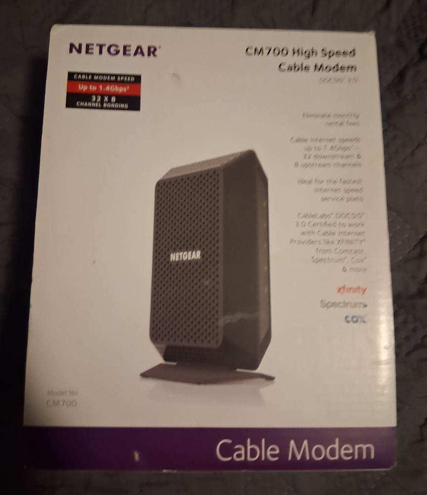 NETGEAR Nighthawk X6 R8000 Tri-Band Router & CM700 Modem (Complete In Box) Bundle Item Description Stop paying monthly equipment rental fees and take control of your home network. This high-performance Netgear bundle provides everything you need to establish a fast, reliable internet connection optimized for heavy-duty 4K streaming, multiplayer gaming, and multi-device smart homes. What’s Included in the Bundle: NETGEAR Cable Modem CM700 (DOCSIS 3.0) - Complete in Box: Built for high-speed cable internet plans with 32x8 channel bonding. Comes in its original retail box with the protective molded inserts, quick start guide, original yellow ethernet cable, and factory power adapter. Compatible with major US cable providers including Xfinity, Spectrum, and Cox (Note: please verify compatibility with your specific ISP tier prior to purchase). NETGEAR Nighthawk X6 AC3200 Tri-Band WiFi Router (Model R8000): Features Tri-Band WiFi technology with smart connect to automatically assign devices to the fastest available band. Includes 6 high-performance antennas for maximum coverage. Includes the original heavy-duty factory power adapter. Condition Disclaimer: Both devices are previously owned, fully functional, and ready to set up. The CM700 modem has been meticulously kept and includes all original retail packaging. The R8000 router exhibits normal signs of cosmetic wear from standard household use, including minor surface scuffs and visible dust within the ventilation grills. Please review all photos carefully, as they represent the exact items you will receive. Shipping: Fast and secure delivery via USPS Ground Advantage (Buyer Calculated). The items will be carefully packaged together to ensure they arrive safely to your door. Keywords: Netgear Nighthawk, X6, R8000, AC3200, Tri-Band Router, Gigabit Ethernet, Gaming Router, Smart Home WiFi, Netgear CM700 CIB, Cable Modem Complete in Box, DOCSIS 3.0, 32x8 Channel Bonding, Xfinity compatible modem, Spectrum approved, Cox internet, network bundle, replace ISP rental, high speed internet, WiFi 5.