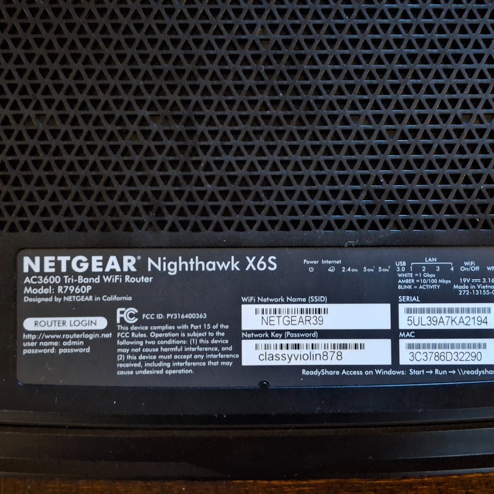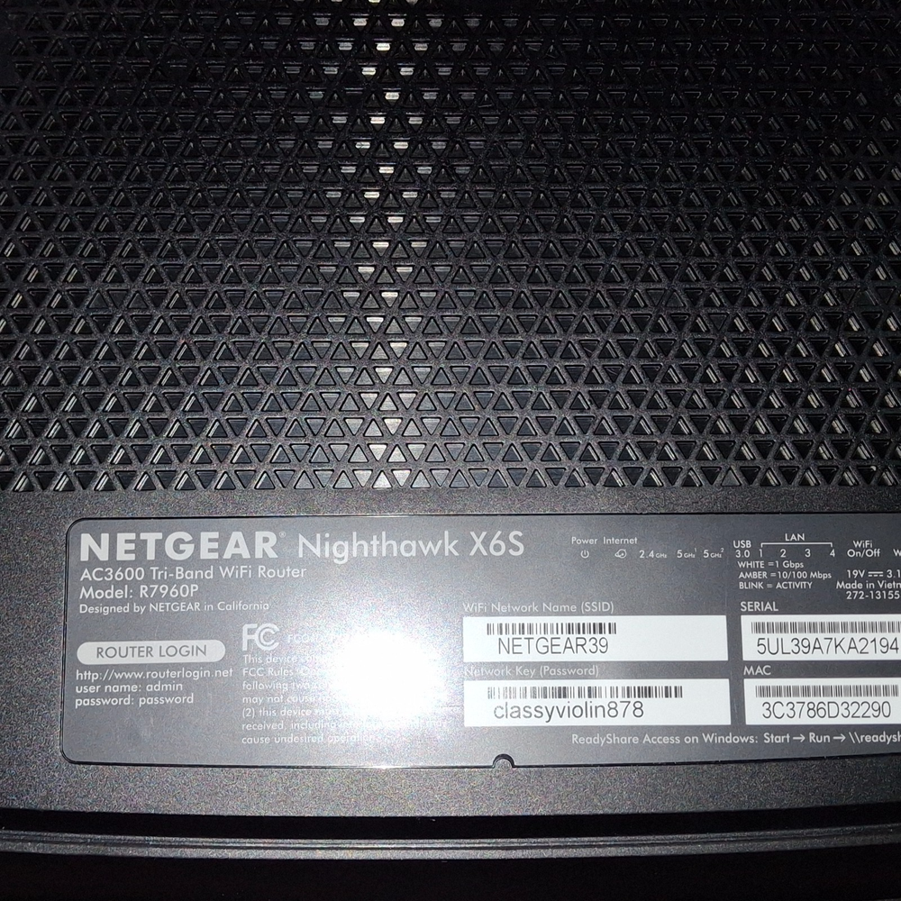 Model:NETGEAR R7960P-100NAS Nighthawk X6S AC3600Maximum LAN Data Rate:1000 MbpsType:RouterFeatures:Tri-BandBrand:NETGEARColor:BlackMaximum Wireless Data Rate:1300 MbpsSeller Notes:“lightly used, bench tested and 100% working .. router only ... powers on !!”UPC:Does not applygtin13:Does not applyCountry of Origin:VietnamMPN:R7960PConnectivity:WirelessNumber of LAN Ports:4To Fit:PCPorts:Ethernet (RJ-45), USB 3.0