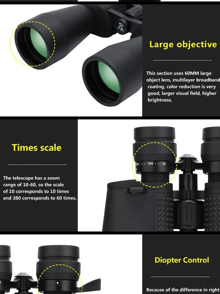 Introduction Magnification: 10-180x Objective Lens Diameter: 50mm (Broadband green or blue mode) Eyepiece Diameter: 17mm Field of view: 235FT/1000YDS; 78M/1000M Advantage: Waterproof: Lens barrel filling the high-purity nitrogen, waterproof and mouldproof, will not be affected by daily use in the rain or with damp. The internal and external material: Metal lens barrel, rubber outsourcing, exquisite and comfortable feeling, elegant appearance, fine workmanship, convenient to use Focusing type: Central Axial plus right eyepiece fine-tuning, can focus focal distance Coating: Several layers of vacuum high light transmittance green film, powerful light transmittance performance and high definition Application: bird appreciation, watching sports game or the concert, outdoor travelling, enjoying the prospect etc Telescope Maintenance Method: After purchasing a telescope, you must pay attention when using it: Its storage place must be dry, since the film is easy to fall off and the prisma may be fogging or mouldy fter long-term becoming damp. When using, if it is found that there is some dirt or traces on the lens, DO NOT swab with water! The best way is to use swab at home (cotton swab) and dip it in some alcohol or gasoline, wipe gently. Better not to use lens wiping cloth to dry clean, it is easy to scratch the lens surface. Note: This binoculars are light enhancing or glimmering Night Vision,it will not work in full dark environment. Product Size: 190*185*55mm Package includes: 1Pc x Telescope 1Pc x Telescope Bag 1Pc x Strap(Length is about 93cm) 1Pc x Lens Cleaning Cloth(9.5*9.5cm) 2Pc x Lens Cap 2Pc x Eyepiece Cap 1Pc x User Manual