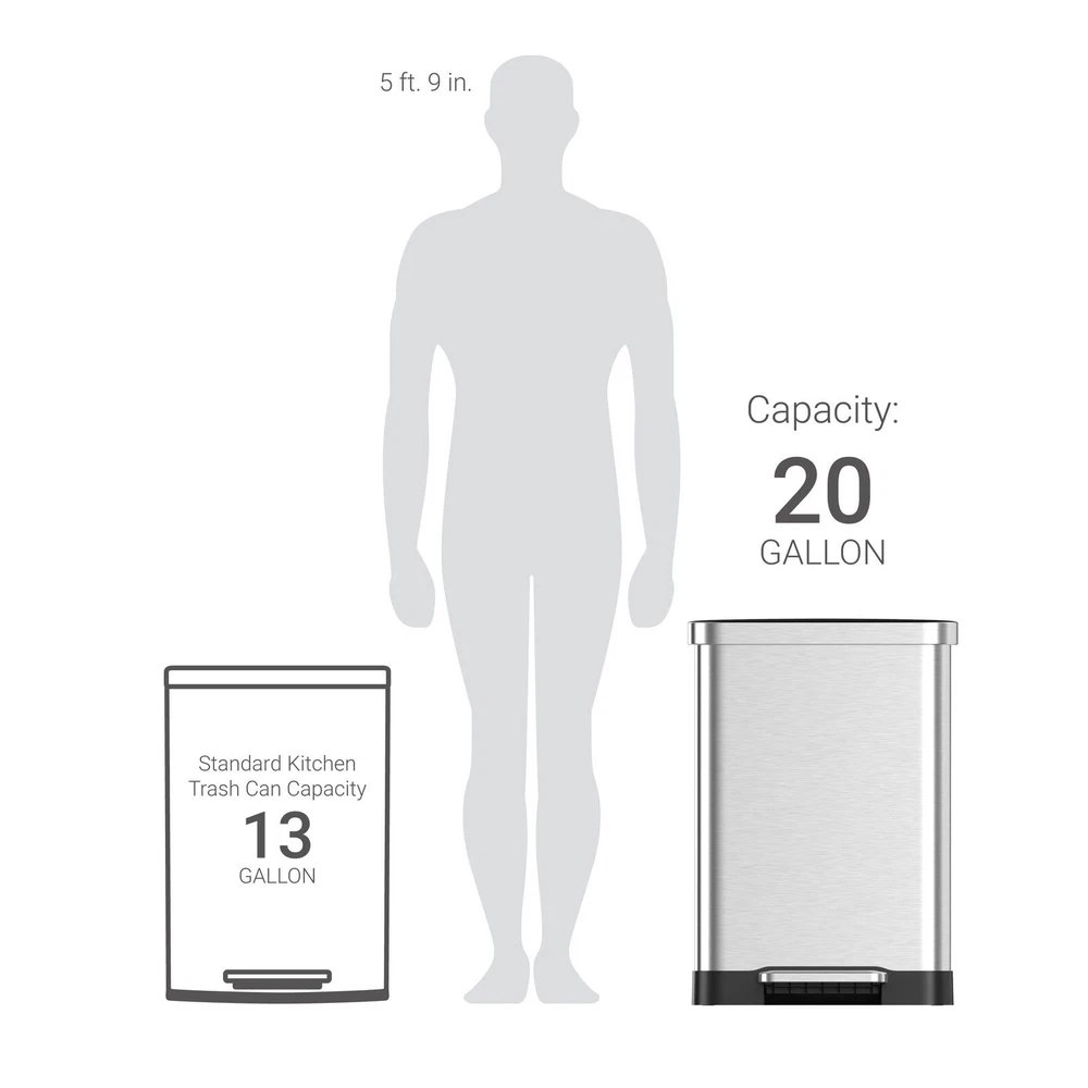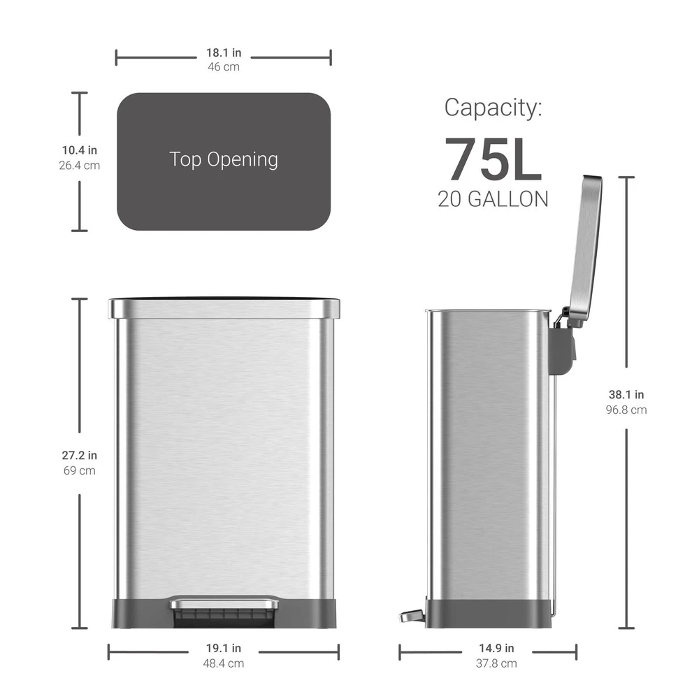 Introducing the Qualiazero 20-Gallon Stainless Steel Trash Can - the perfect solution for your kitchen waste management needs. This sleek and modern trash can features a soft-close lid that closes quietly without slamming, making it a great choice for households with children or pets. The fingerprint-proof commercial stainless steel surface stays clean longer and is easy to maintain, ensuring your kitchen remains looking its best. The sturdy foot pedal allows for hands-free operation, making it convenient for you to dispose of your waste. For regular cleaning, simply use a damp microfiber cloth. The non-skid base keeps the trash can in place, even when the lid is opened, ensuring that it won't tip over or move around. With a 20-gallon / 75L capacity, this trash can is ideal for busy kitchens and families. For a perfect fit, use Qualiazero 21-Gallon trash bags, specially designed to fit this trash can. Invest in the Qualiazero 20-Gallon Stainless Steel Trash Can today and enjoy a cleaner, quieter and more convenient kitchen waste management solution. Soft-close lid closes quietly without slamming Fingerprint proof commercial stainless steel stays clean longer Sturdy foot pedal keeps your hands free For regular cleaning, use a damp microfiber cloth Non skid base keeps your trash can in place 20GAL / 75L Ideal for Kitchen For a perfect fit, use our Qualiazero 21 Gallon trash bags On Nov 25, 2024 at 19:52:54 PST, seller added the following information: