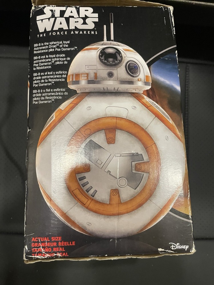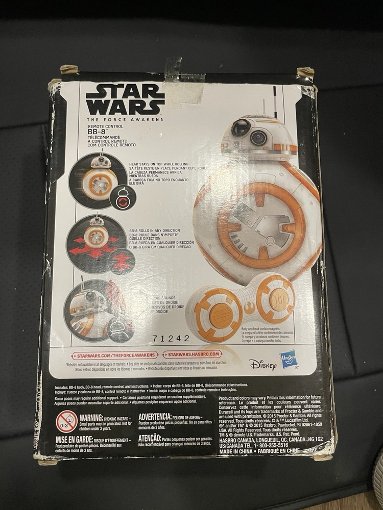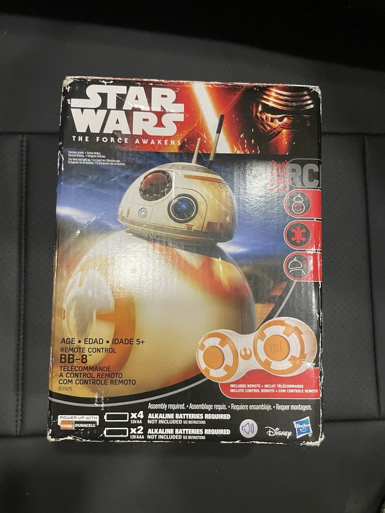 The product is a 2015 Star Wars BB-8 remote control, featuring the character from the movie Star Wars: The Force Awakens. Toy is still in sealed factory plastic . Produced by Hasbro, this officially licensed collectible is a must-have for Star Wars fans. With its intricate design and attention to detail, this BB-8 remote control is a unique and sought-after piece for any collector of Star Wars memorabilia. Whether for display or practical use, this item is sure to delight fans of the iconic franchise.