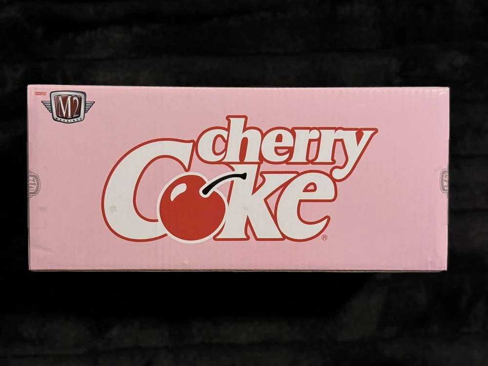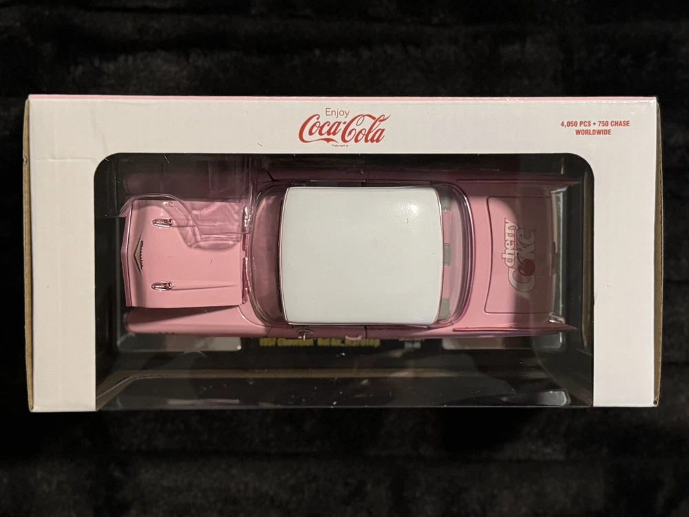 The product is a special edition 1:24 scale diecast model of a 1957 Chevrolet Bel Air Hardtop from the M2 Machines Coca-Cola Edition series. This particular version is a pink chase variant with Cherry Coke branding, part of the M2 Machines Coca-Cola Chase Edition theme. It is a limited edition release for the year 2024, featuring unique packaging and including a stand for display. With only 750 units produced, this model is a sought-after collectible for fans of diecast vehicles and Coca-Cola memorabilia.