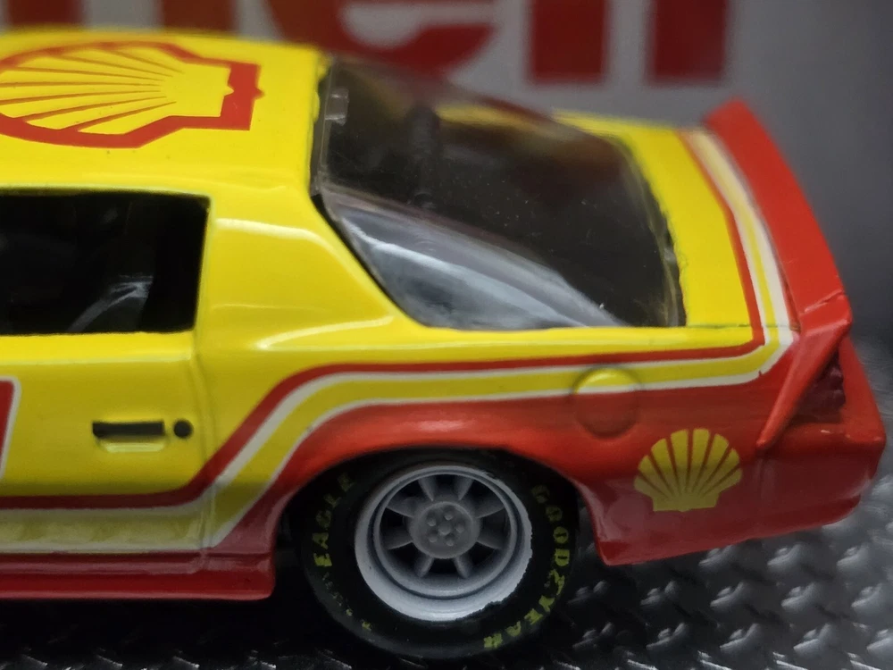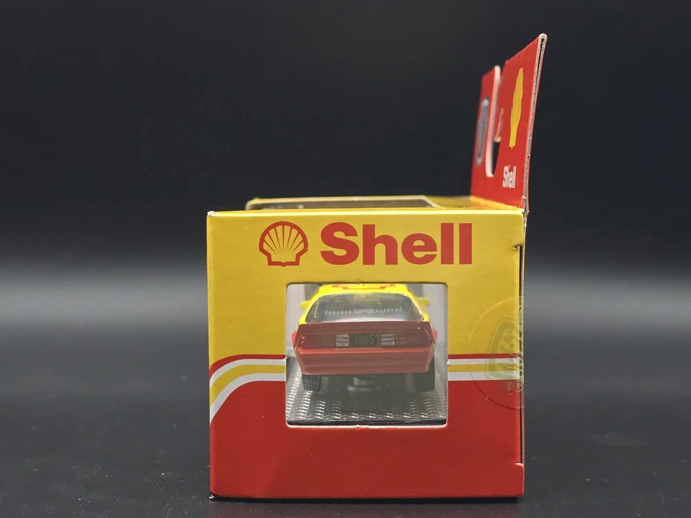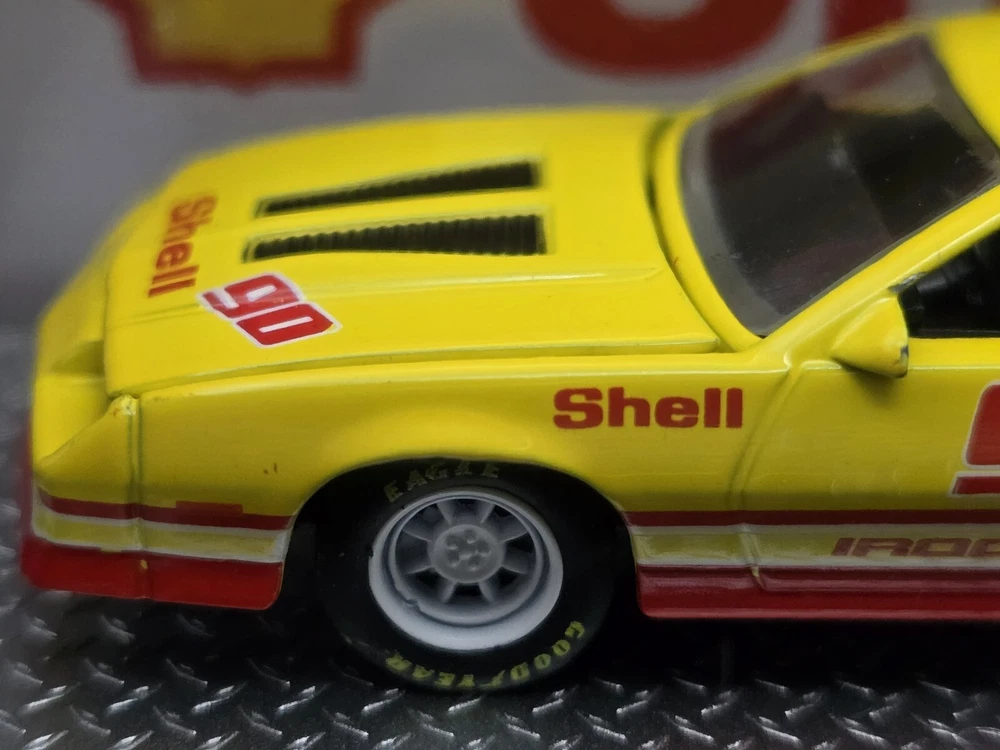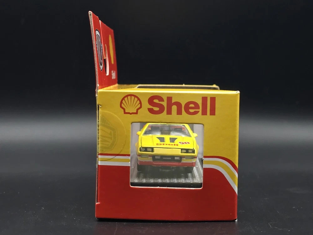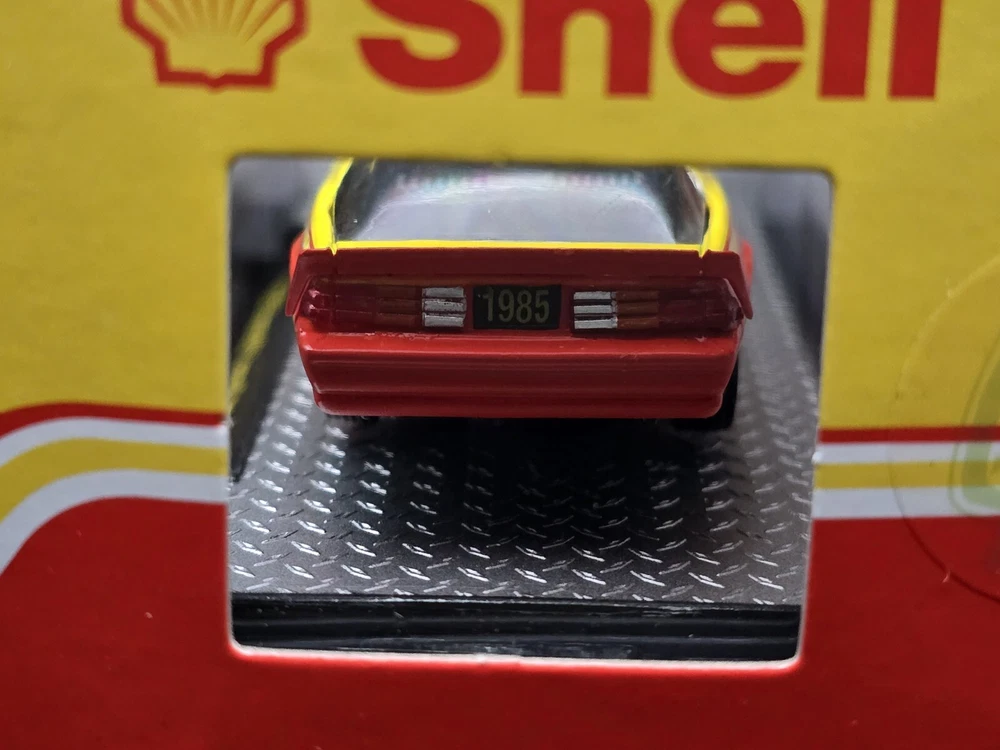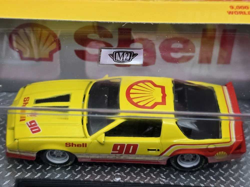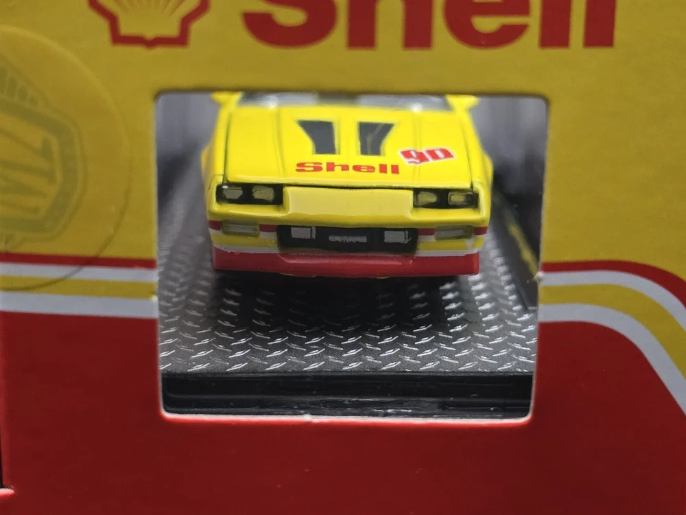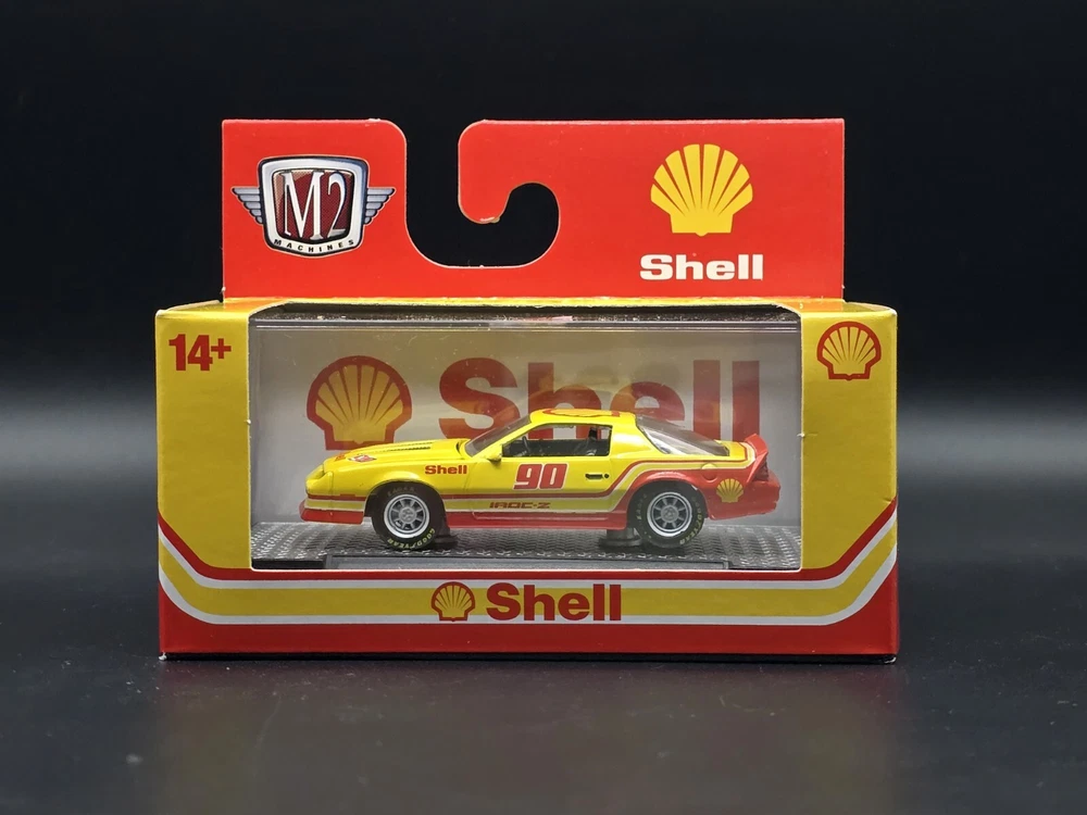 This is a new 1:64 scale diecast Chevrolet Camaro IROC-Z model from the 2024 M2 Machines R84 series. The car is multi-color and features a SHELL theme, with advertising specimen details. It comes with a case, stand, and an unopened box, making it a collectible piece.