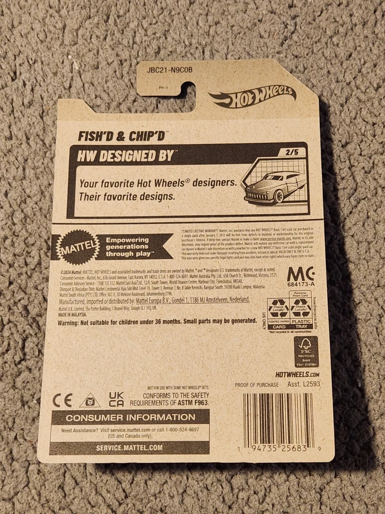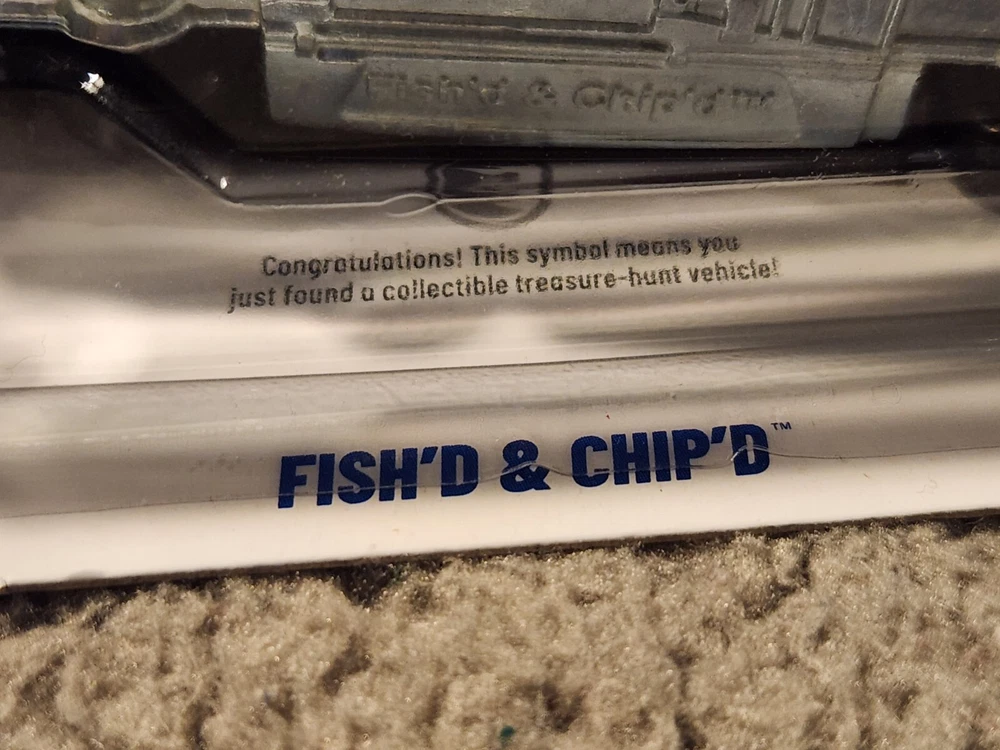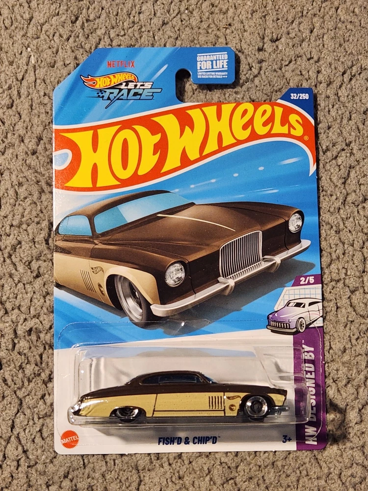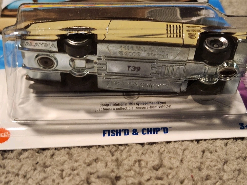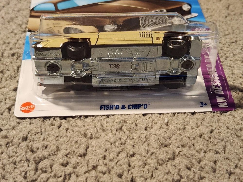 The product is a Hot Wheels Treasure Hunt car from the HW Designed By series, specifically the *FISH'D & CHIP'D model. It is in 1:64 scale and recommended for ages 3 and up. The car is part of the 2025 Hot Wheels collection and is numbered 32 out of 250 in the series. 2 available 1 labeled t38 1 labeled t39.