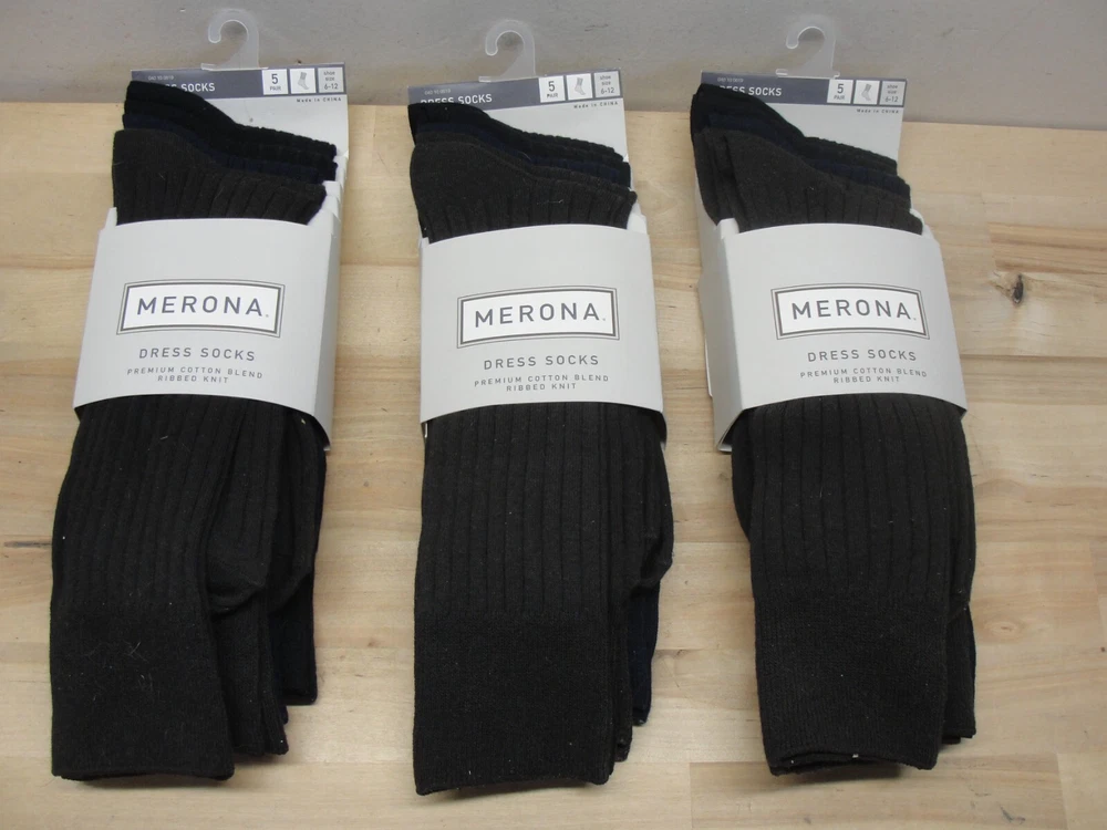 This is a new lot of three Merona men's assorted color dress socks size 6-12. There are 5 pairs per package . Thanks for looking...