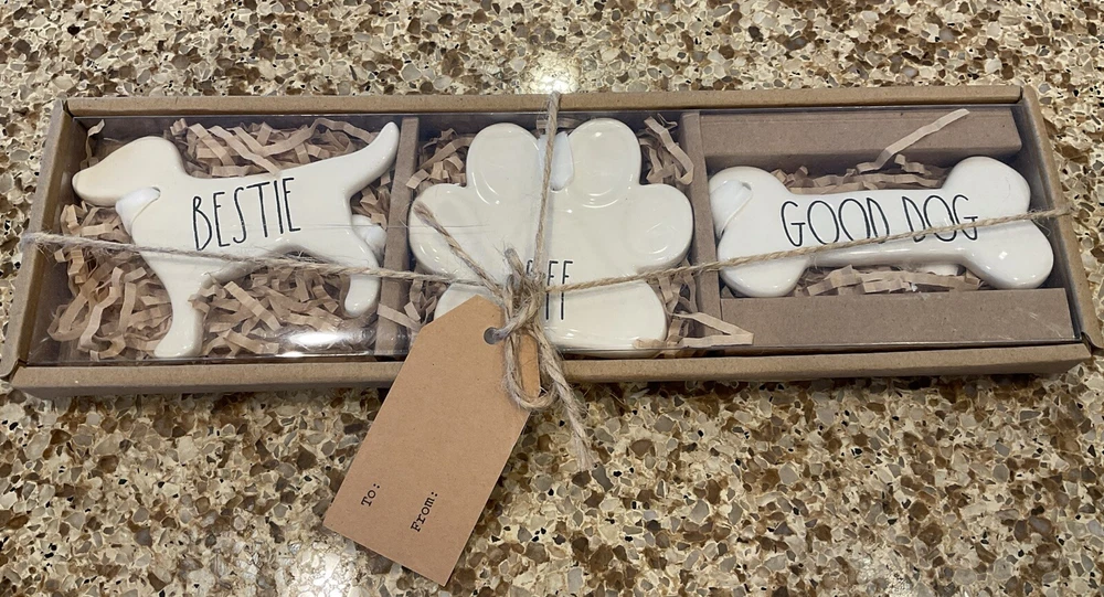 This Rae Dunn ornaments are the perfect addition to any dog lover's collection. The ornaments features cute and playful designs with a dog-shaped body, a paw and dog bone! They are made of high-quality materials to ensure durability and longevity, so you can enjoy it for years to come. The ornaments are ideal for decorating your home or office, and it makes a great gift for anyone who loves dogs. Whether you're a collector or just looking for a unique decorative piece, this Rae Dunn ornament is sure to add a touch of whimsy to any space. The ornaments are about 4 inches in length, RAE DUNN MAGENTA.