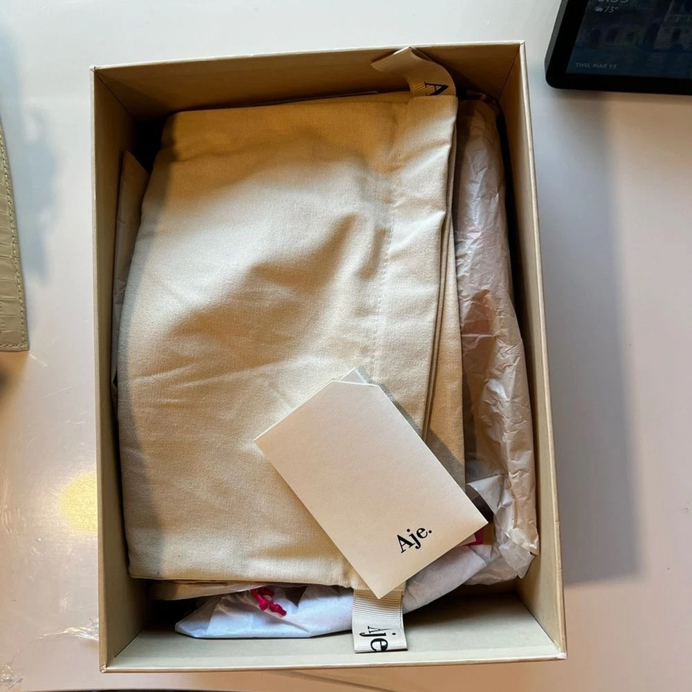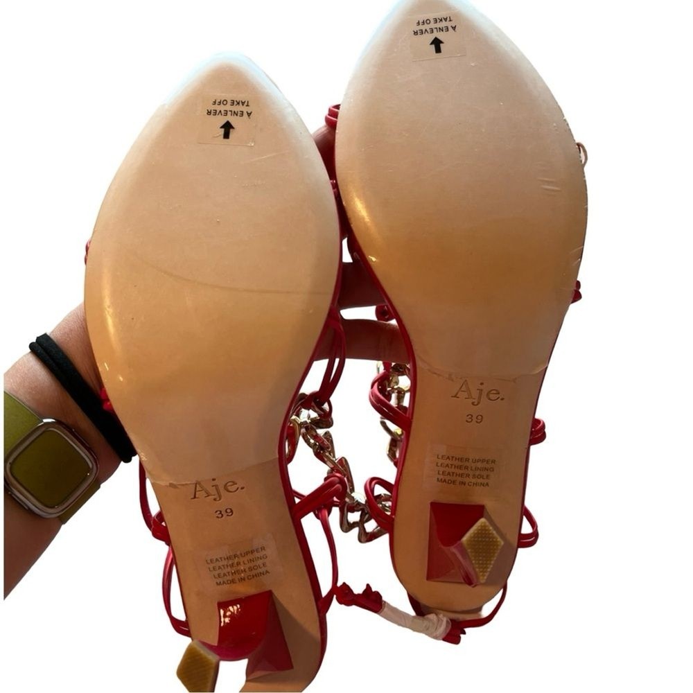 NEW AJE Astrid Chain-embellished Leather Sandals In Fuchsia Sz 39 Chain-embellished Open pointed toe Sculptural heel Ties at ankle Leather sole Imported Includes box, certificate of authenticity and dust bag. Designer size 39 = US 9